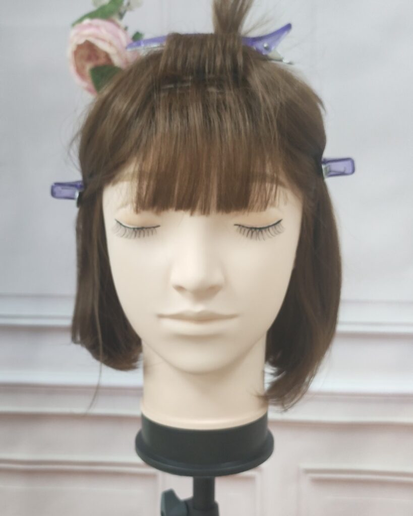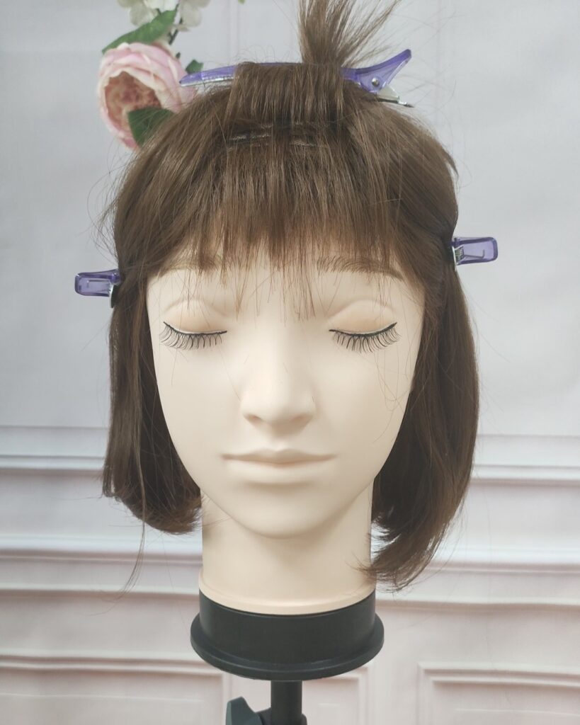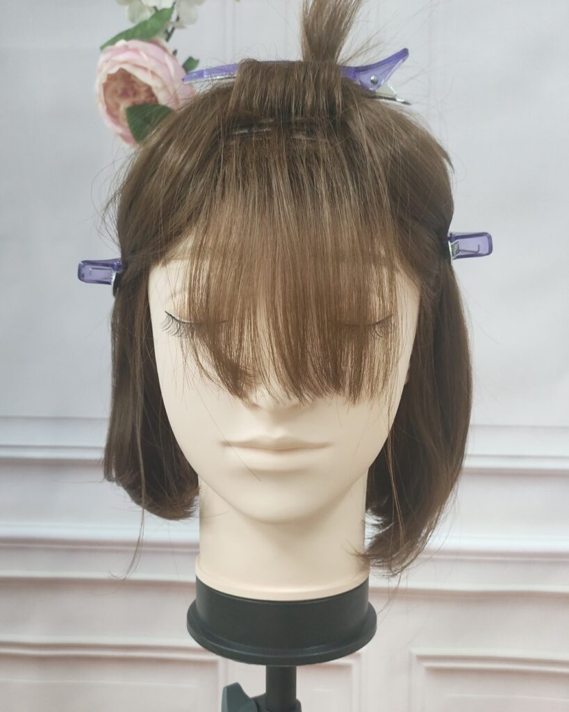 ウィッグの製造上、前髪部分は毛が生えている層が段々となっているので、だいたい半分で上と下にわけて上部分をクリップでとめておきます。
