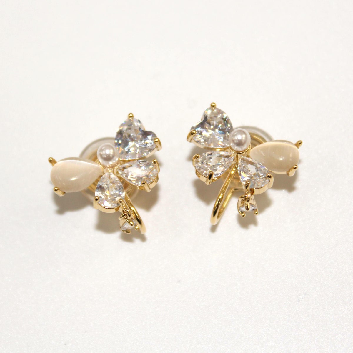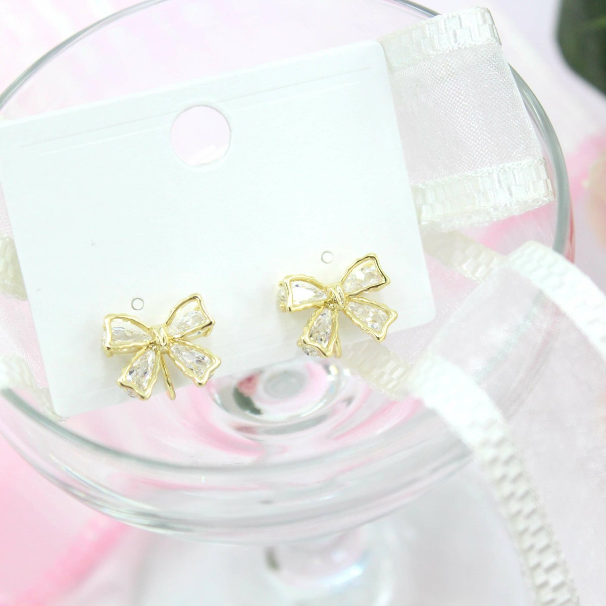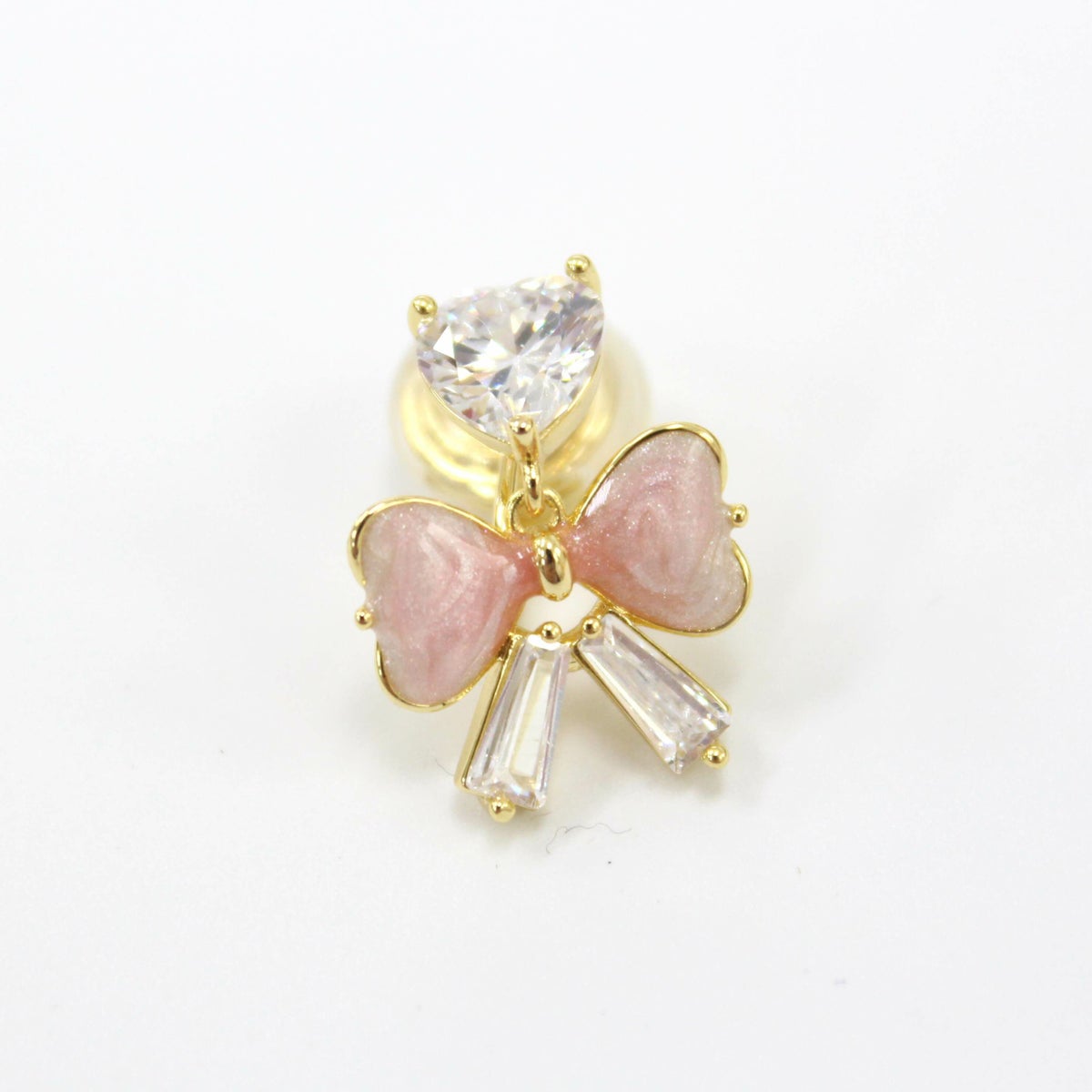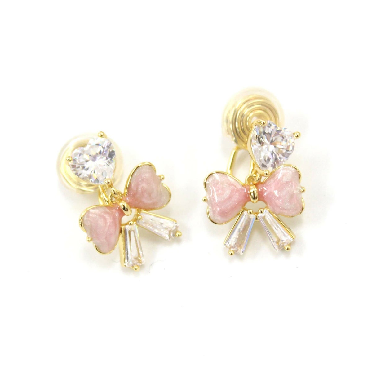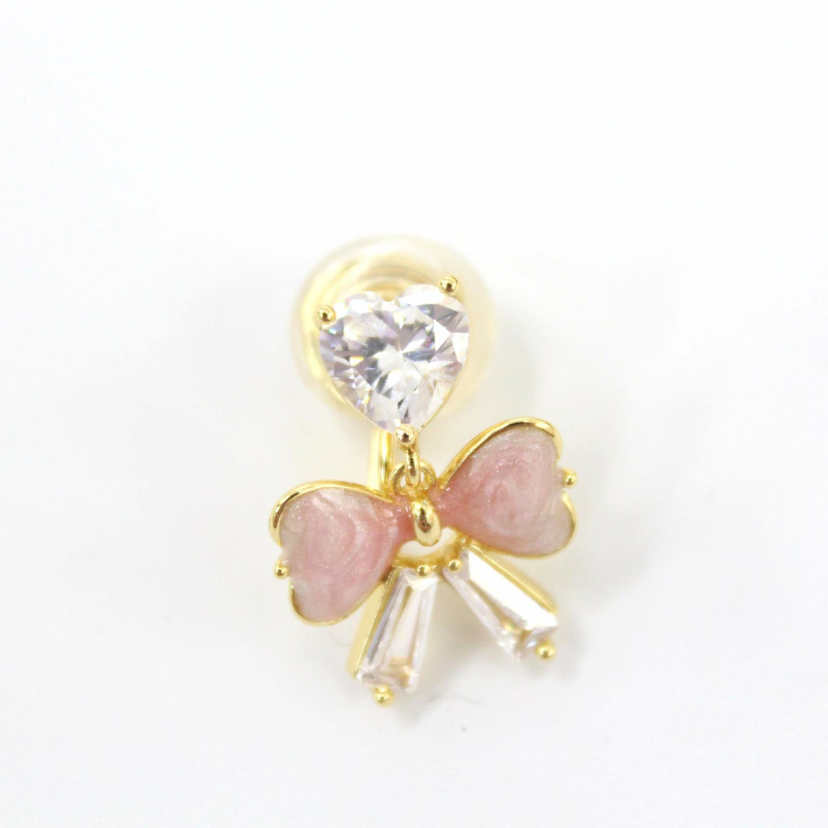 ハートビジューピンクリボンイヤリング ゴールド