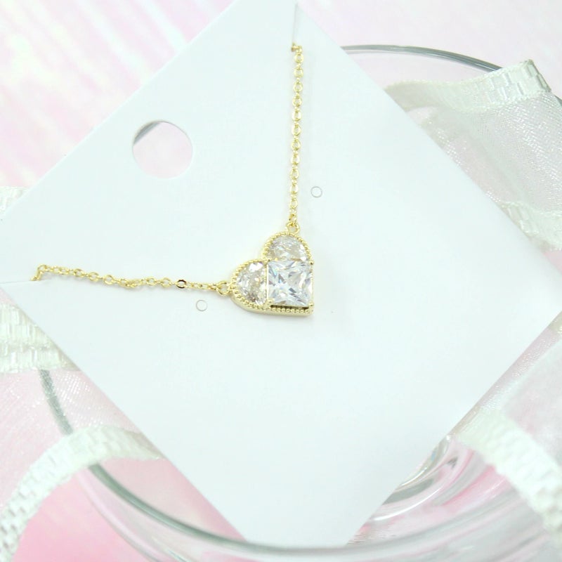 大きめなハートのフレームにスクエアストーンをのせたネックレスです。
