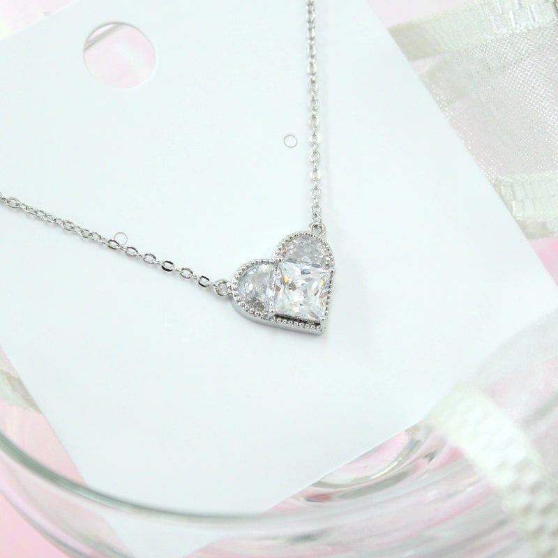 大きめなハートのフレームにスクエアストーンをのせたネックレスです。