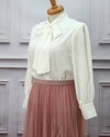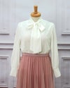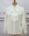 胸元にリボンをつけたシンプルで上品なブラウスです。