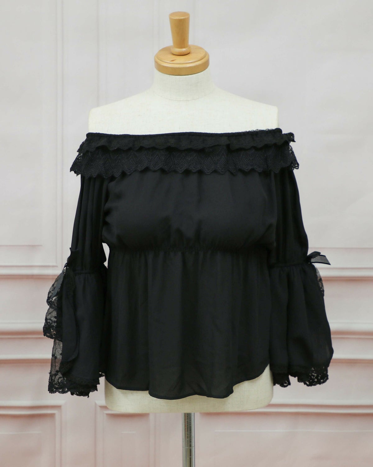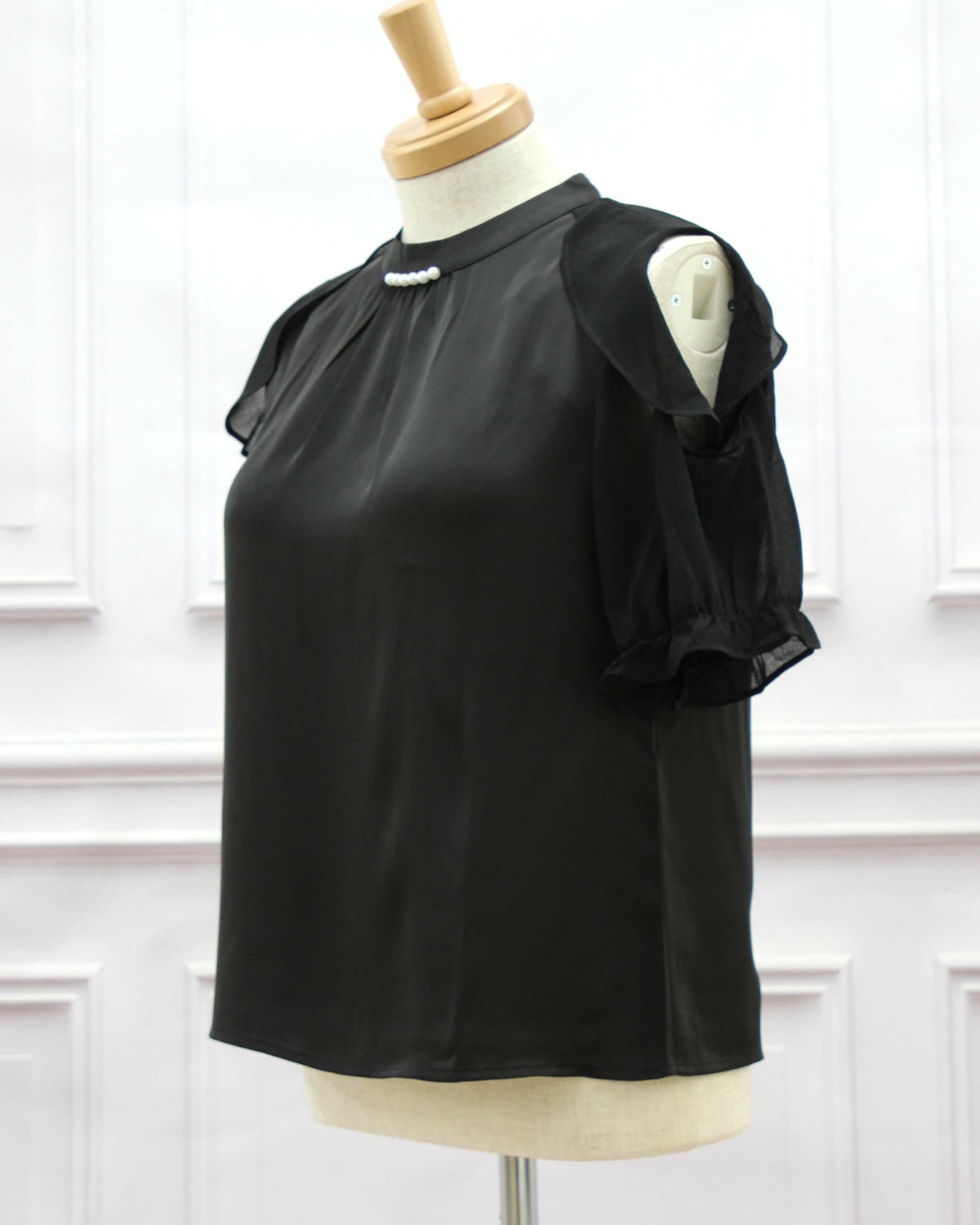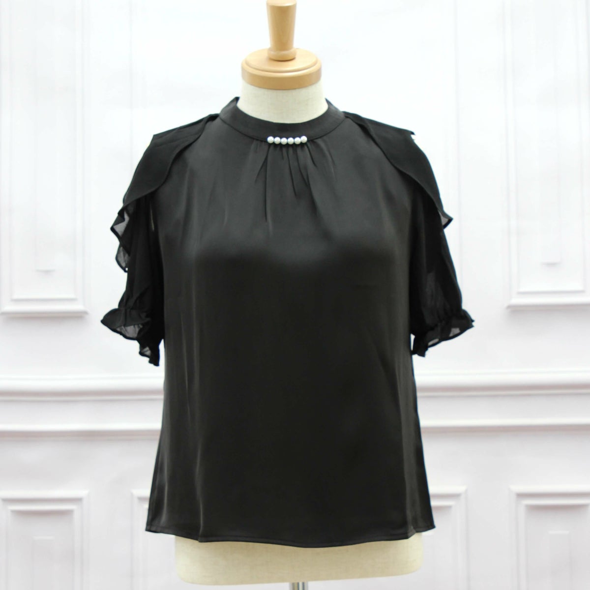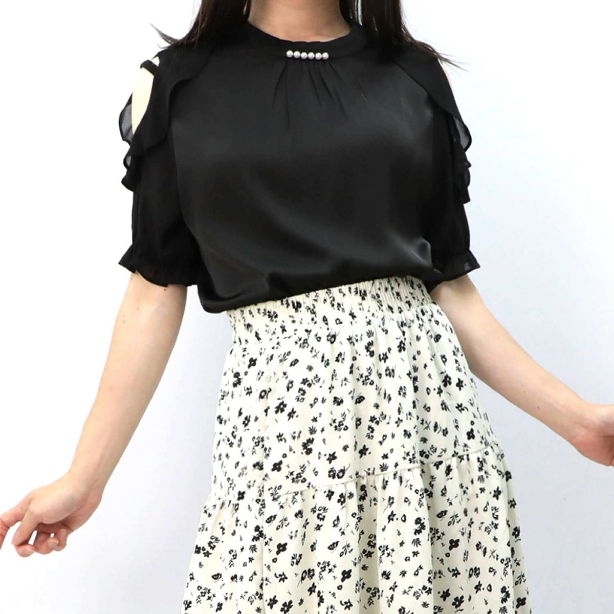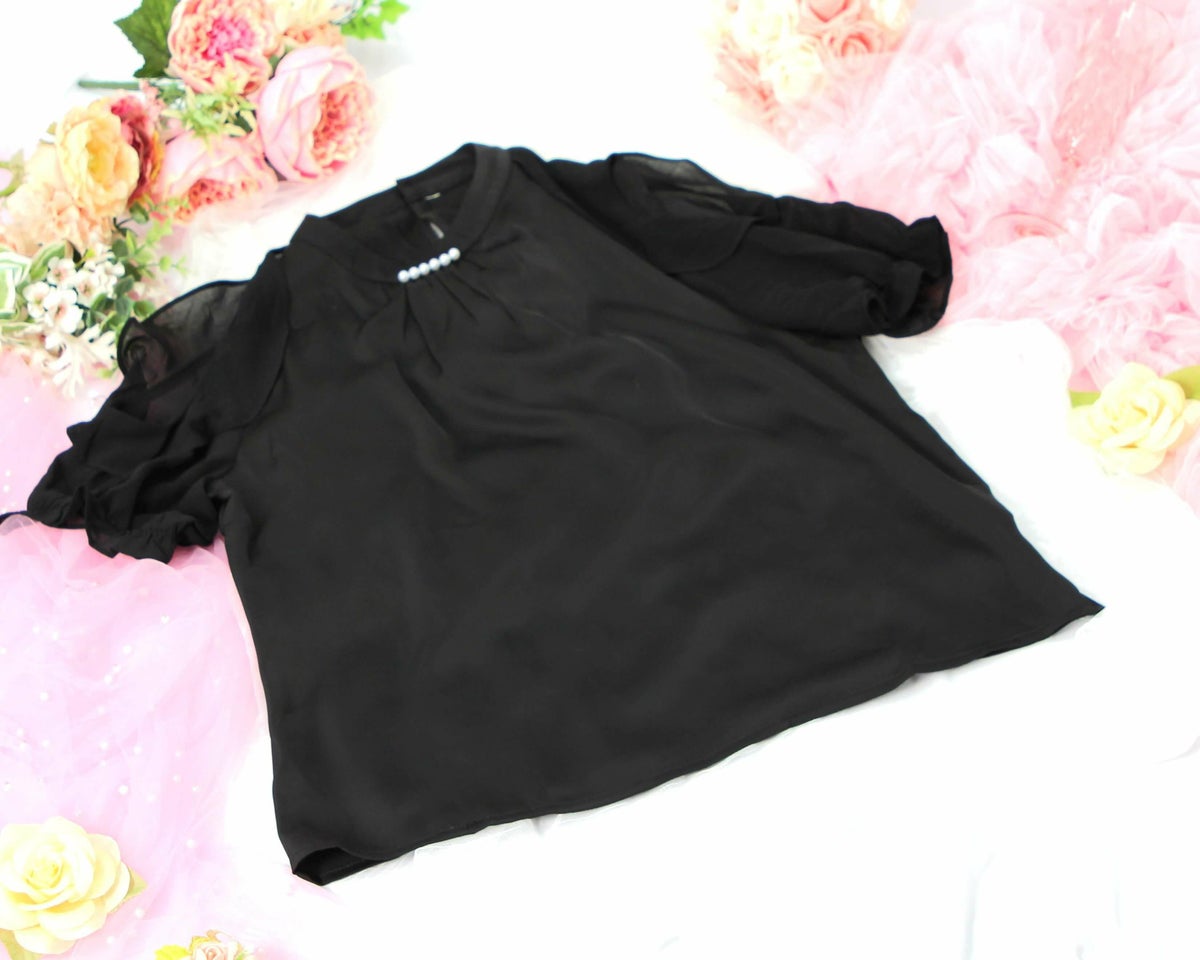 ネックパールオフショル半袖ブラウス 黒 フリーサイズ
