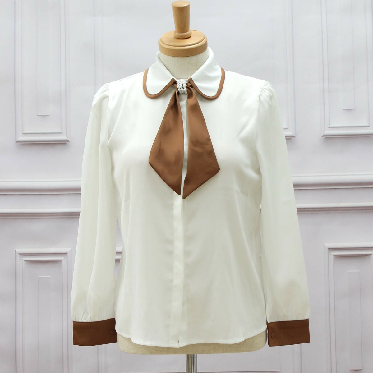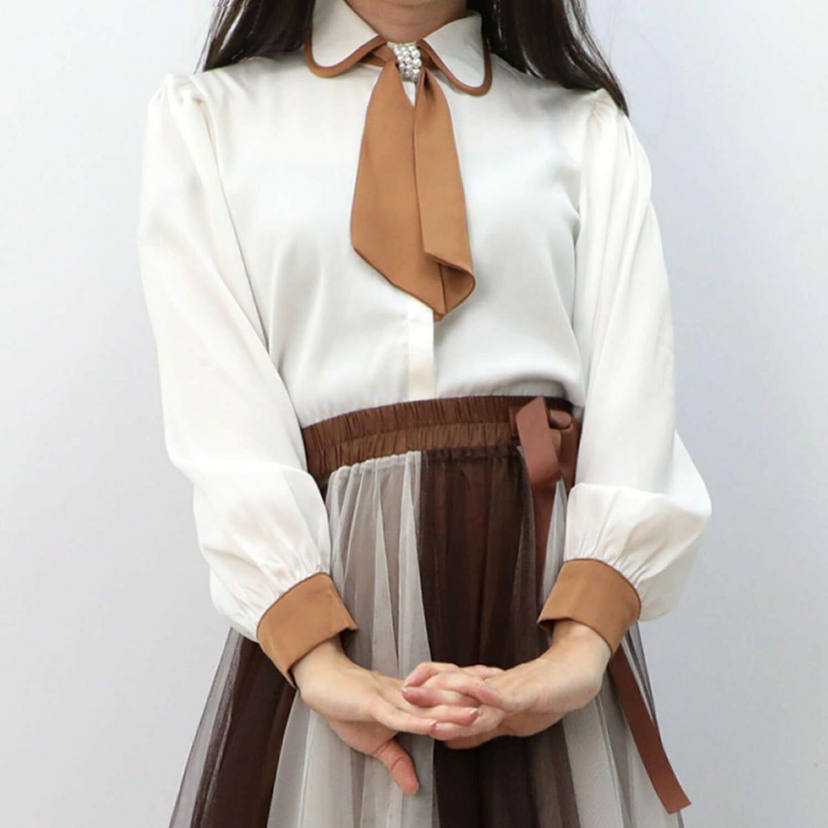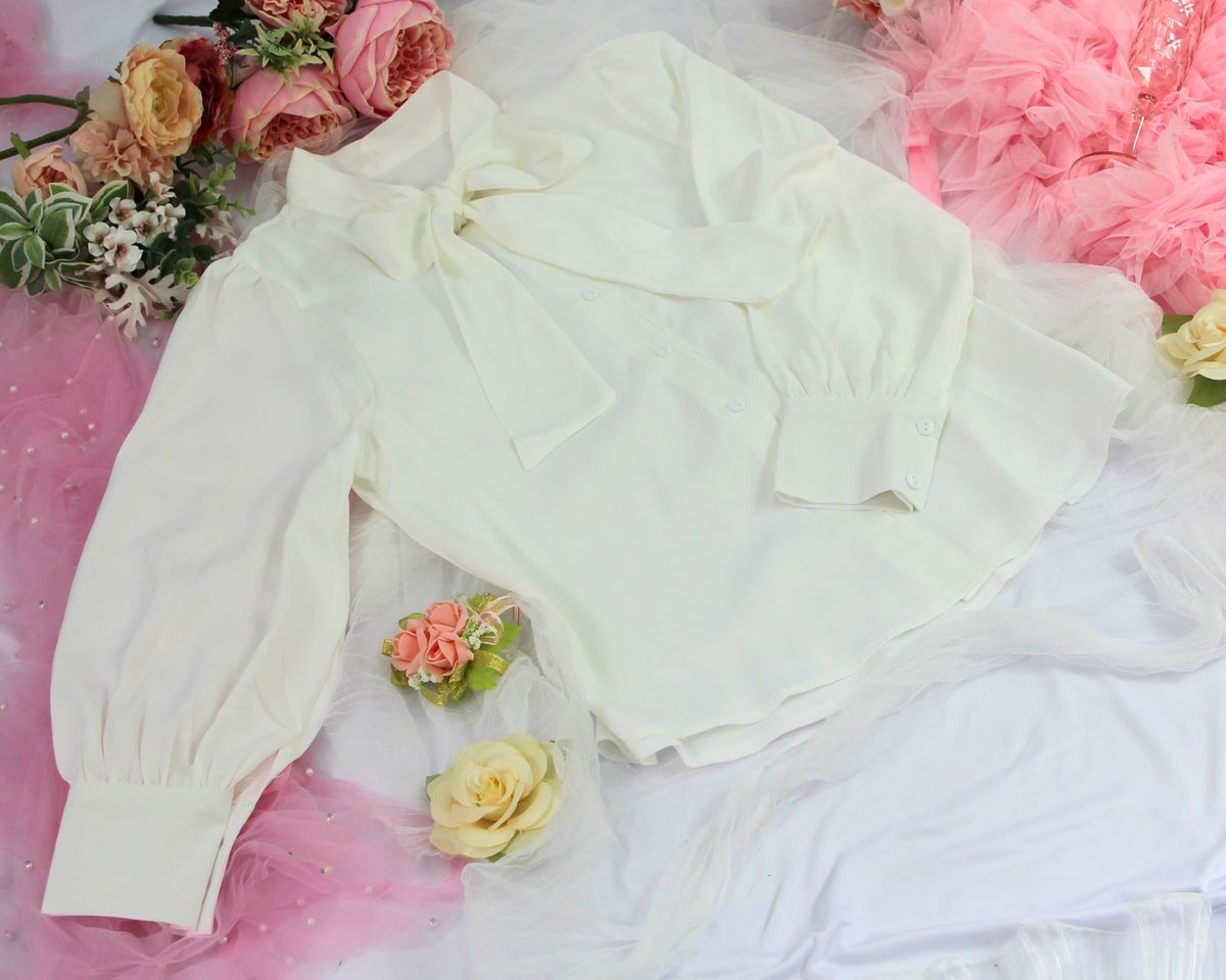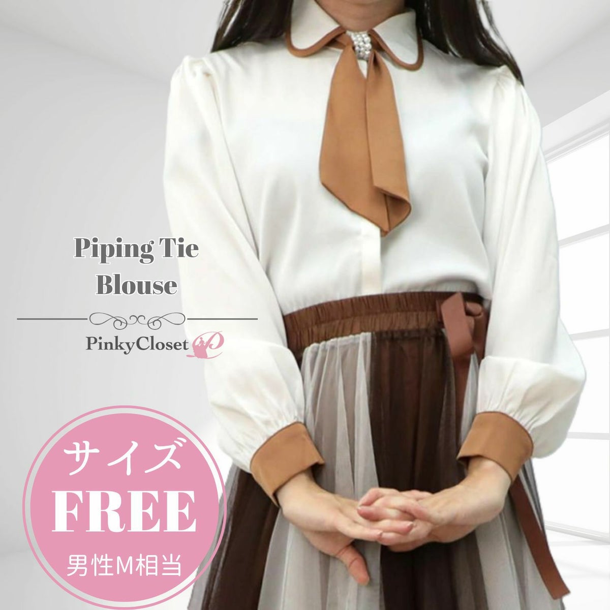 パイピングリボン長袖ブラウス 白 フリーサイズ