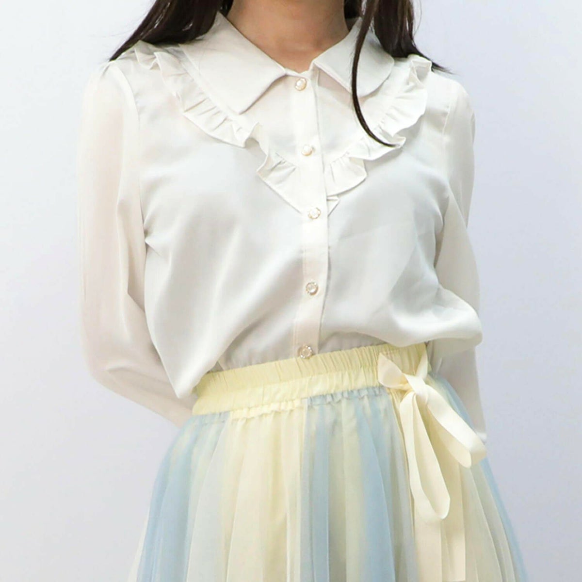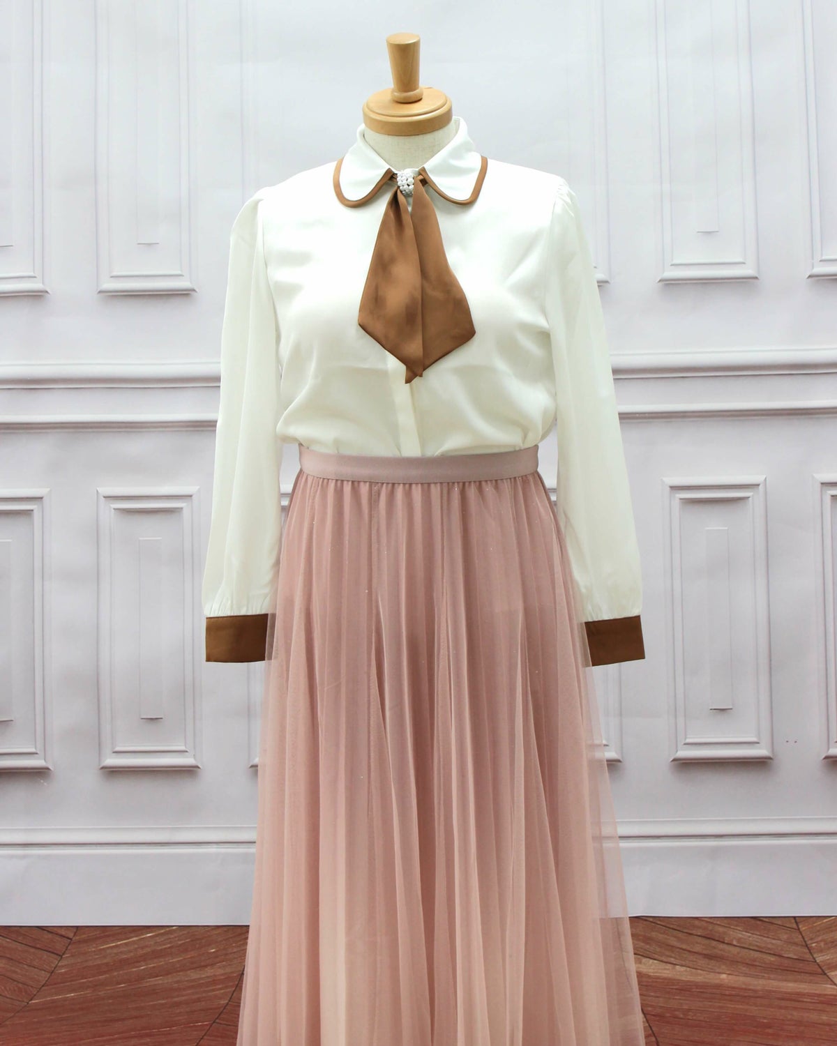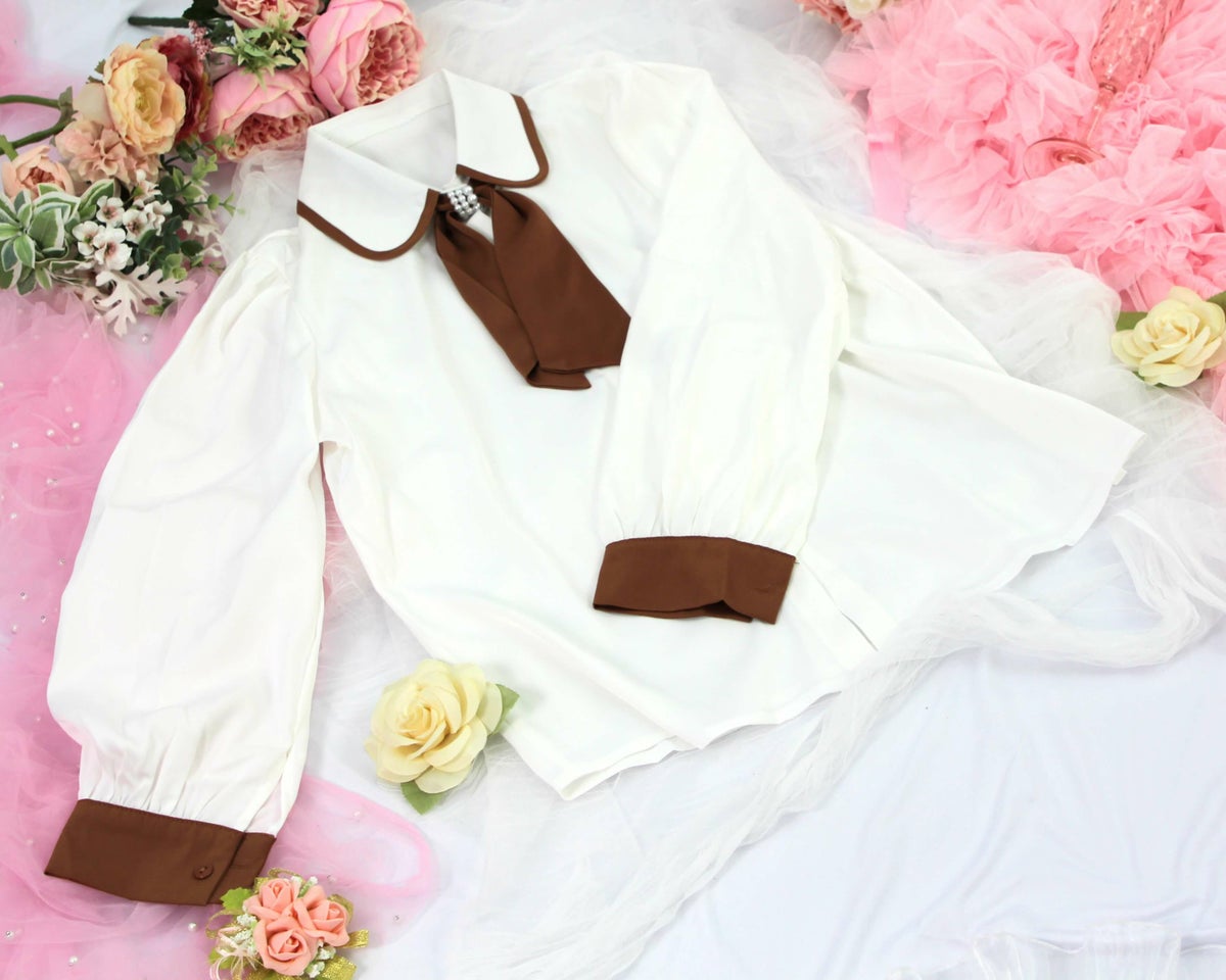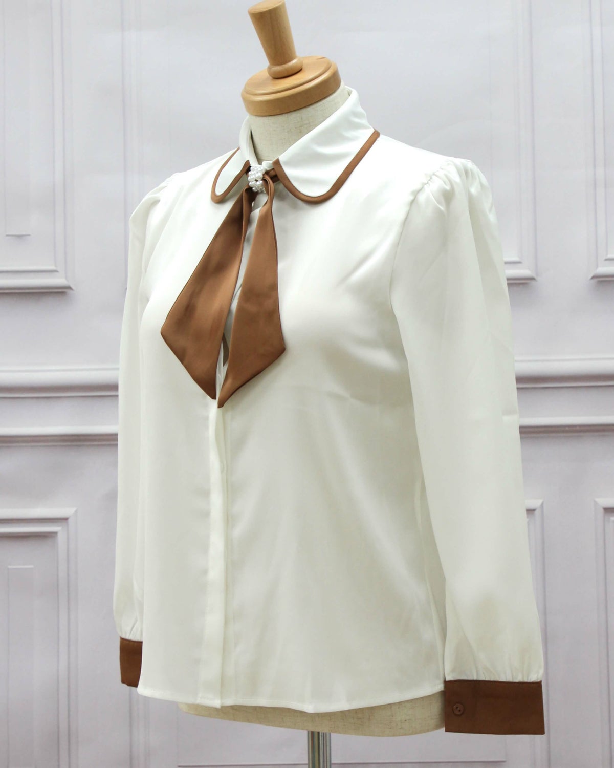 パイピングリボン長袖ブラウス 白 フリーサイズ