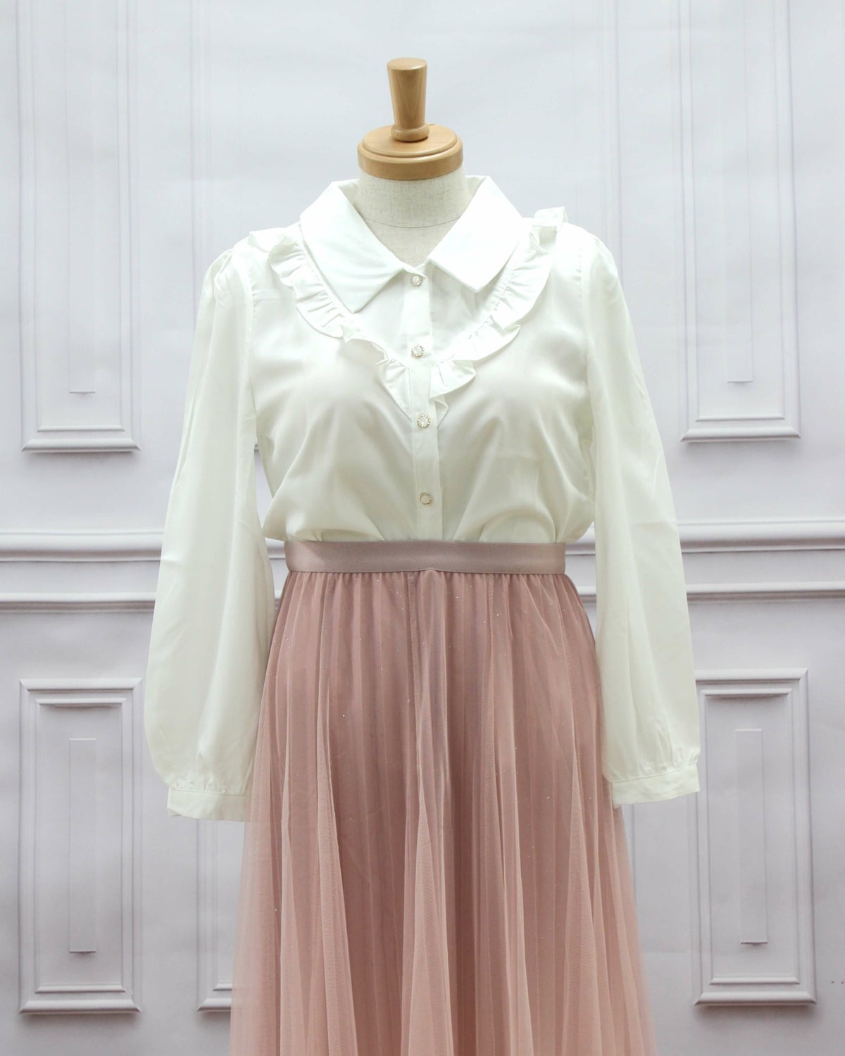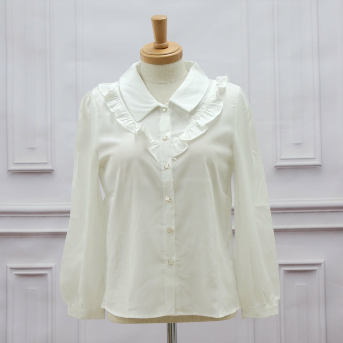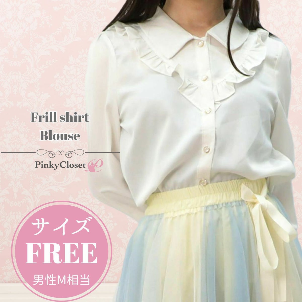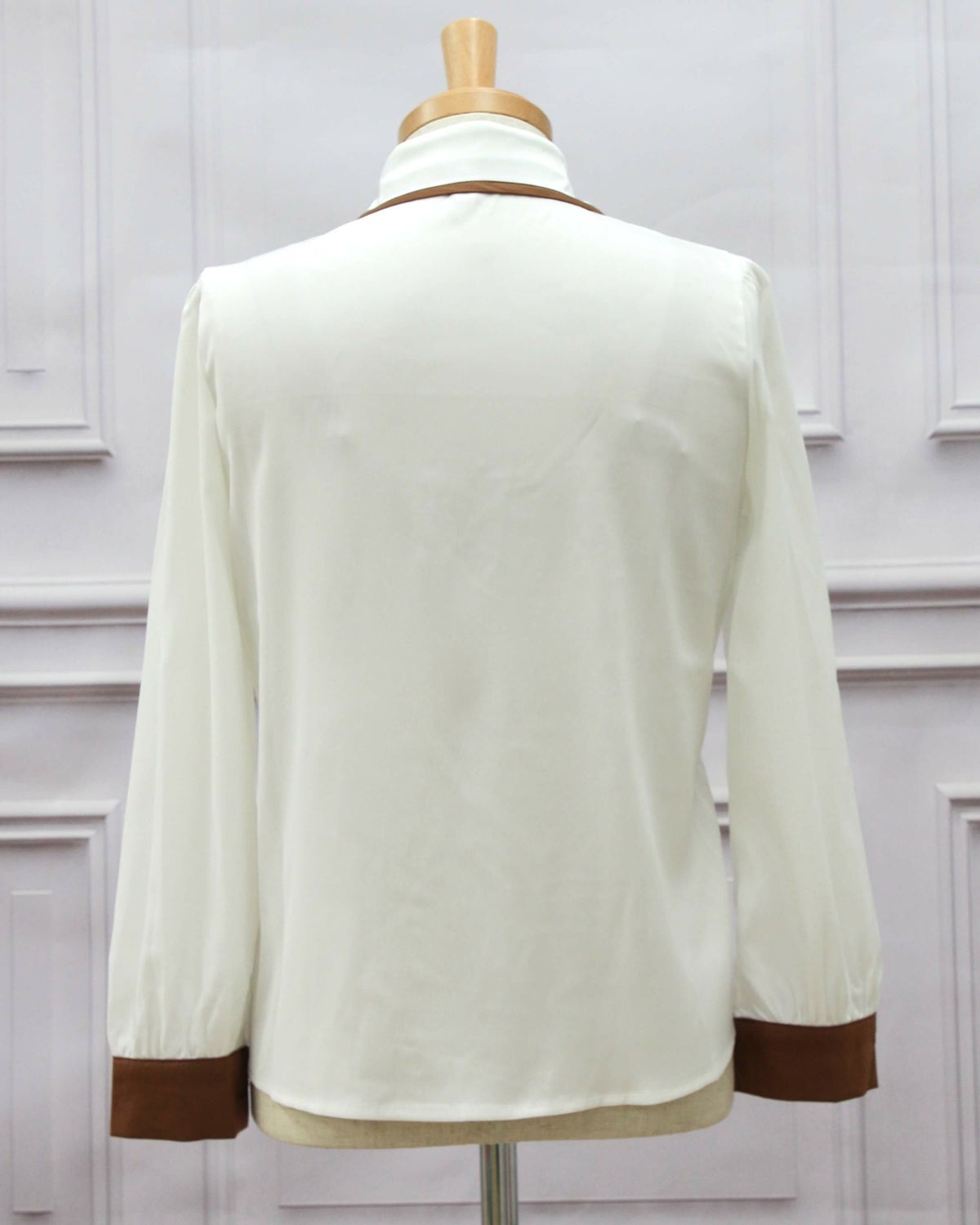 パイピングリボン長袖ブラウス 白 フリーサイズ