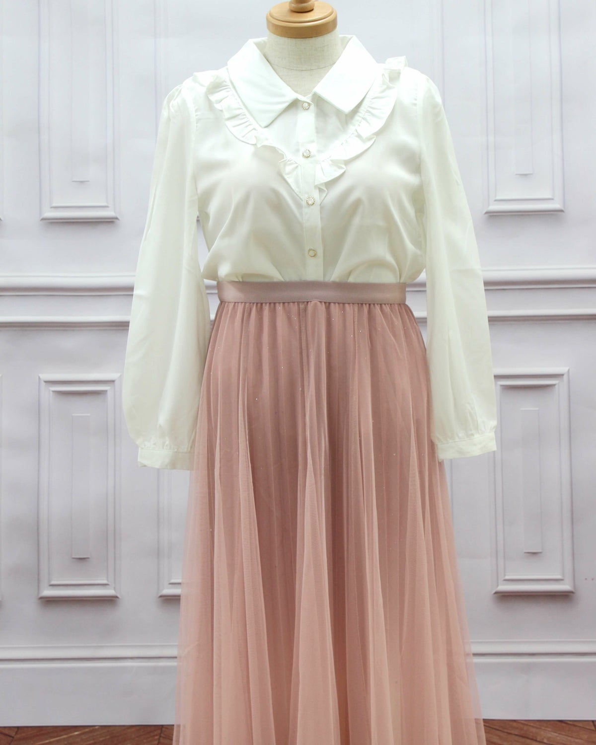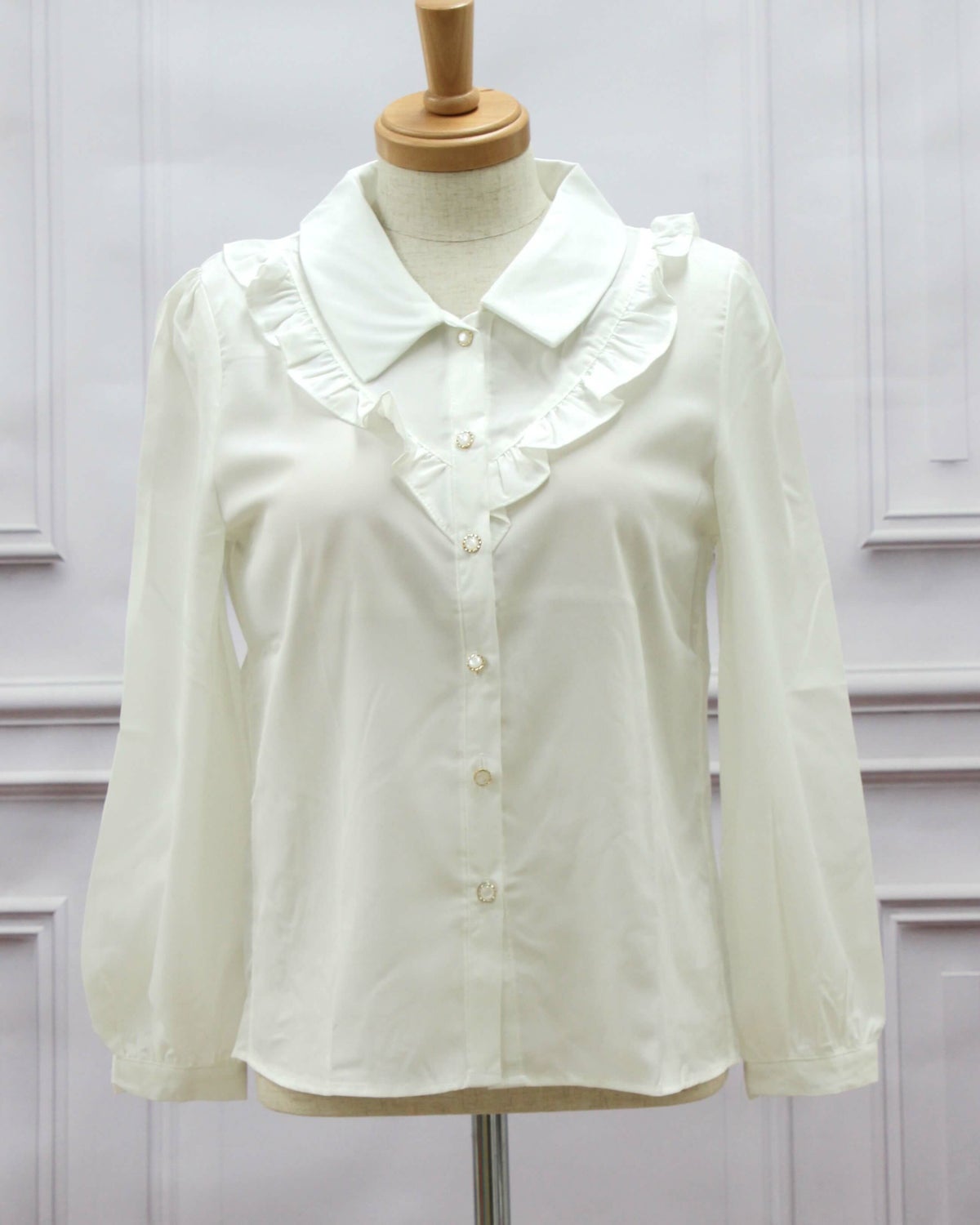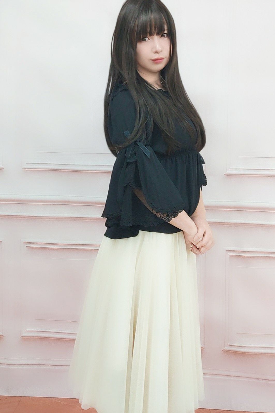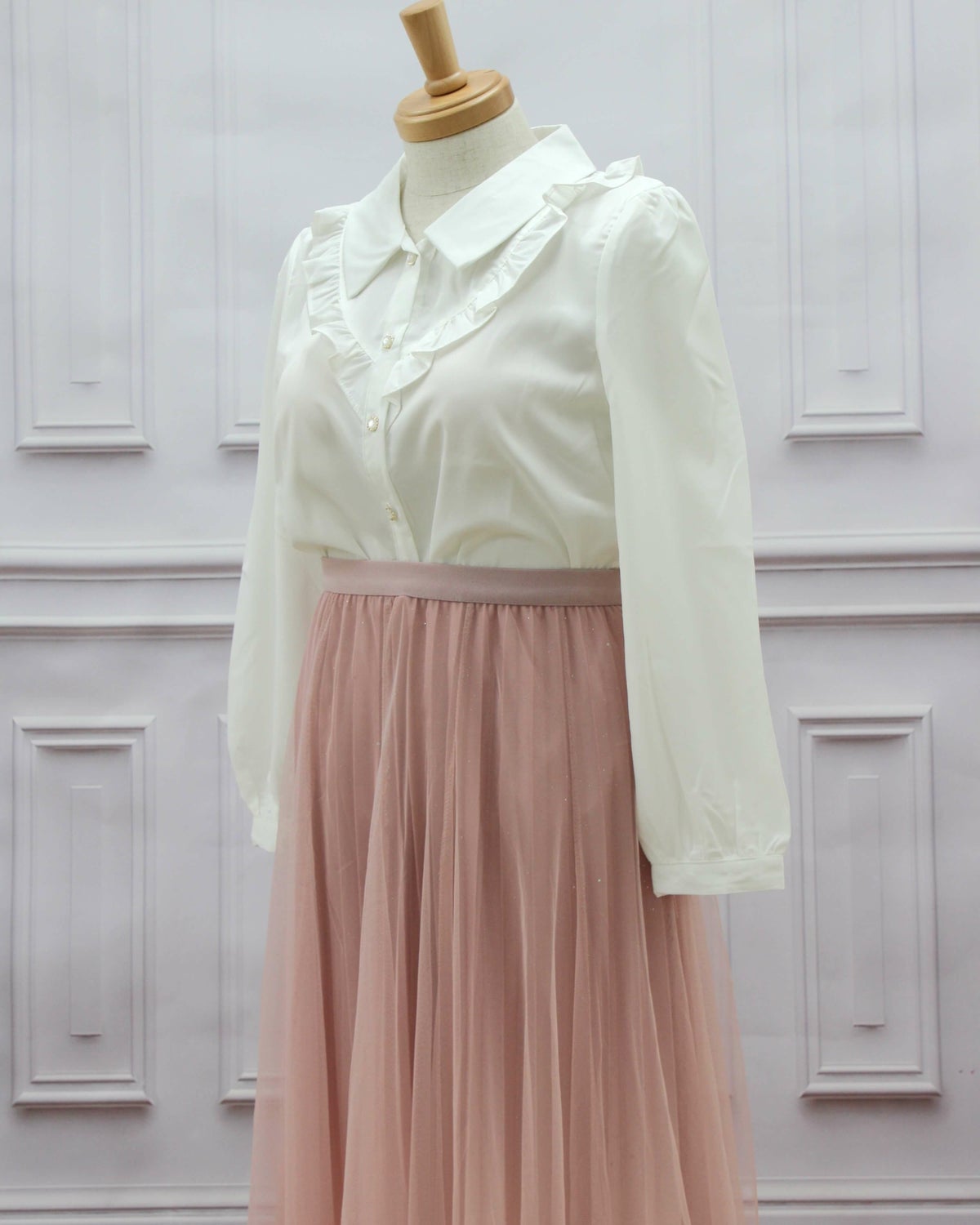 パイピングリボン長袖ブラウス 白 フリーサイズ