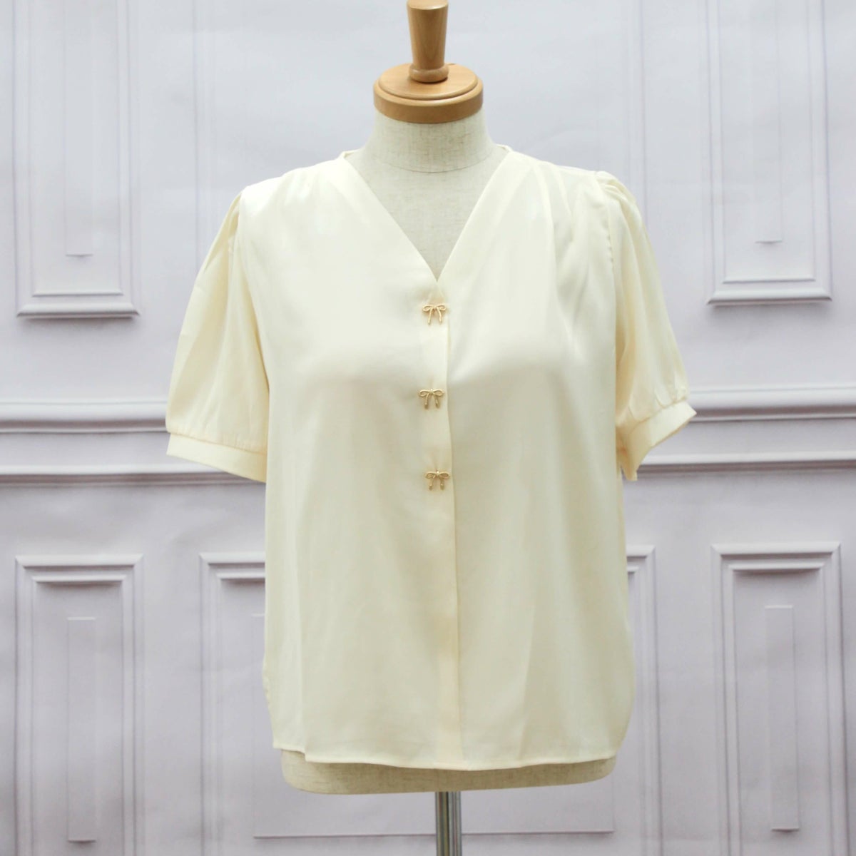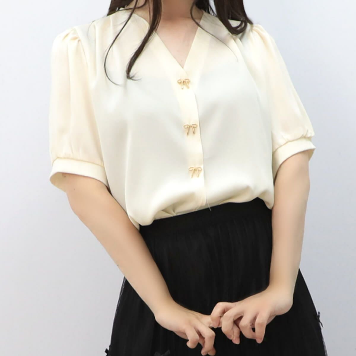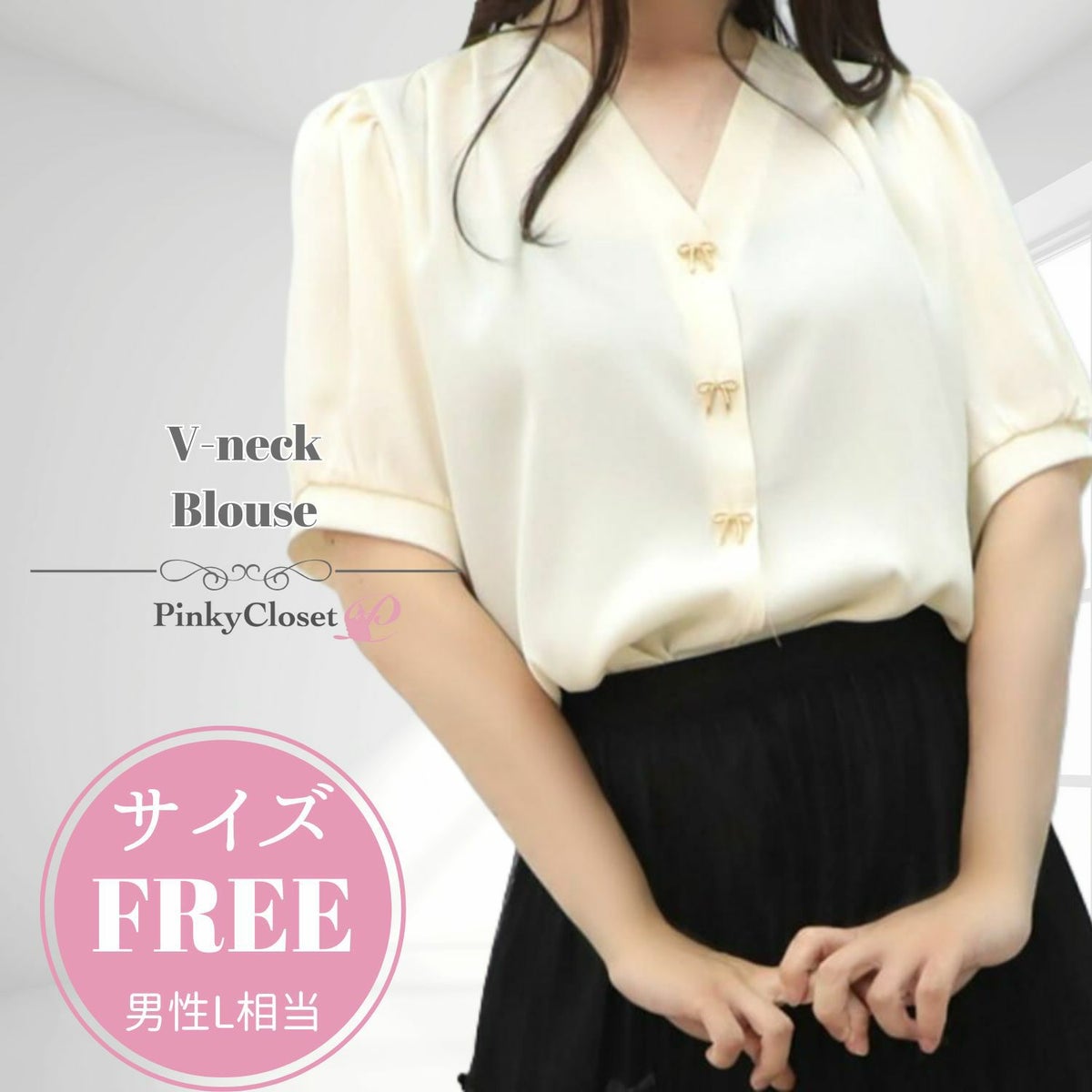 Vネックリボンボタン半袖ブラウス クリーム フリーサイズ