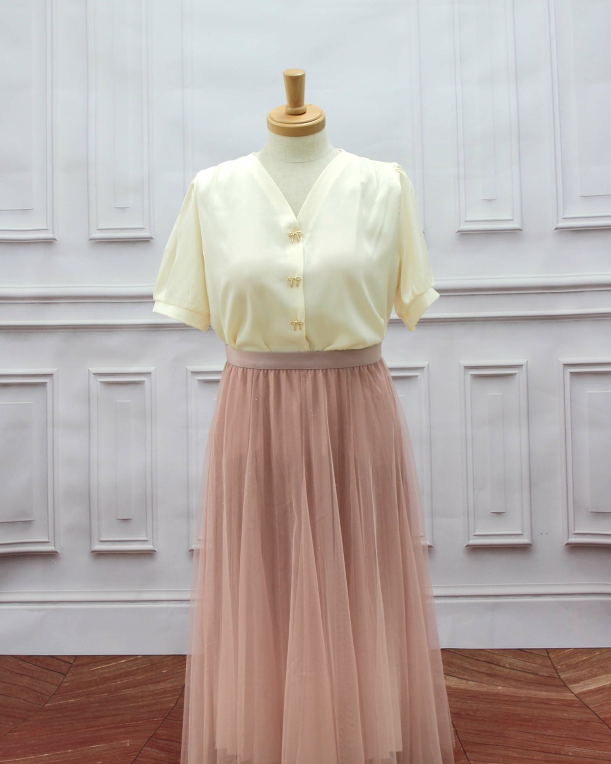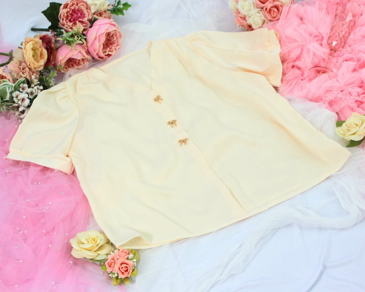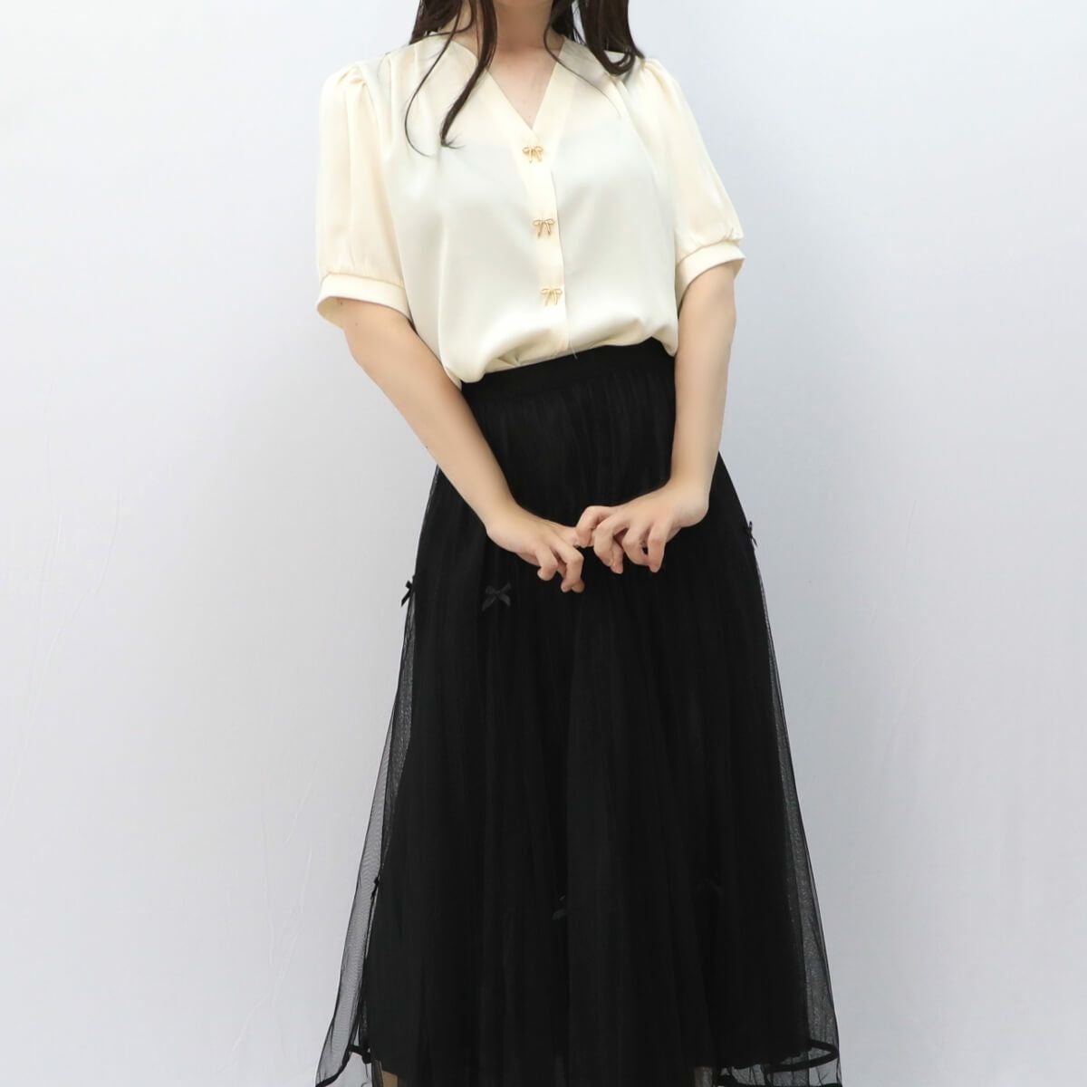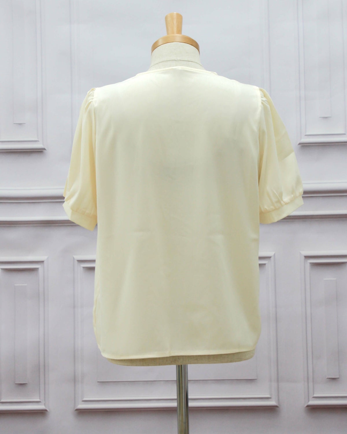 Vネックリボンボタン半袖ブラウス クリーム フリーサイズ