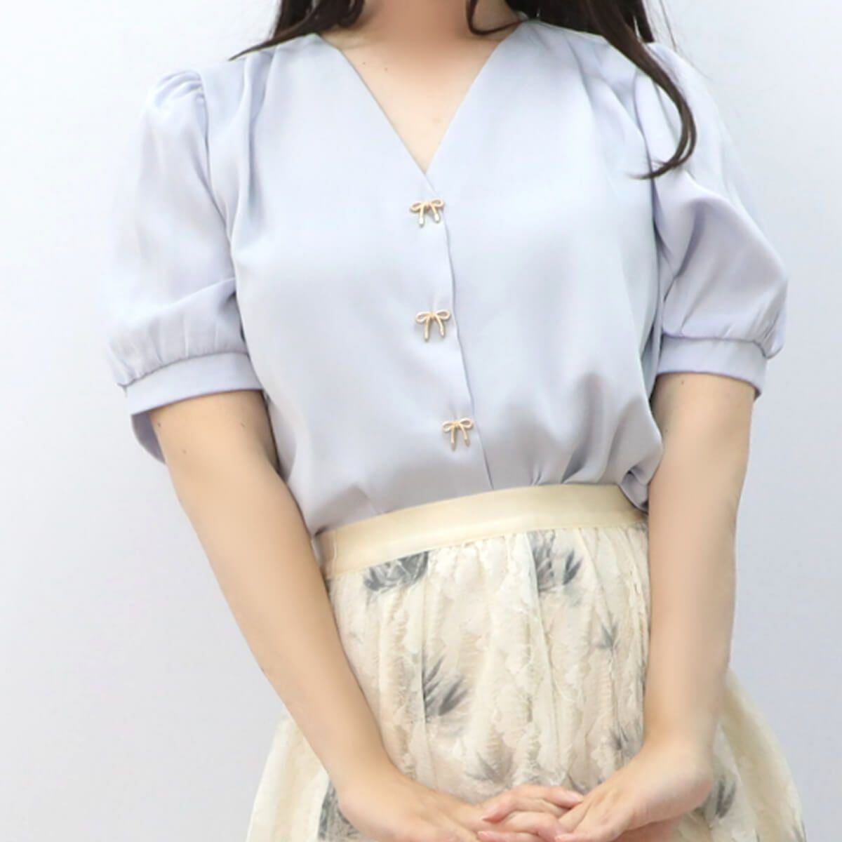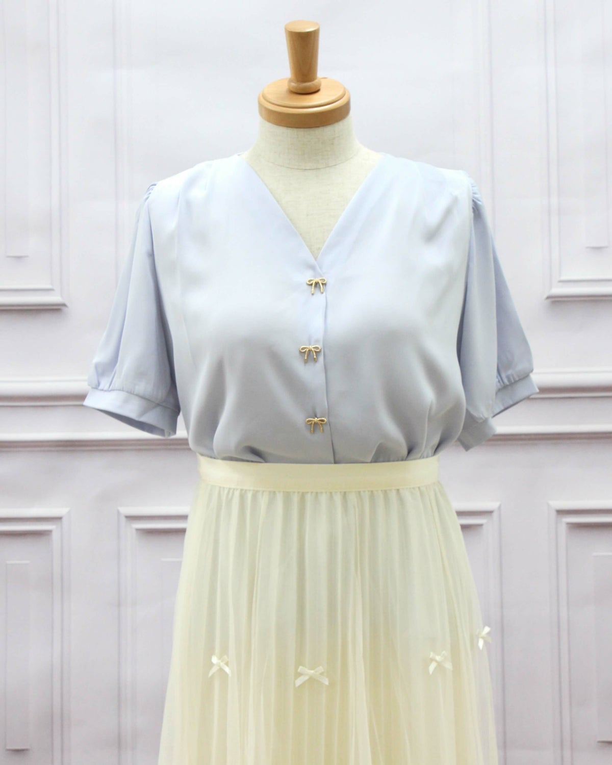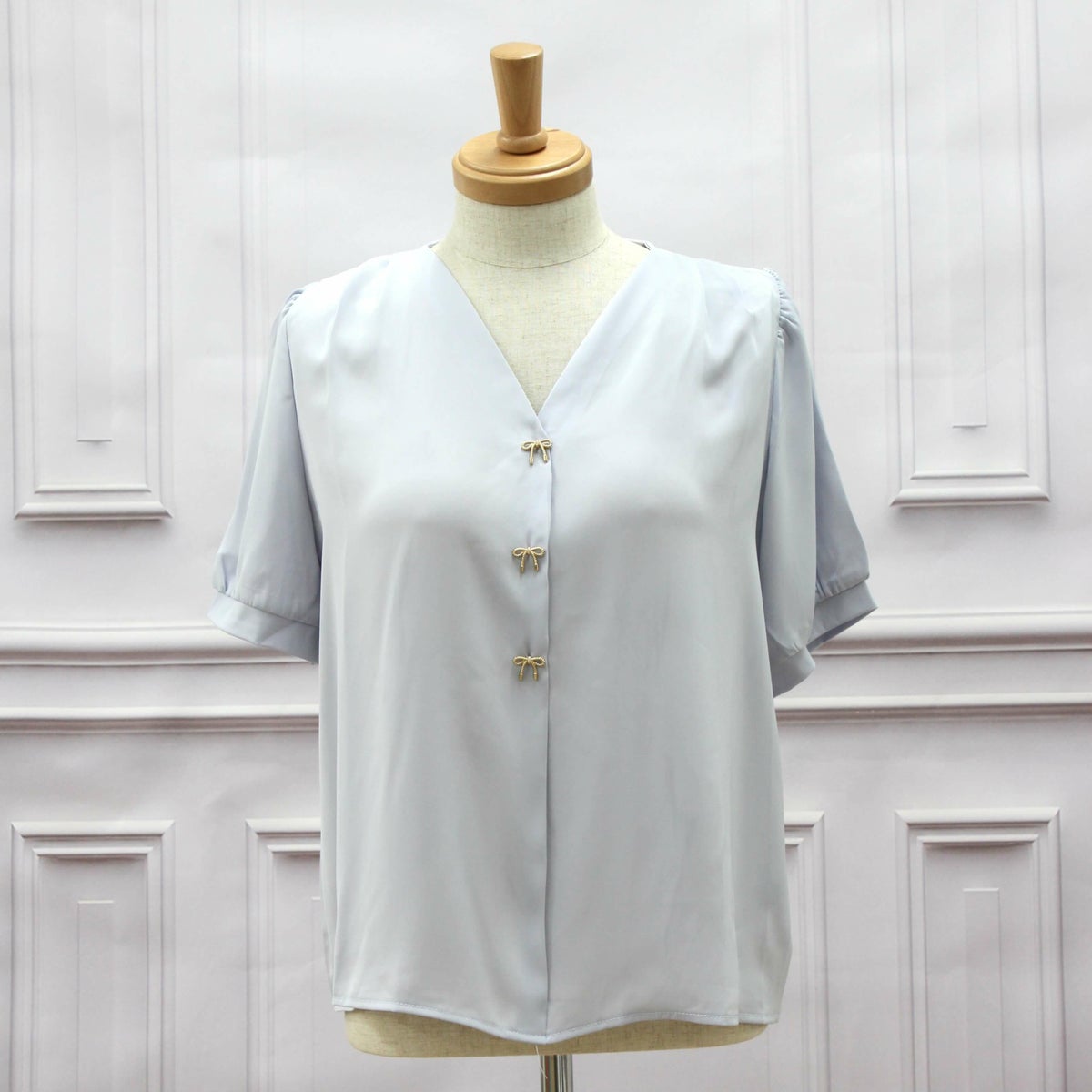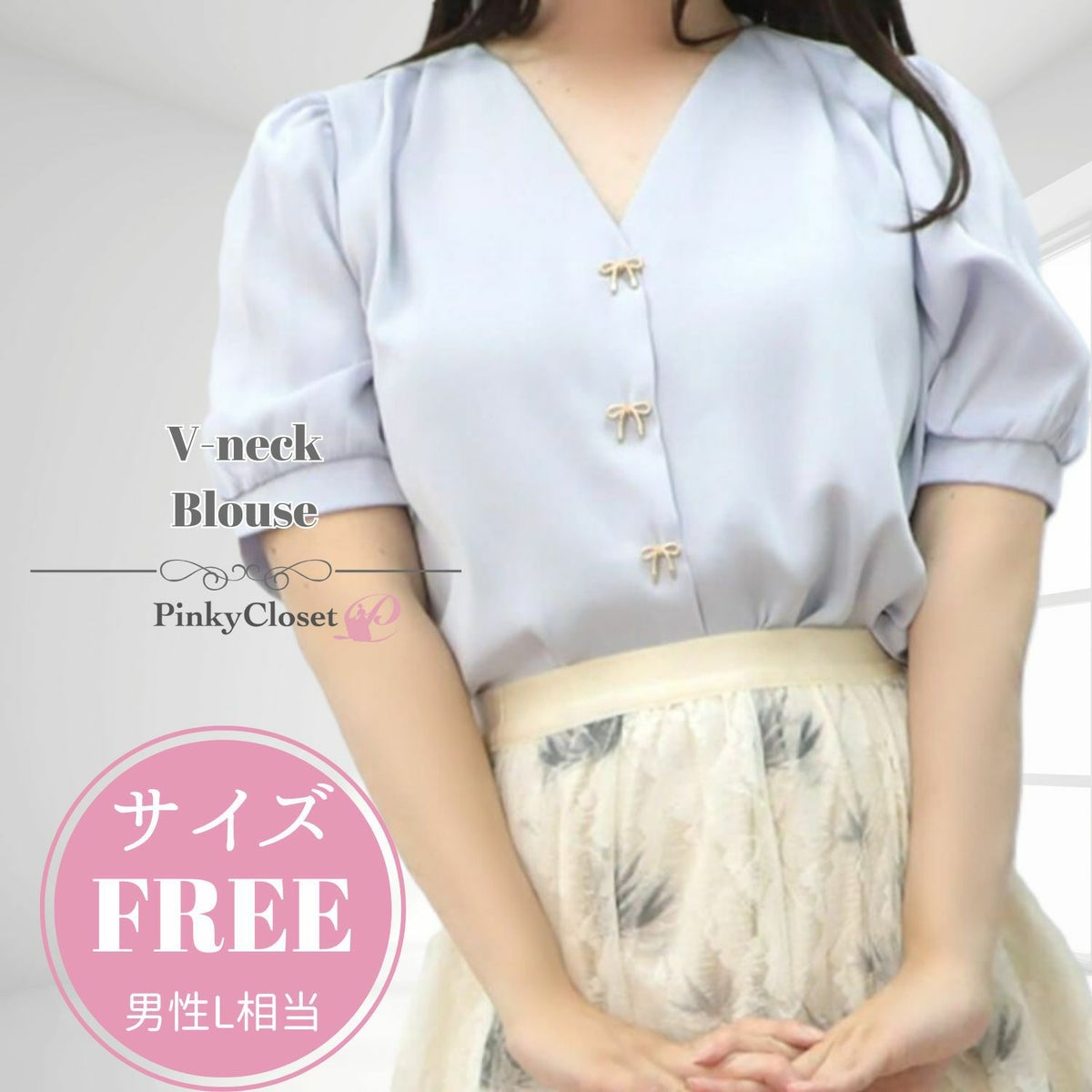 Vネックリボンボタン半袖ブラウス 水色 フリーサイズ