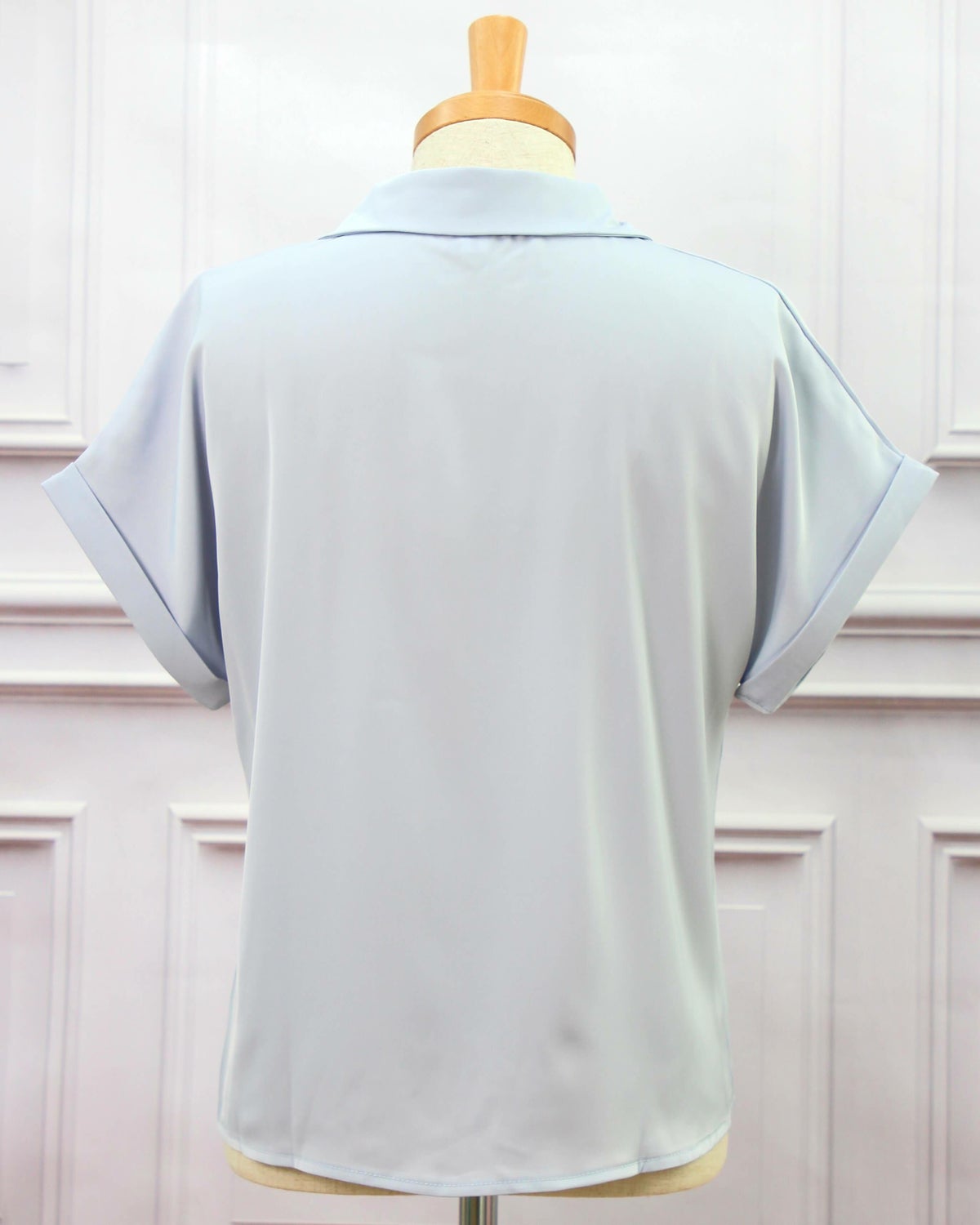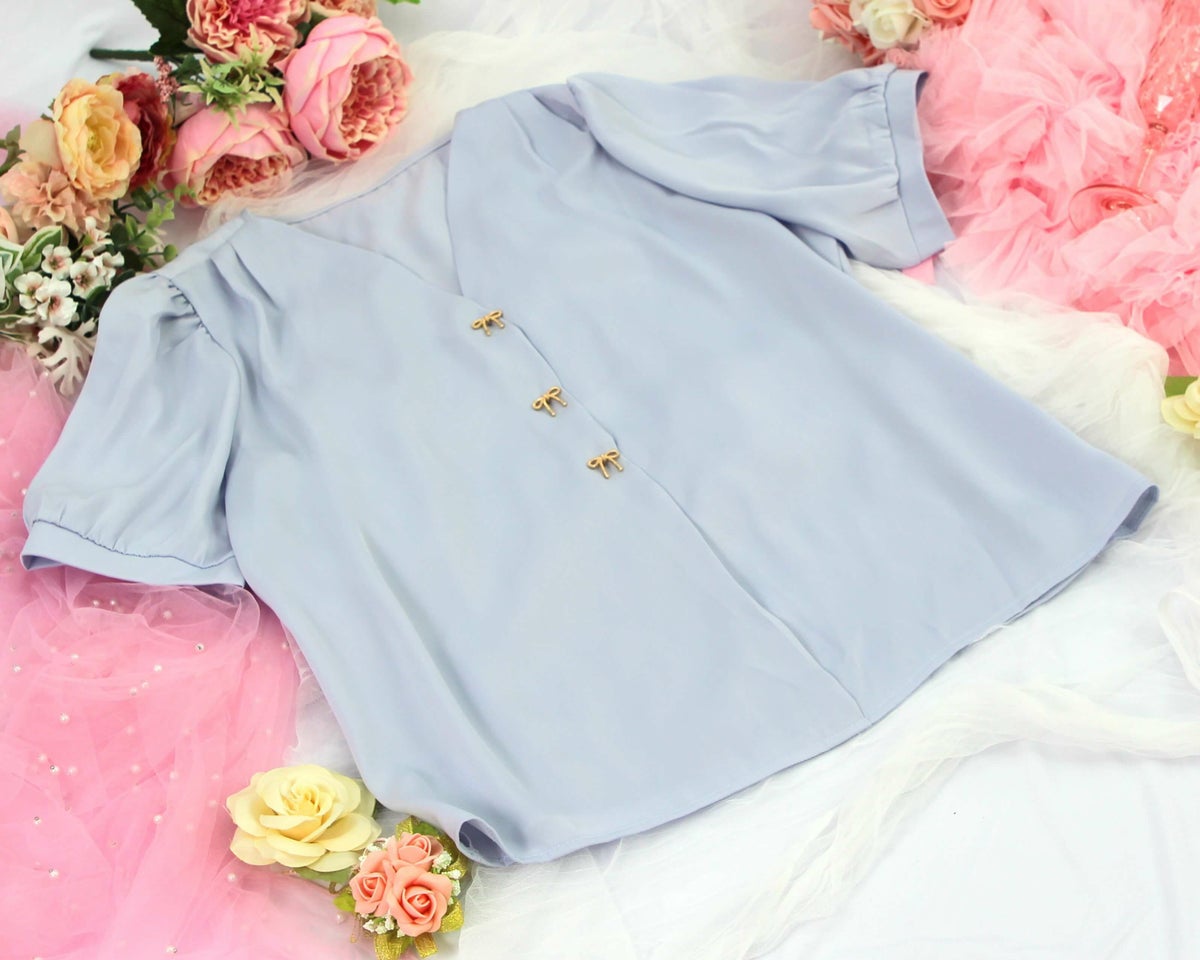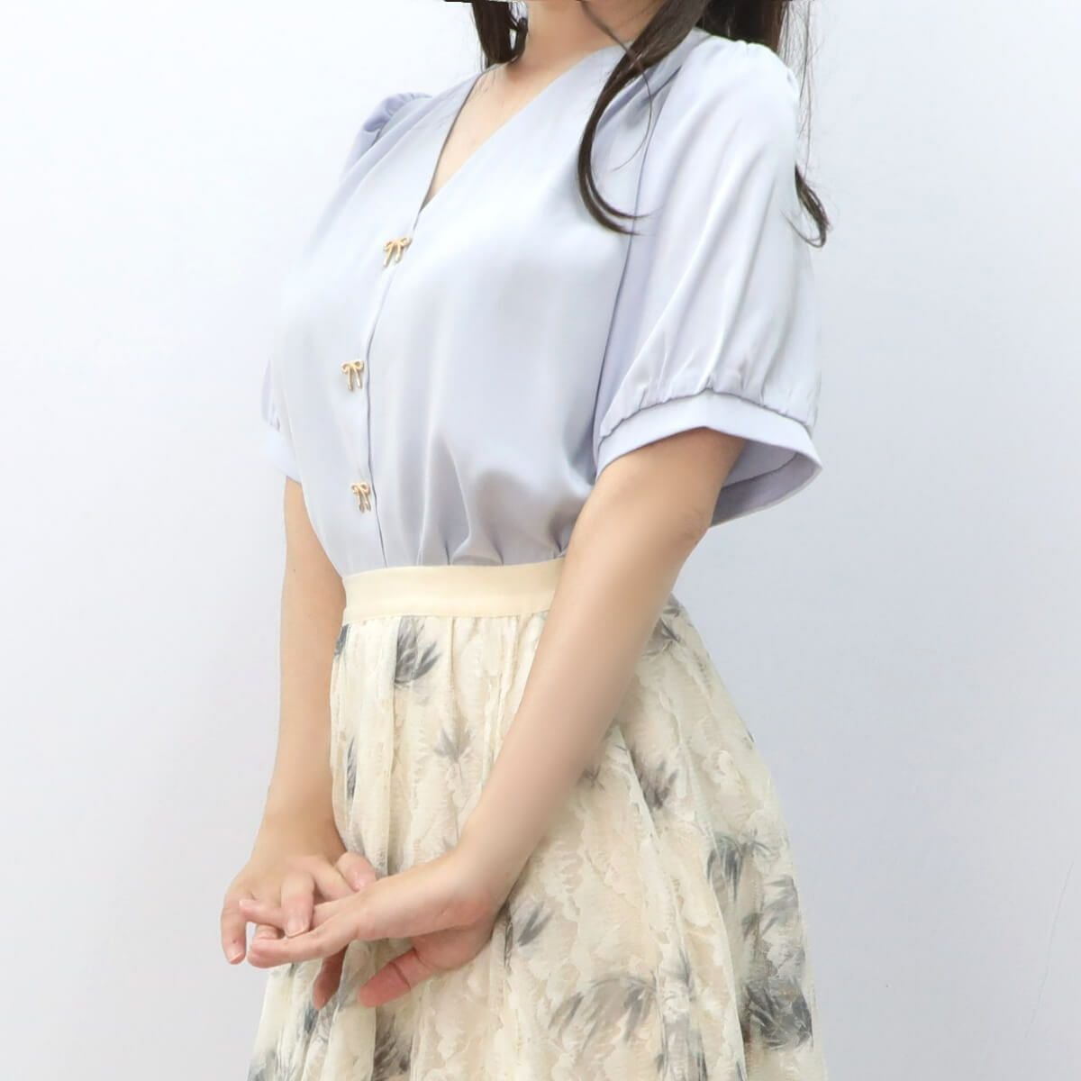 Vネックリボンボタン半袖ブラウス 水色 フリーサイズ