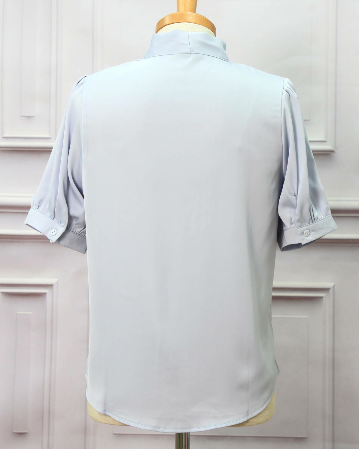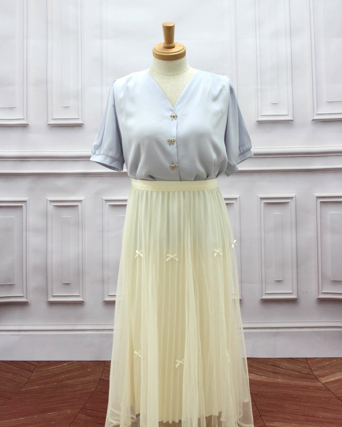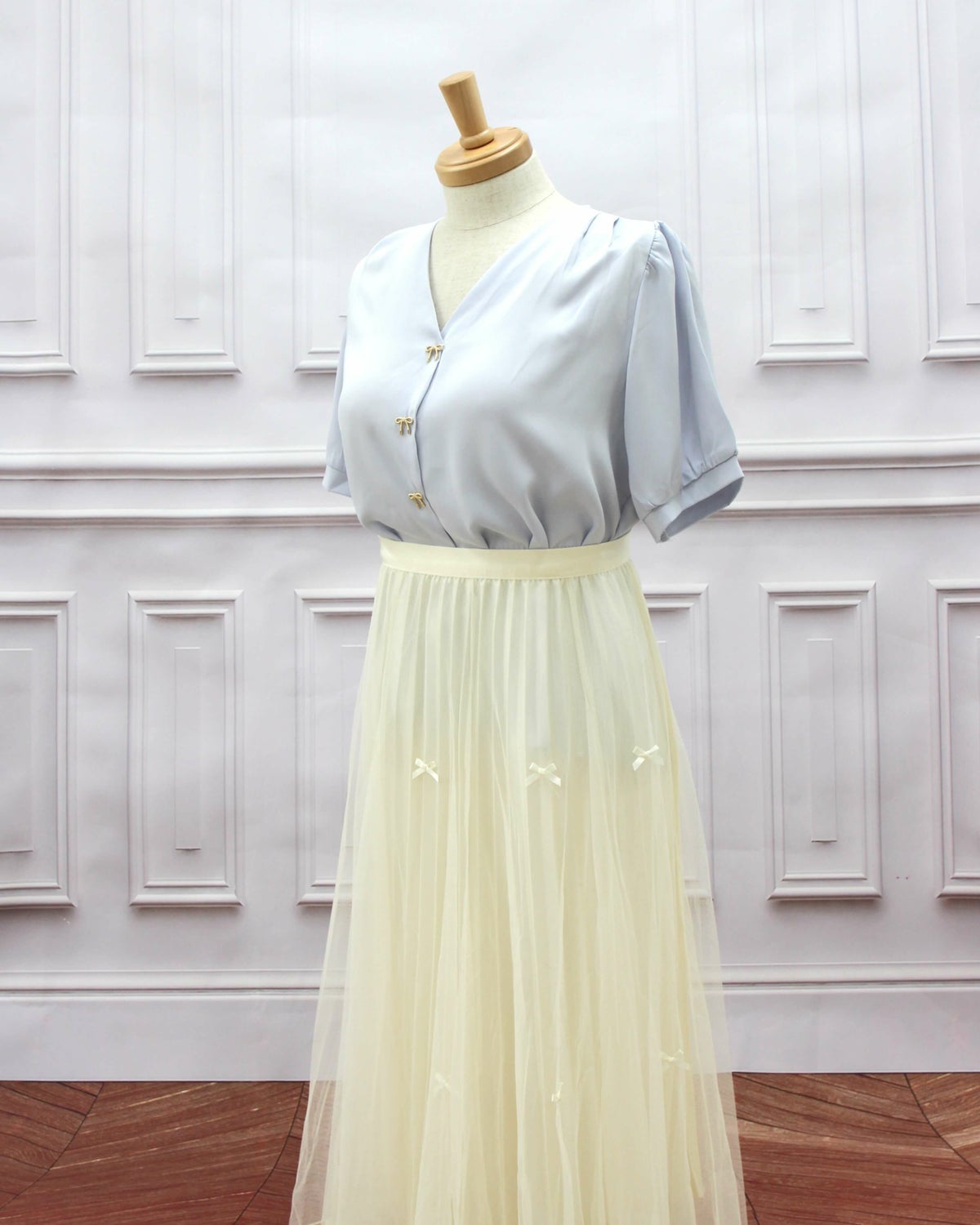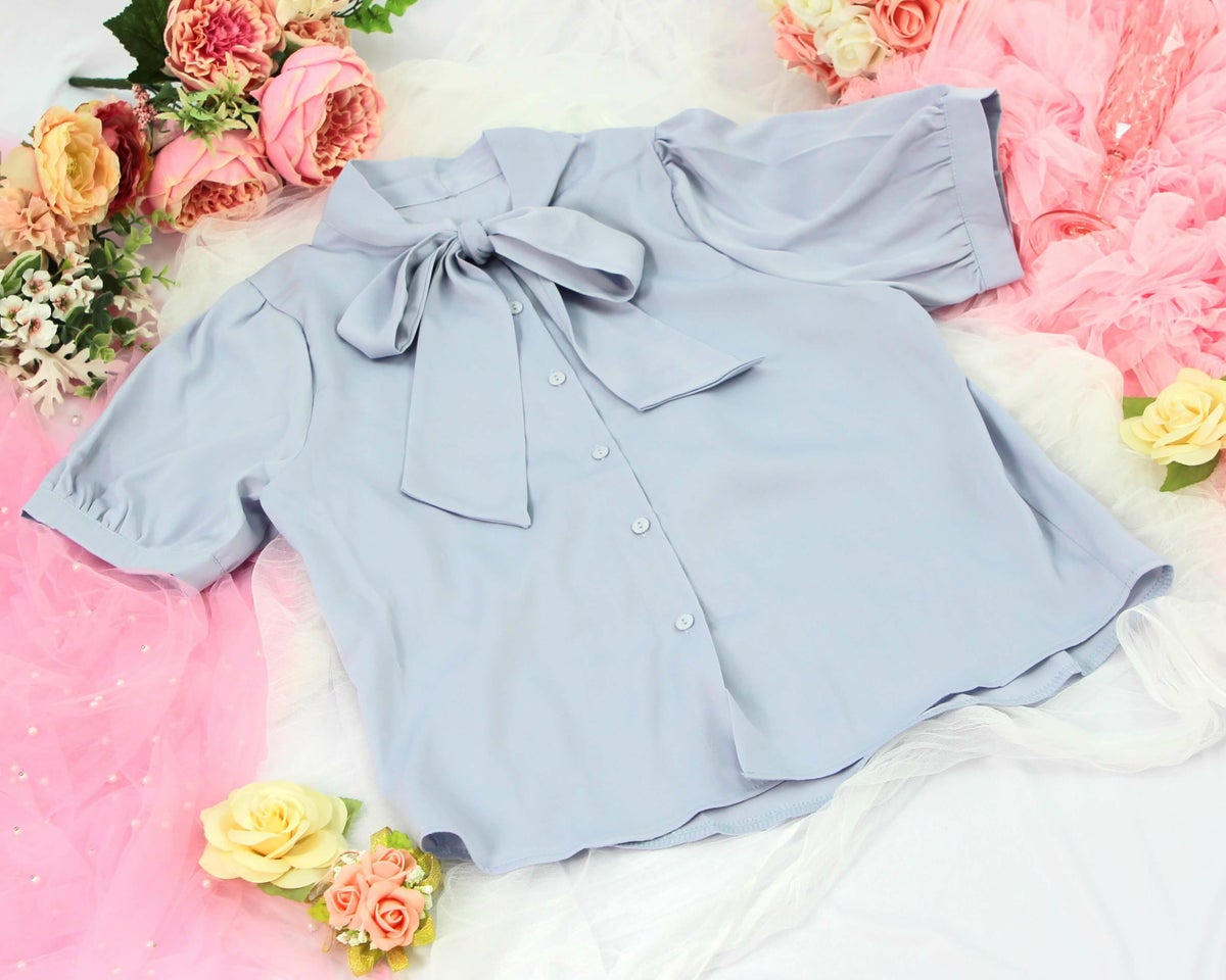 Vネックリボンボタン半袖ブラウス 水色 フリーサイズ