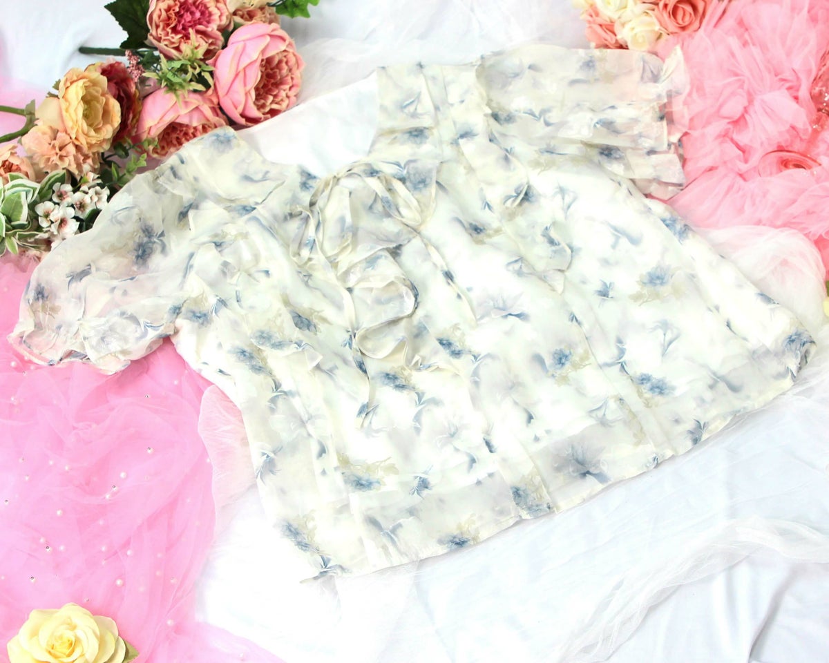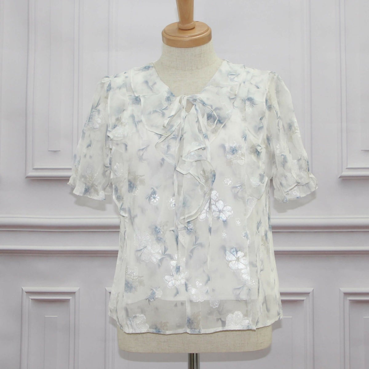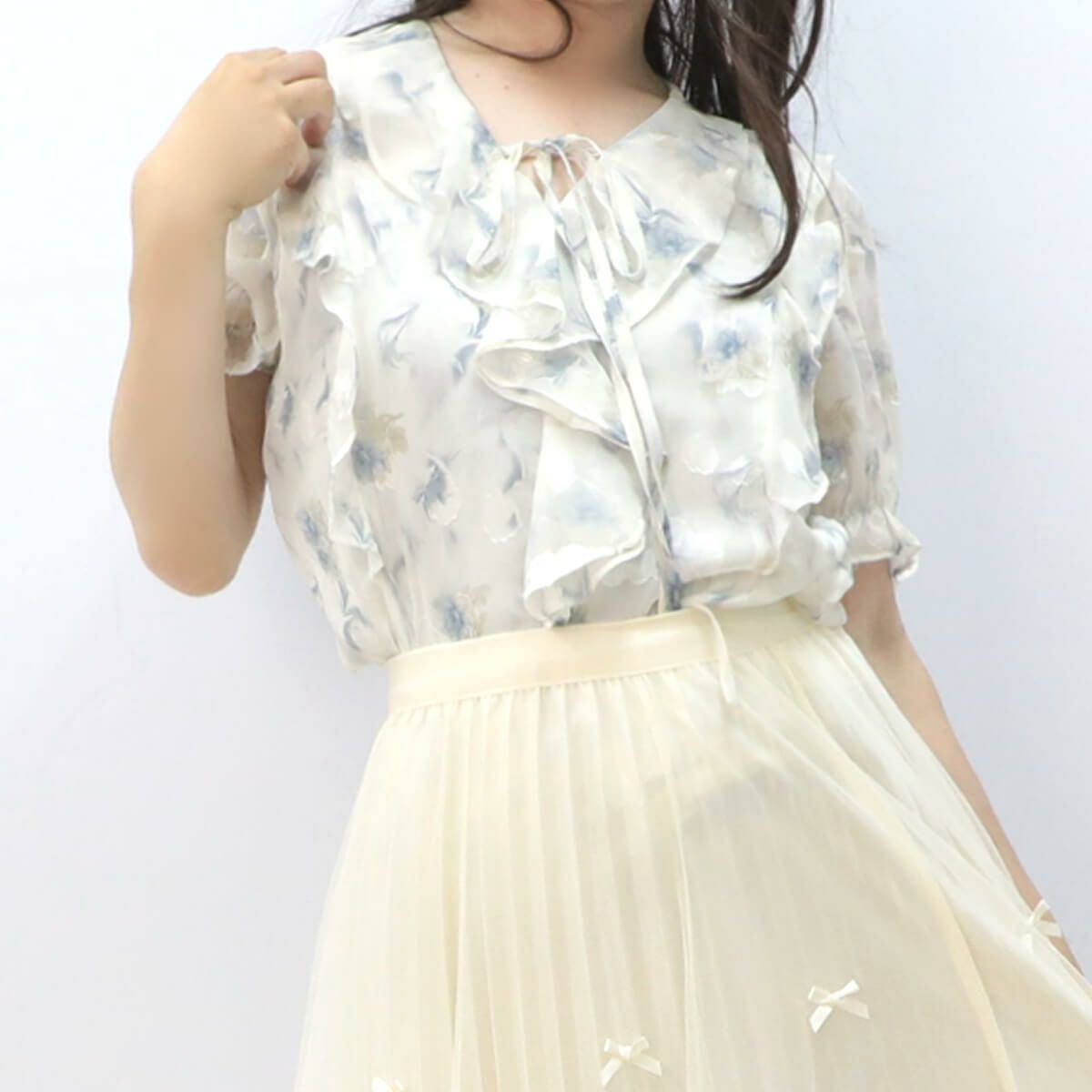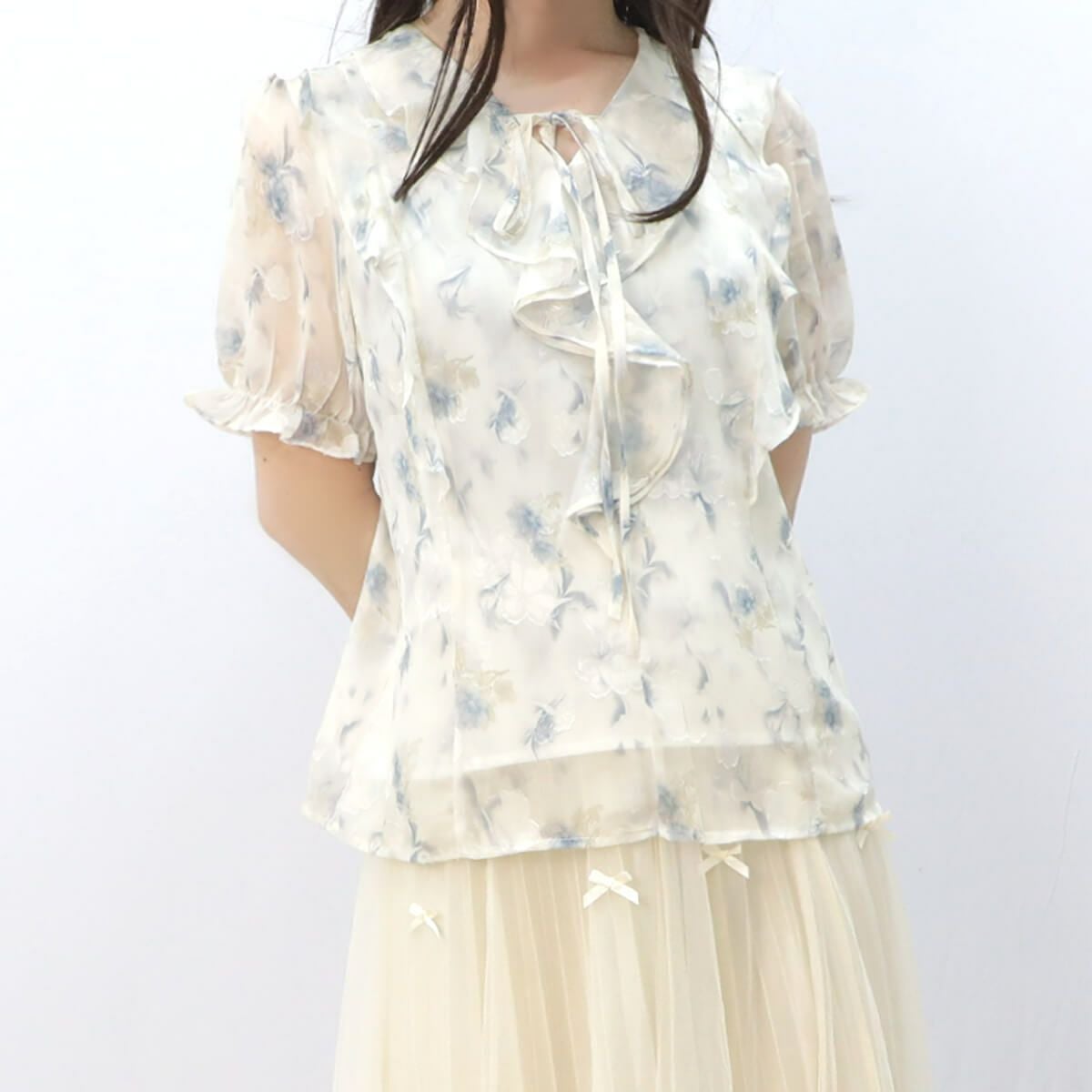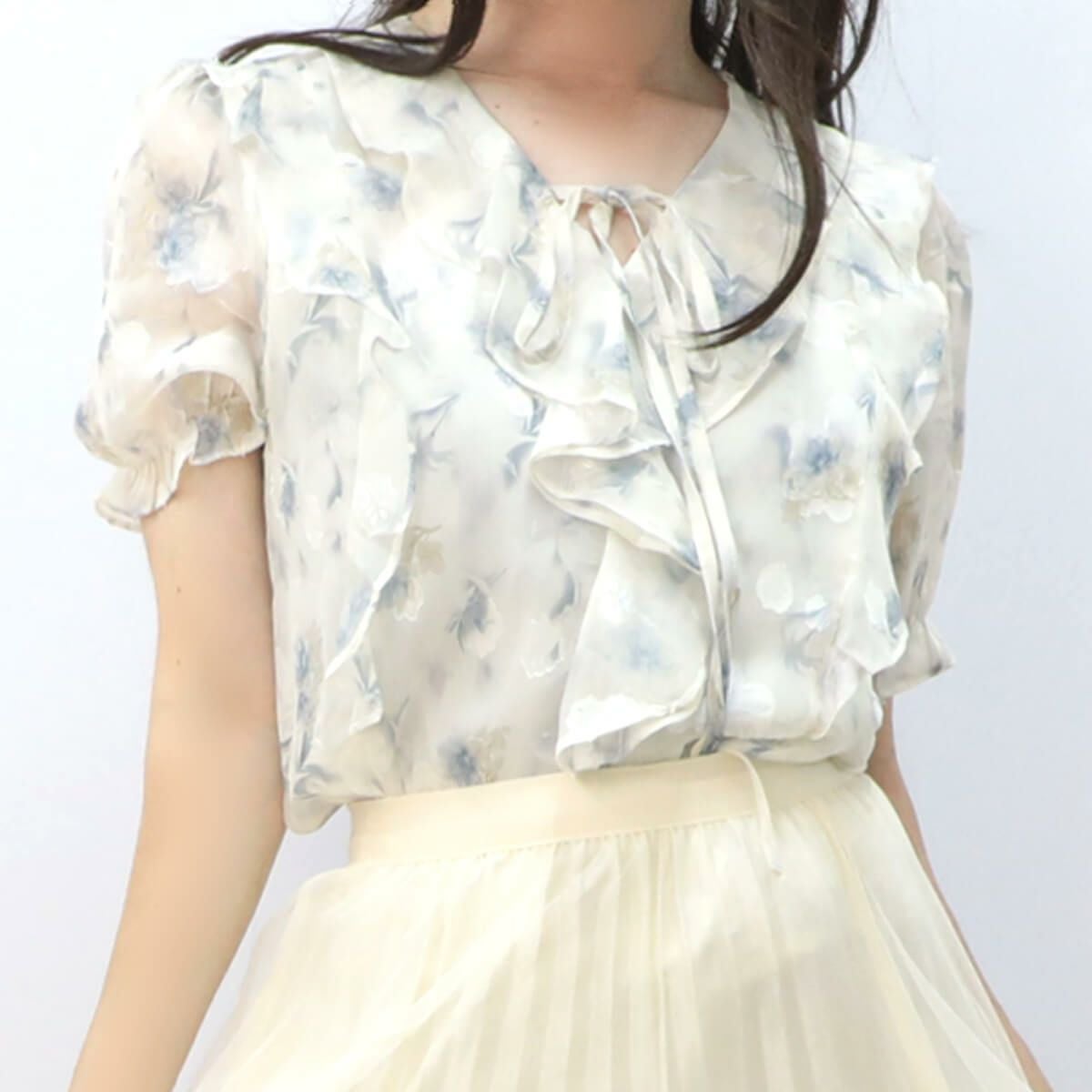 フリル花柄シアー半袖ブラウス フリーサイズ