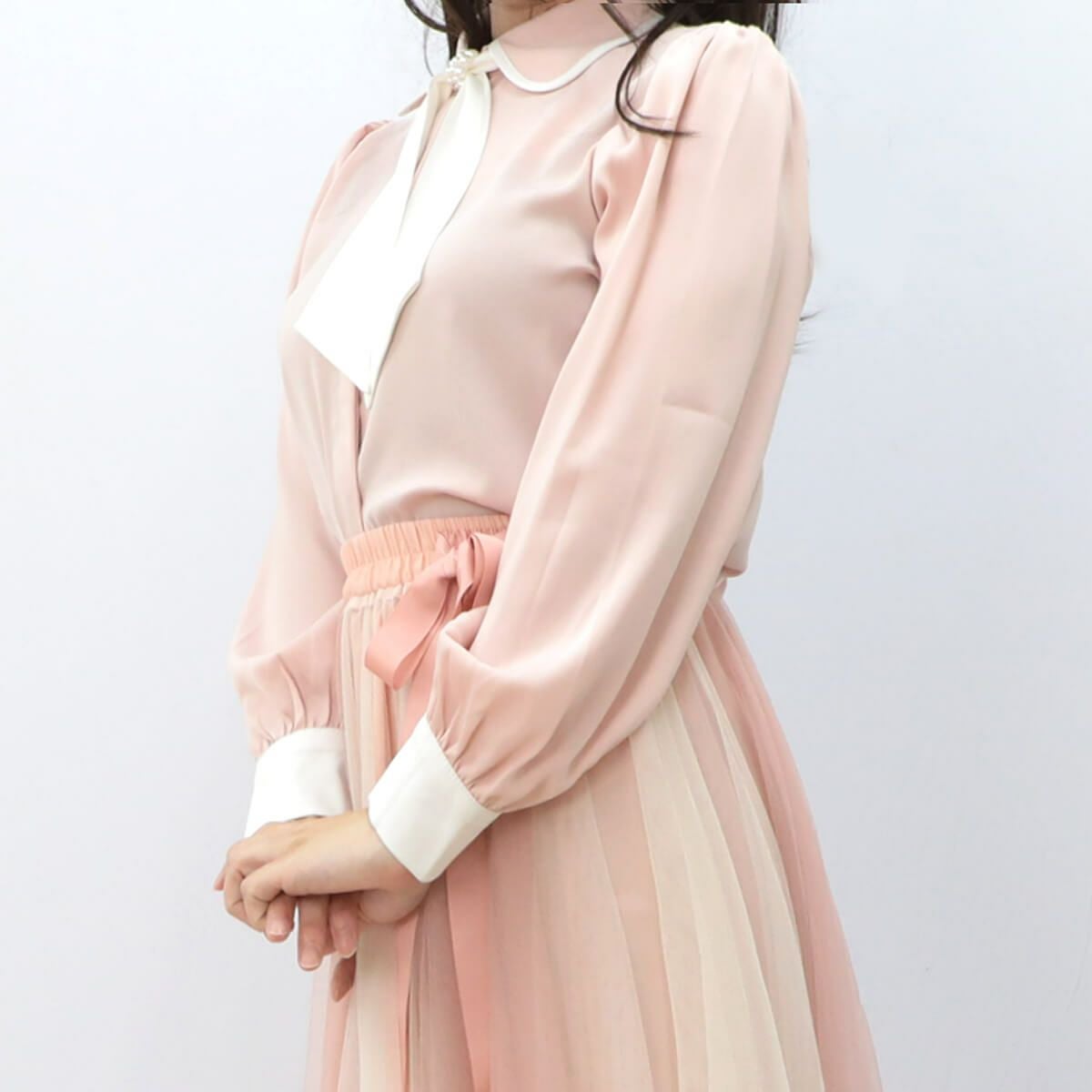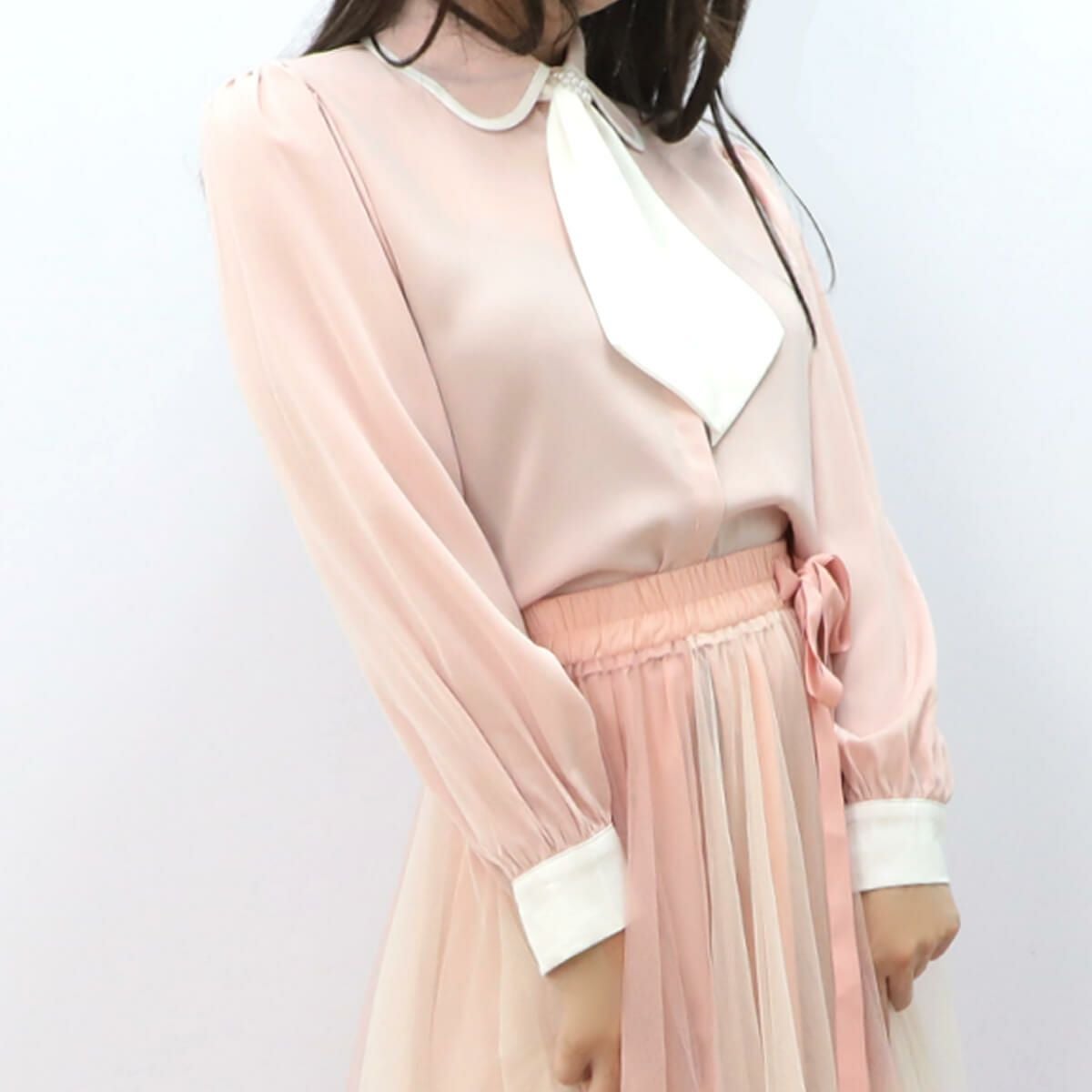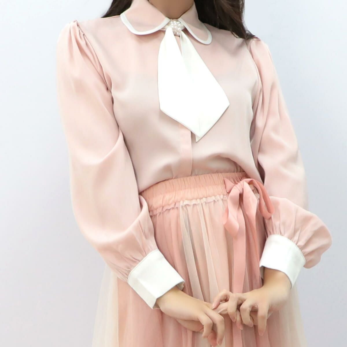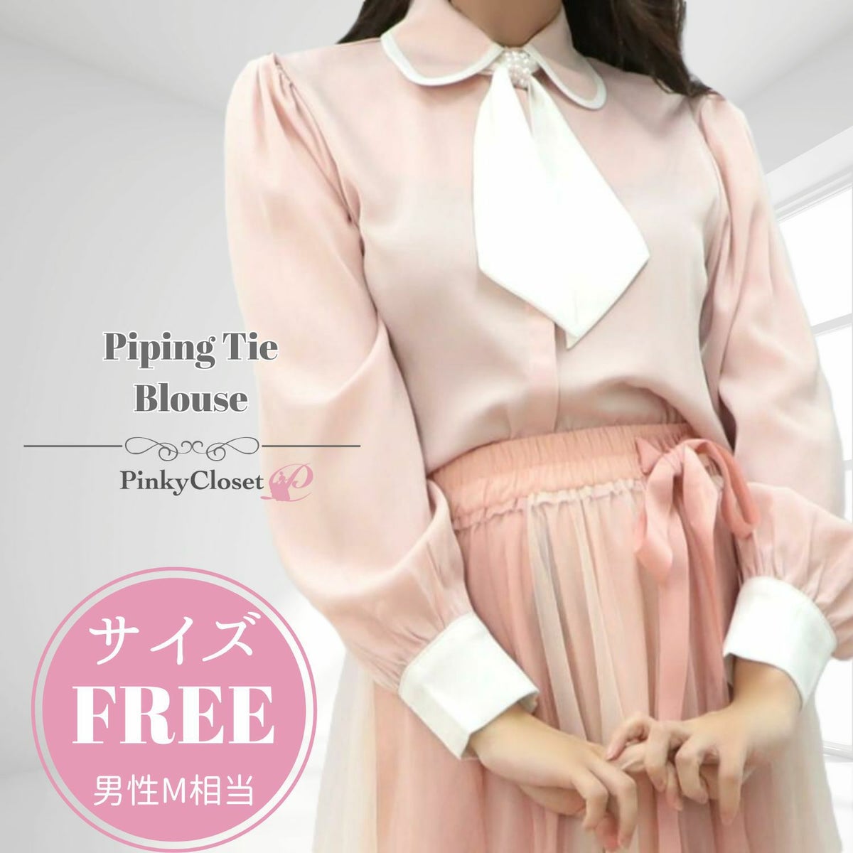 パイピングリボン長袖ブラウス ピンク フリーサイズ
