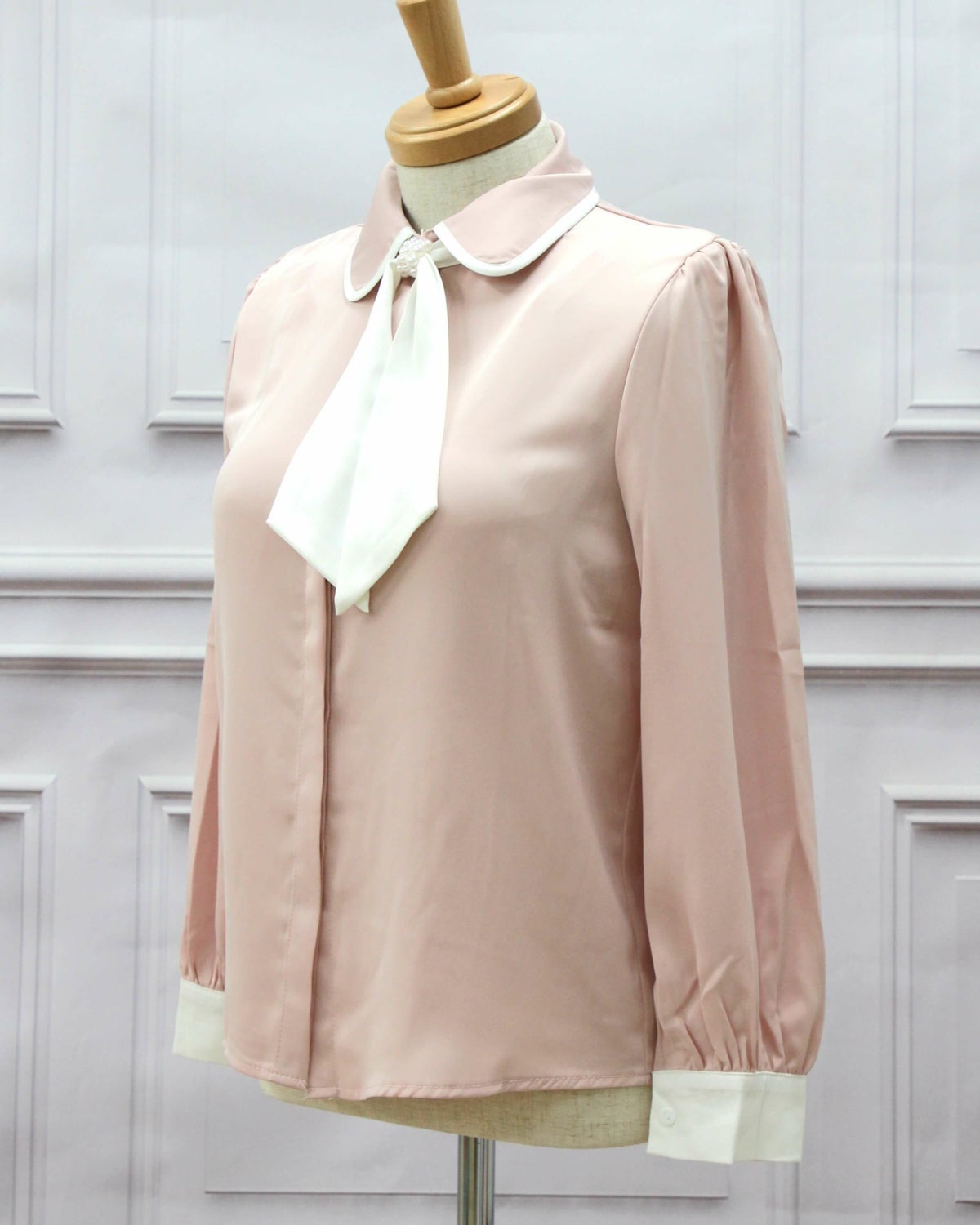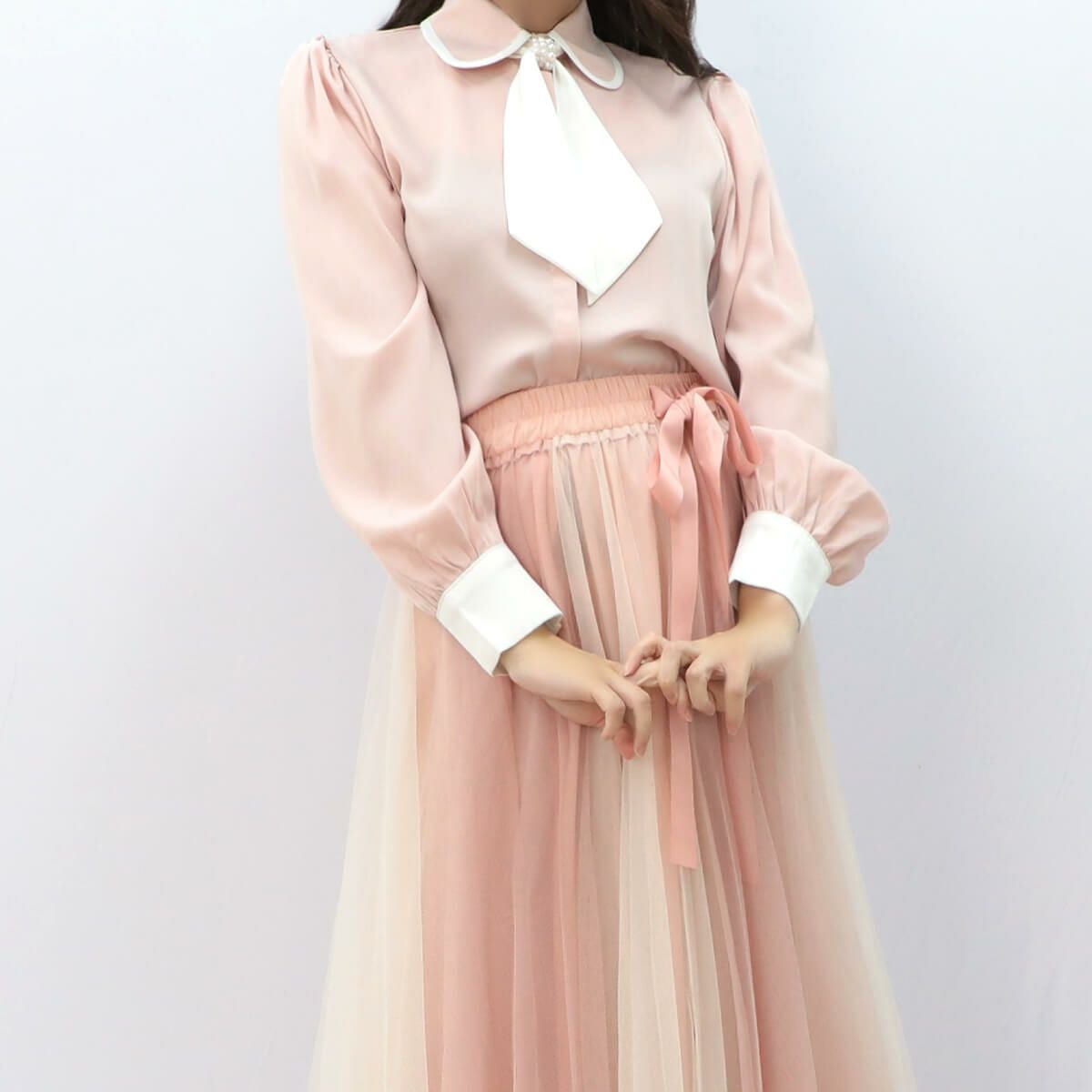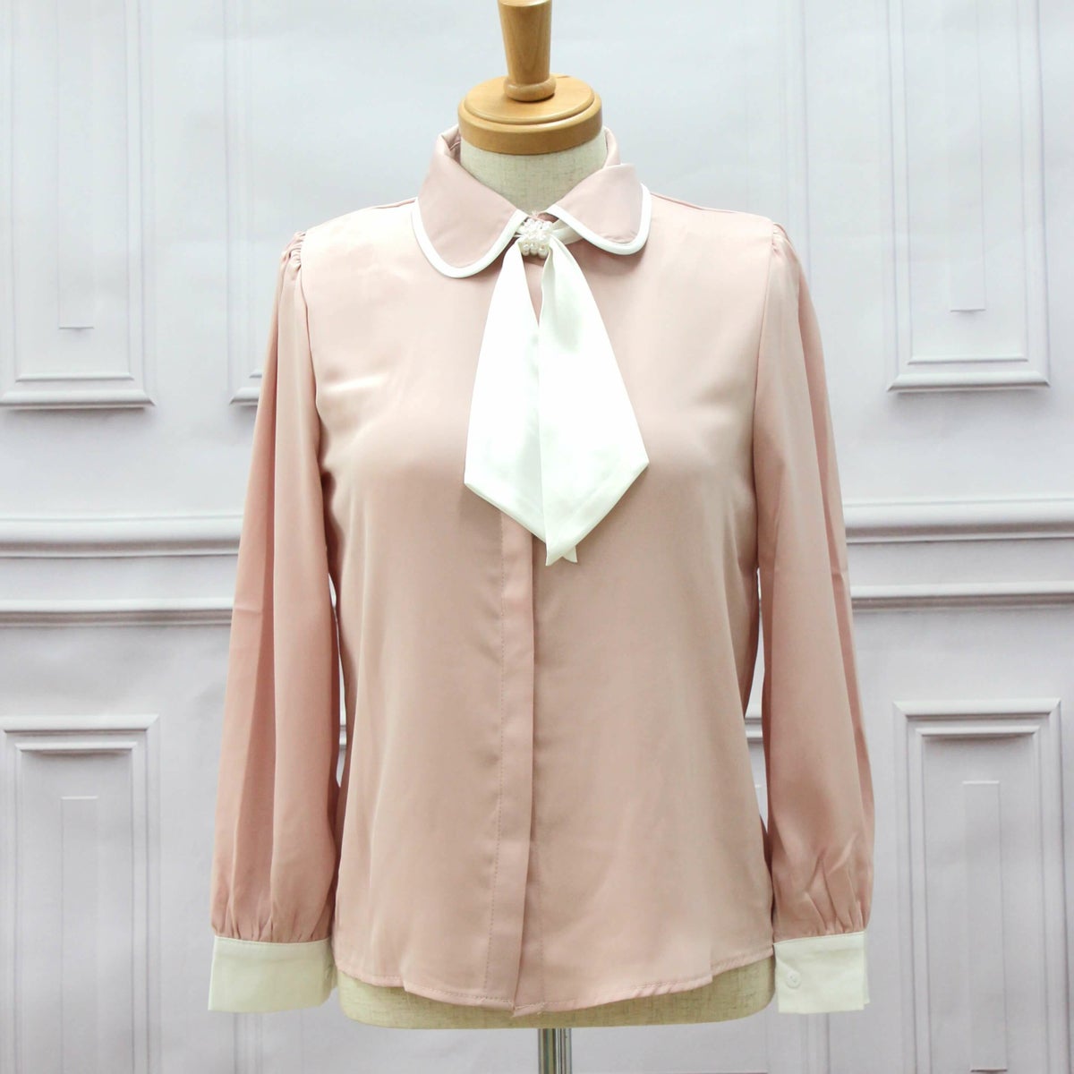 パイピングリボン長袖ブラウス ピンク フリーサイズ