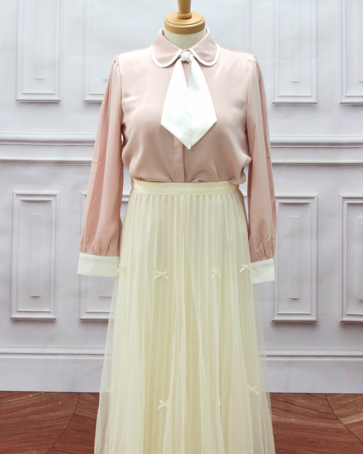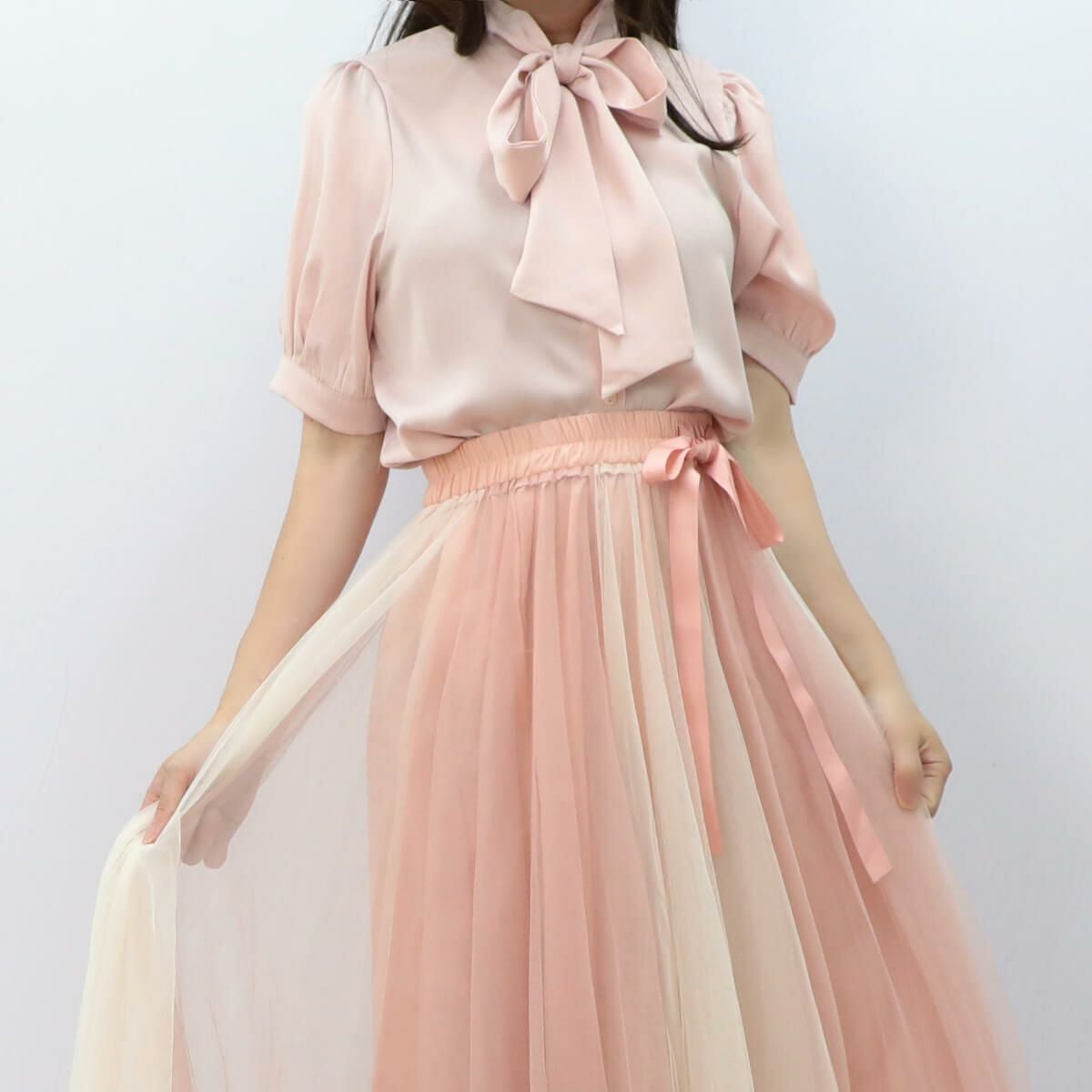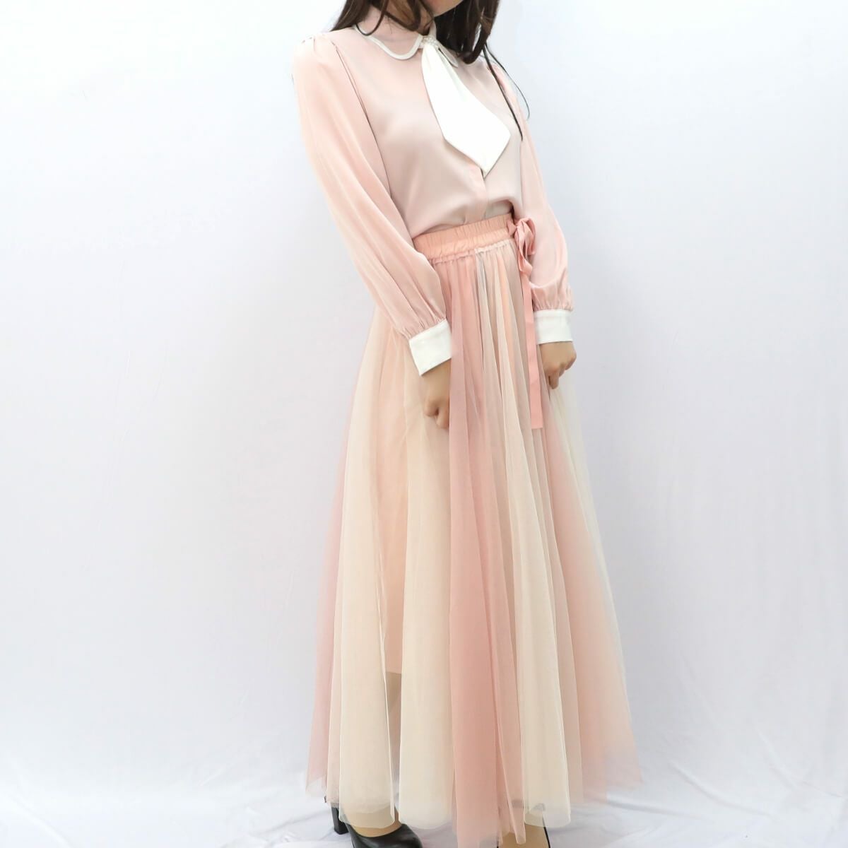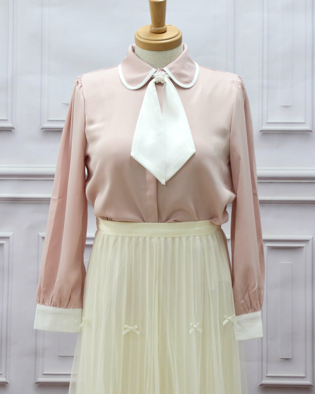 パイピングリボン長袖ブラウス ピンク フリーサイズ