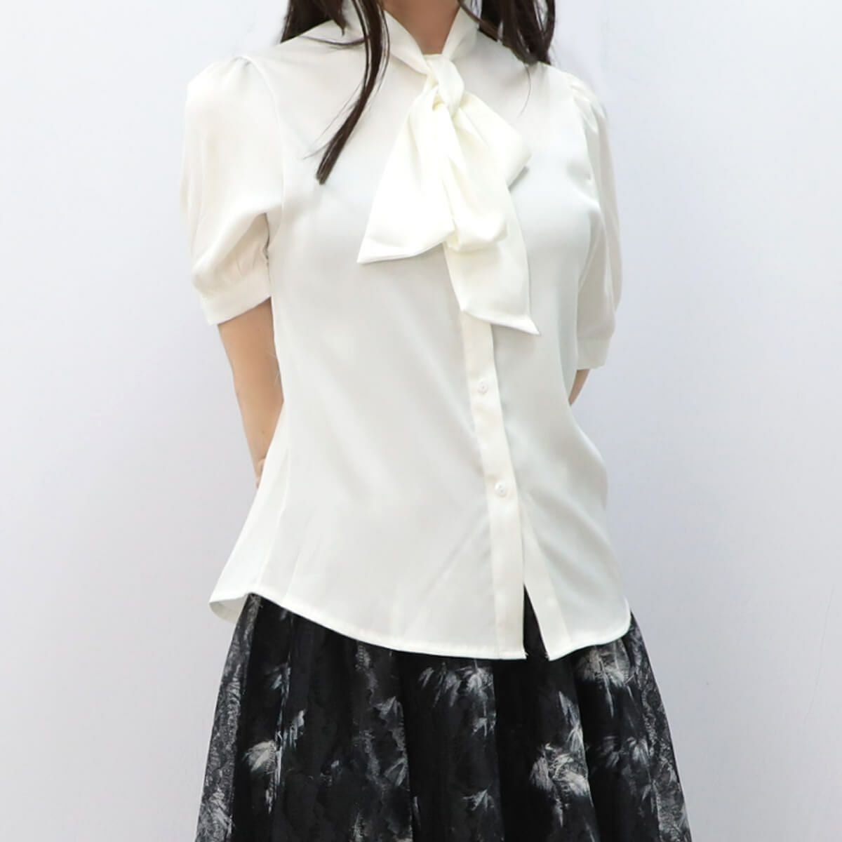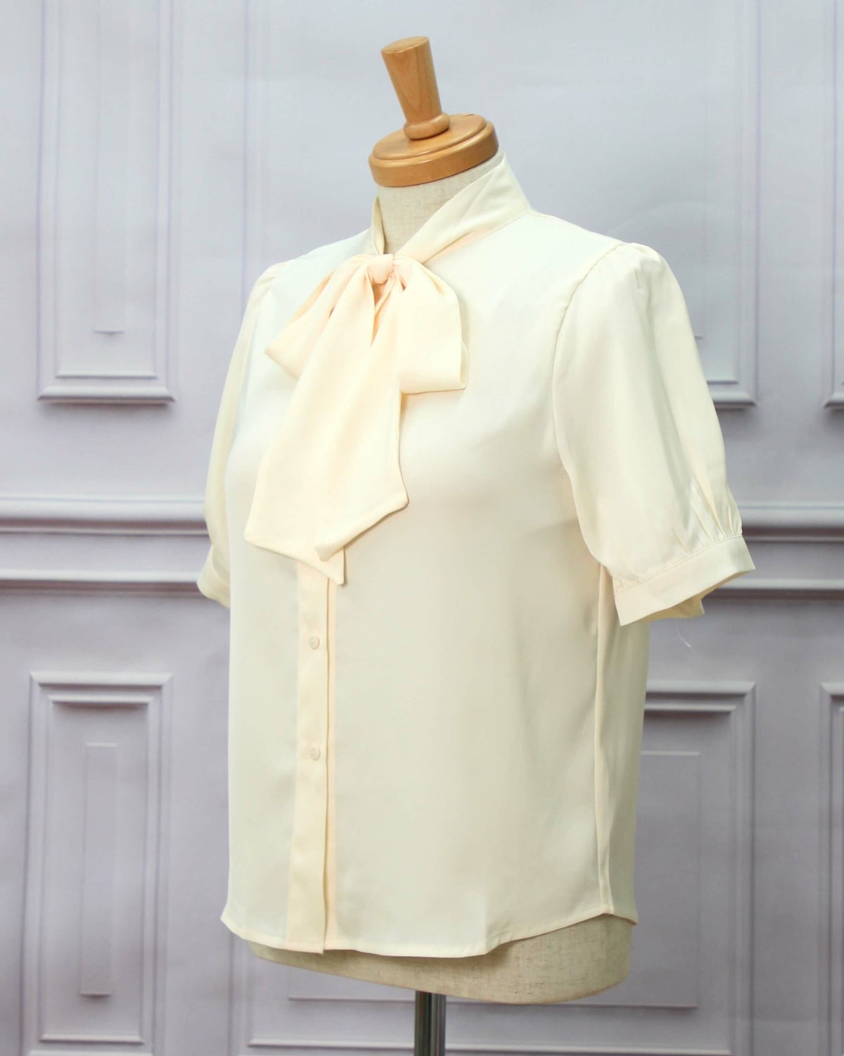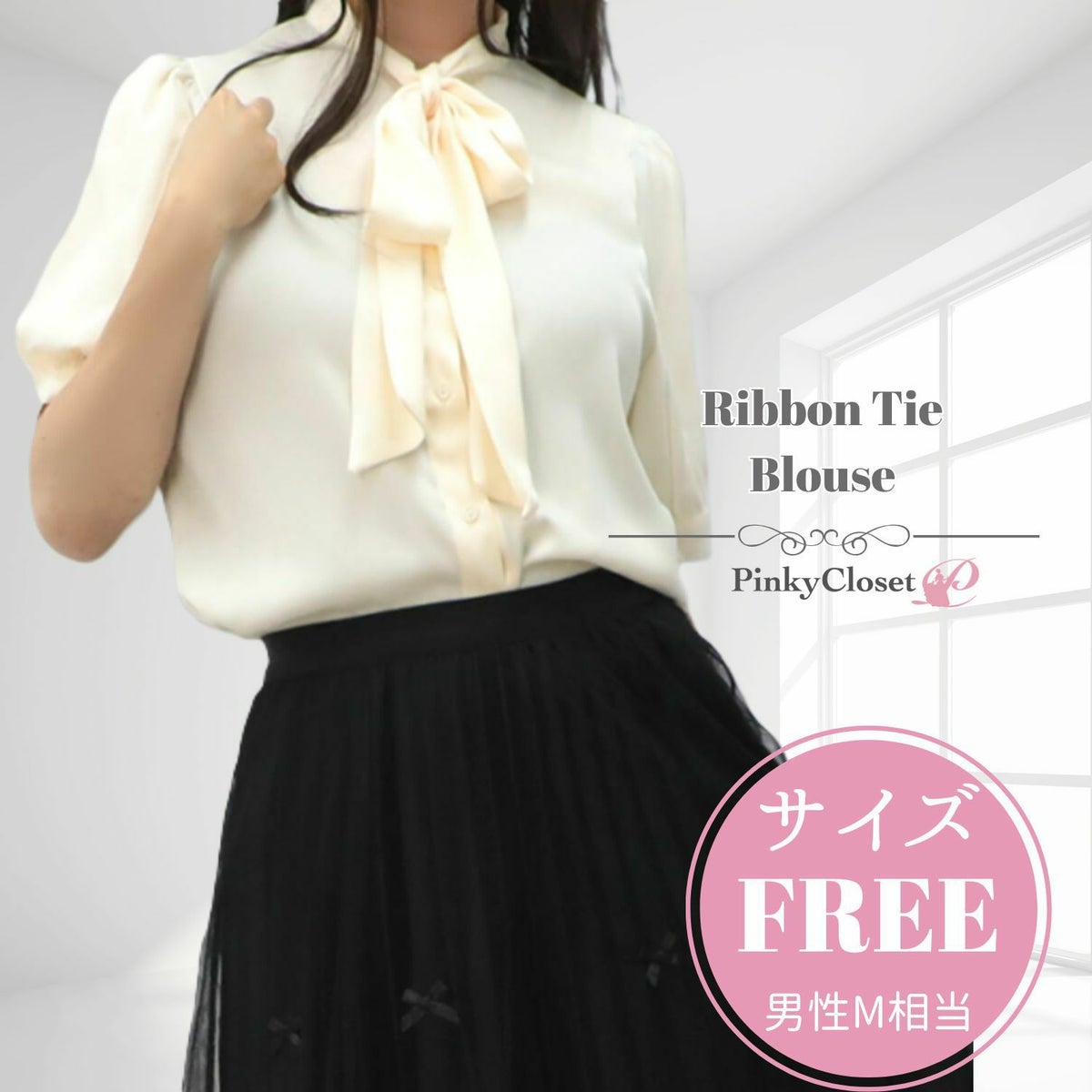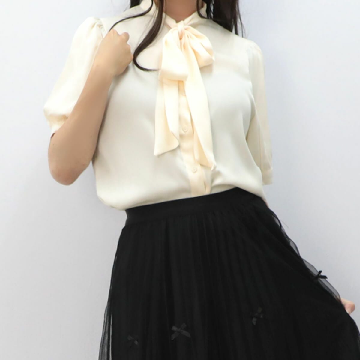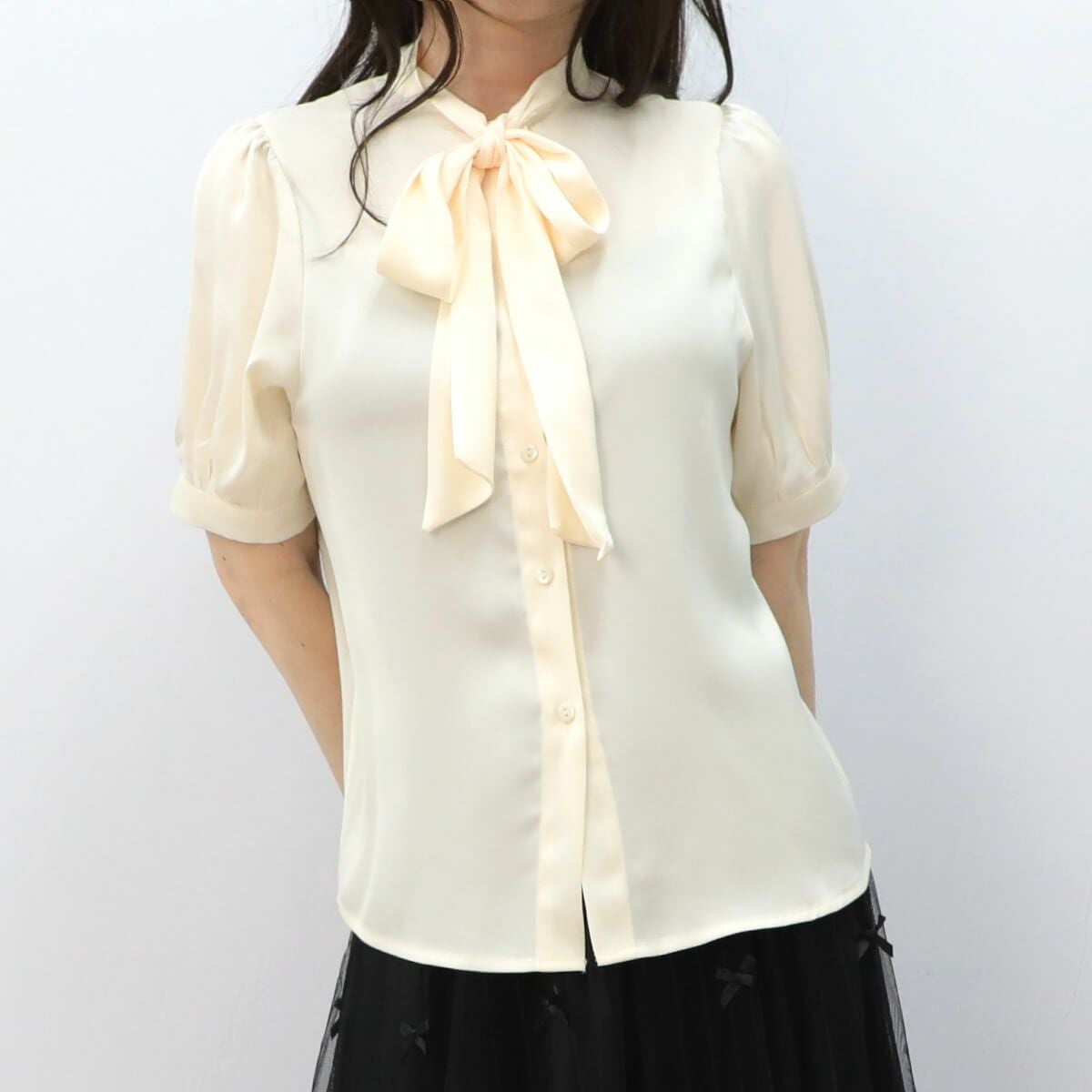 シンプルリボンタイ半袖ブラウス クリーム フリーサイズ