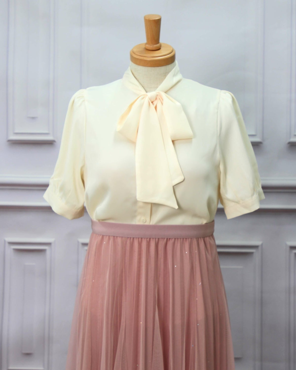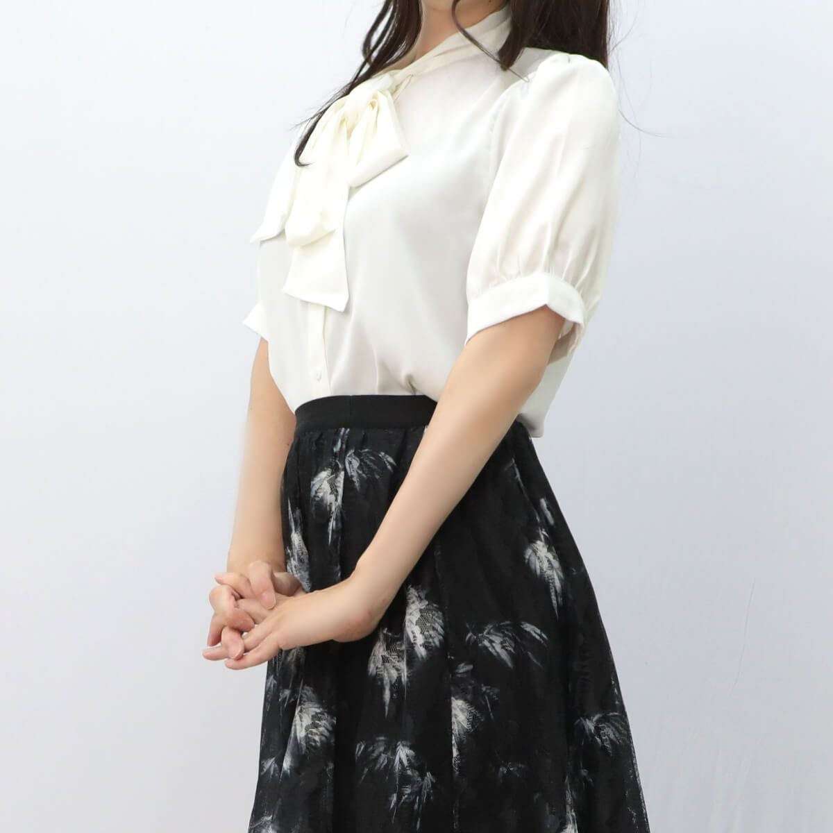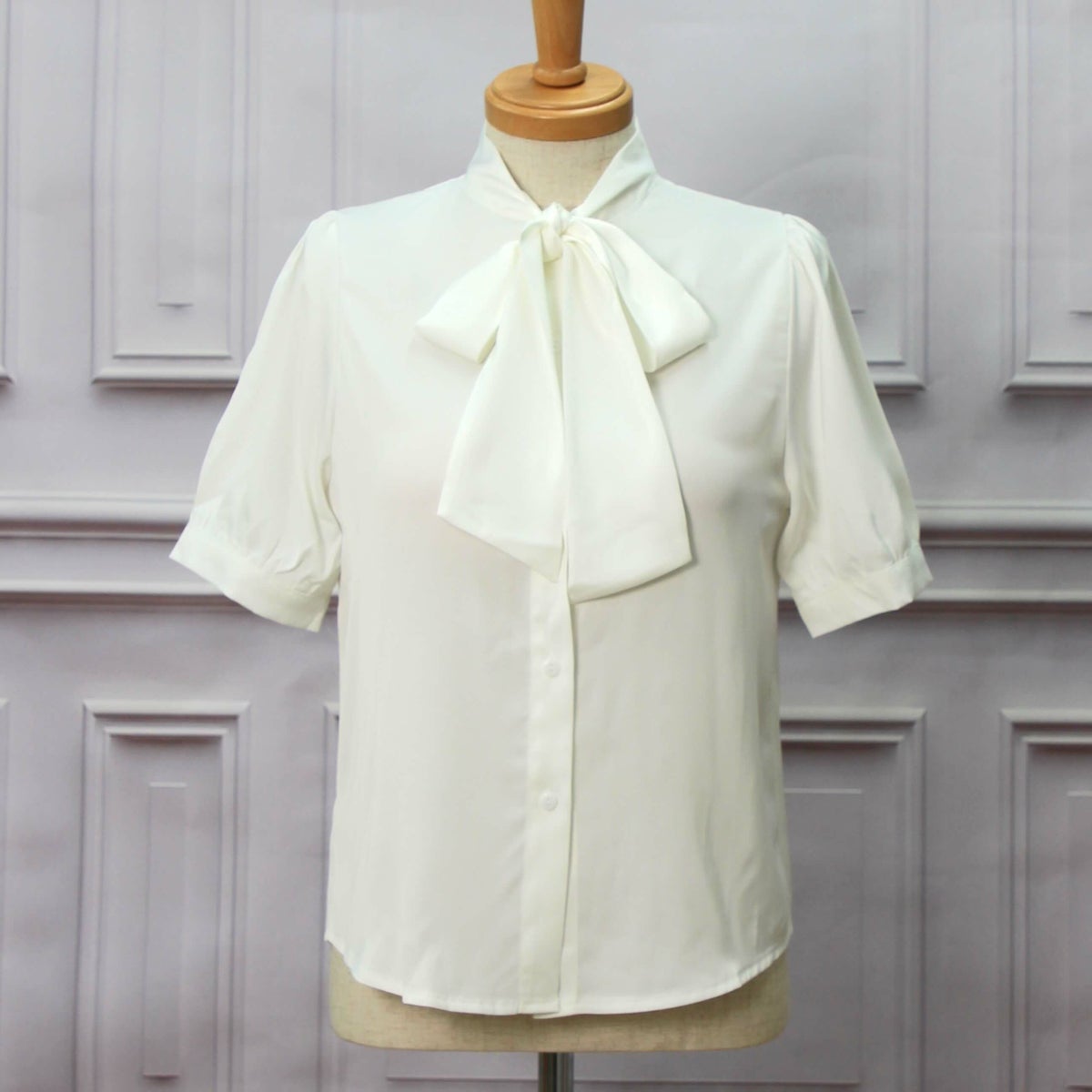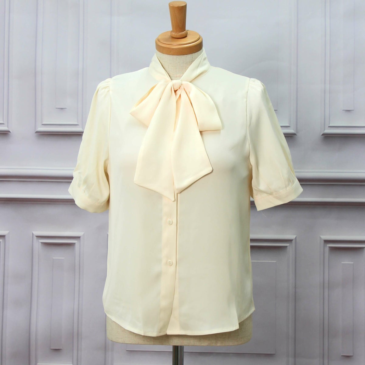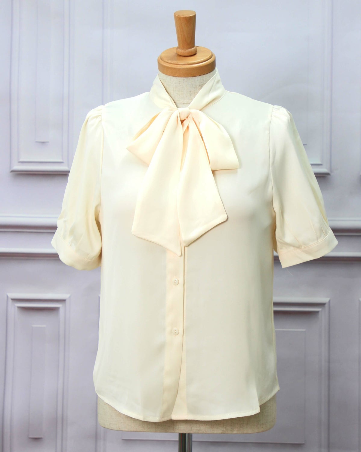 シンプルリボンタイ半袖ブラウス クリーム フリーサイズ