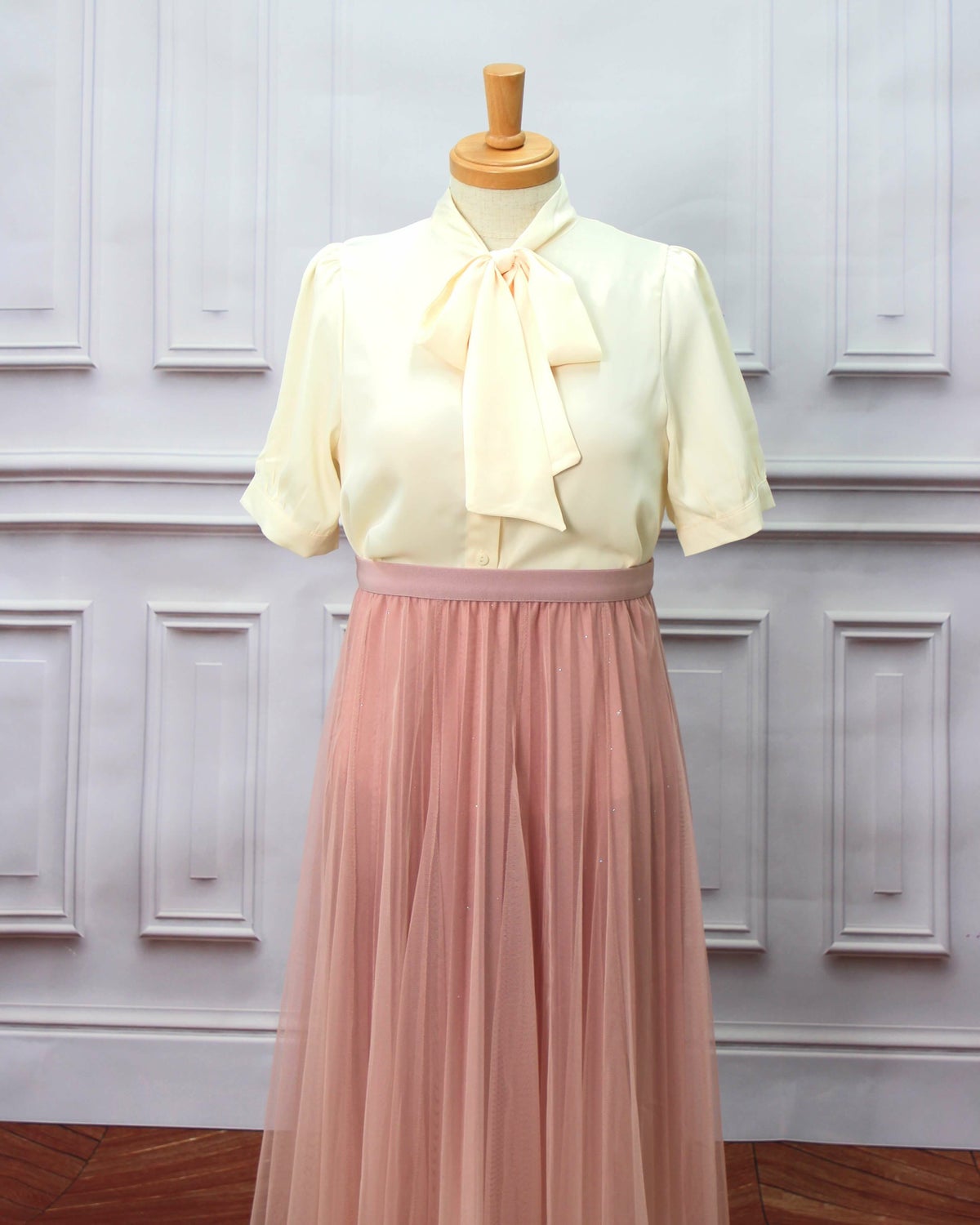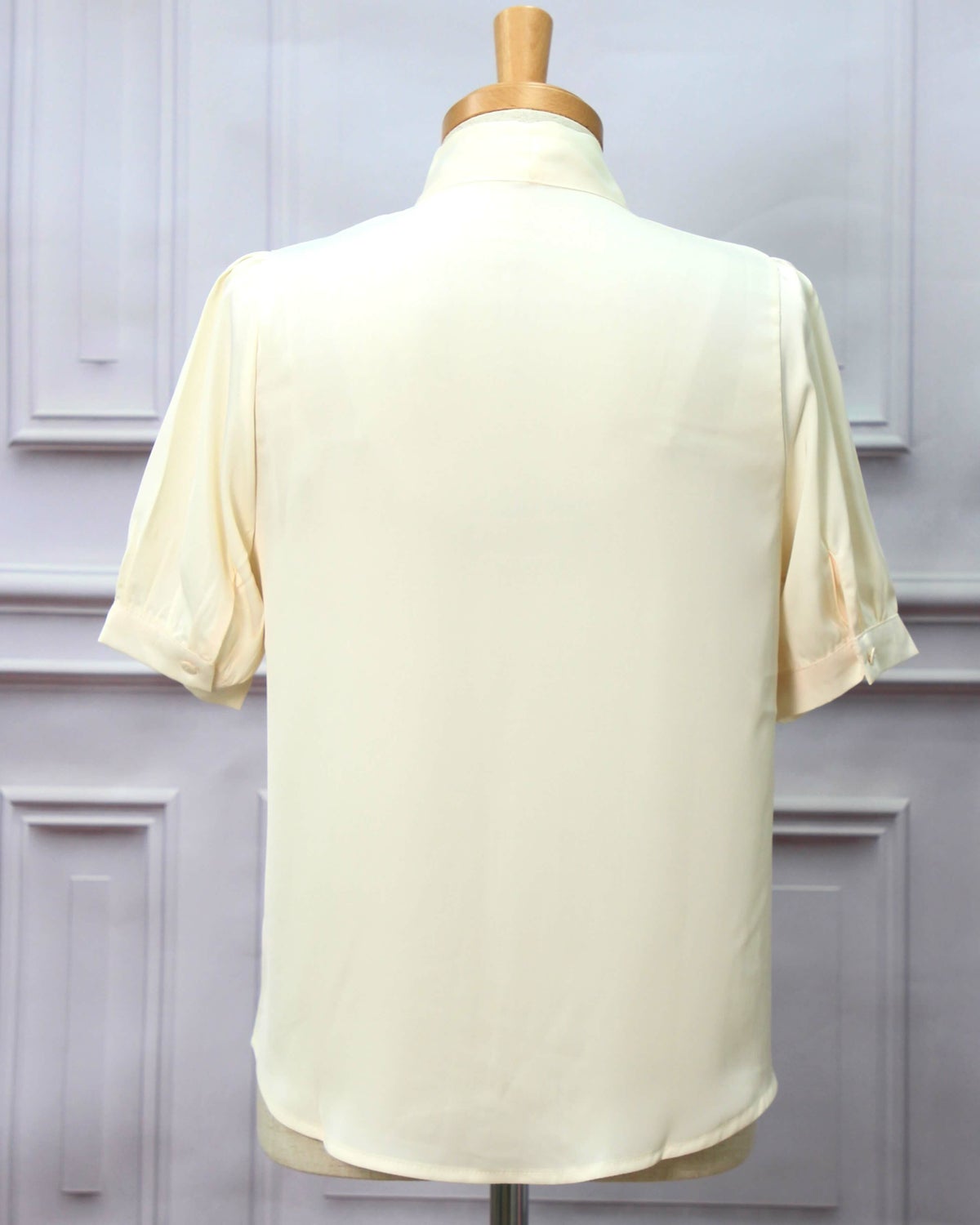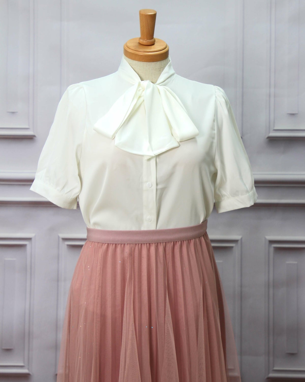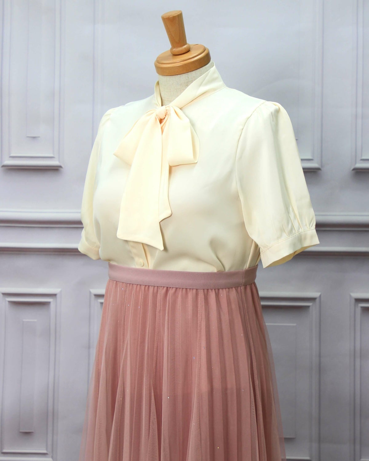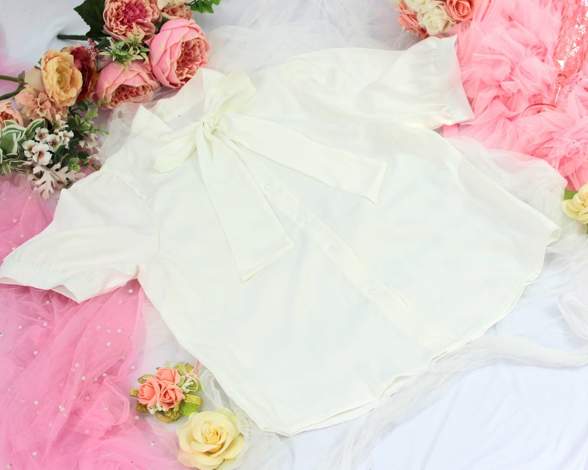 シンプルリボンタイ半袖ブラウス クリーム フリーサイズ