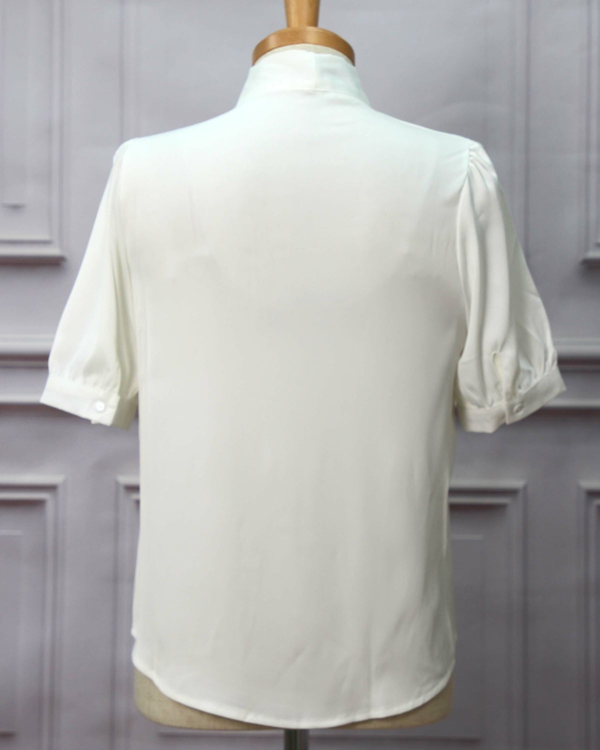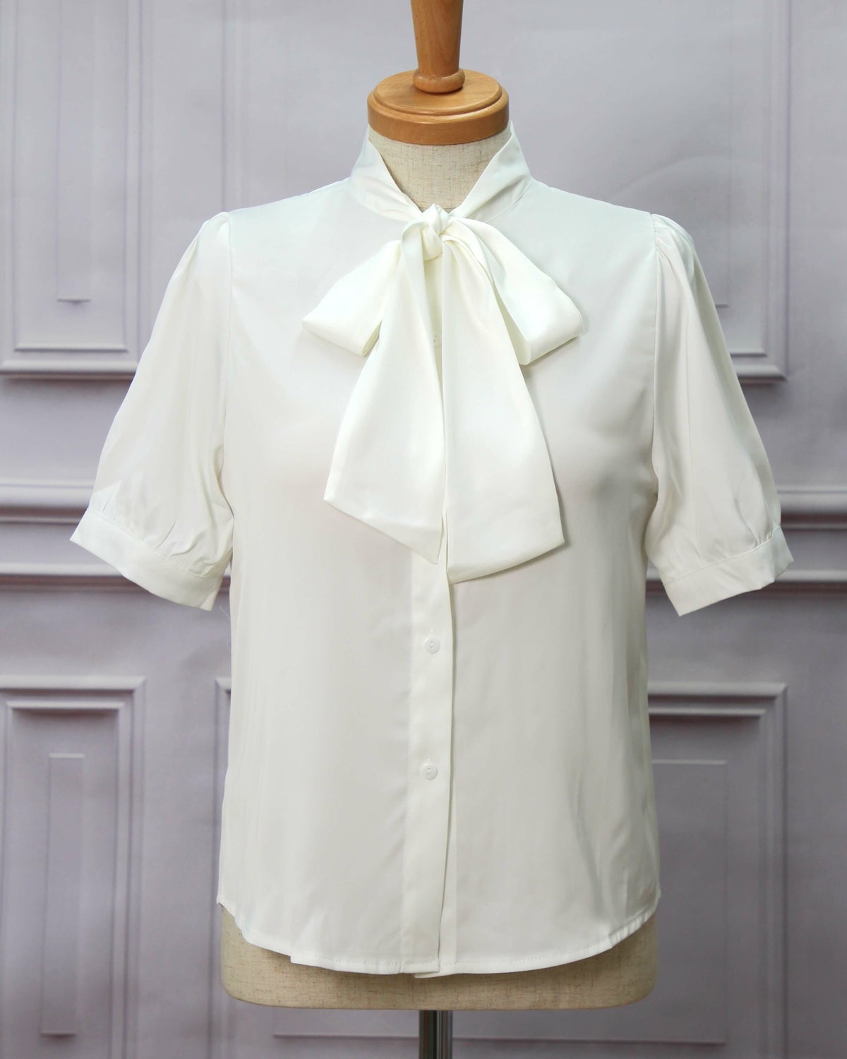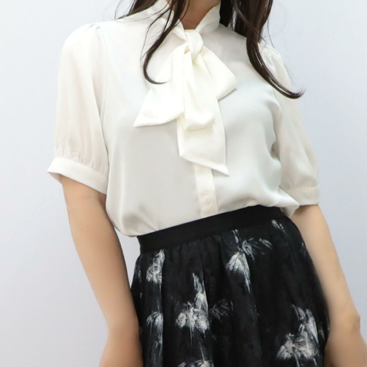 シンプルリボンタイ半袖ブラウス 白 フリーサイズ