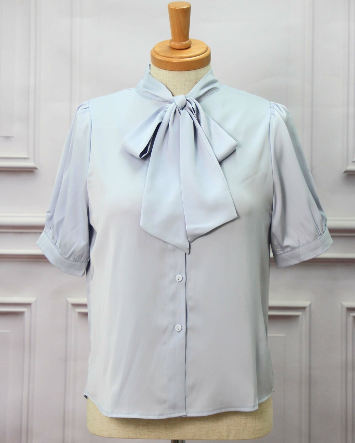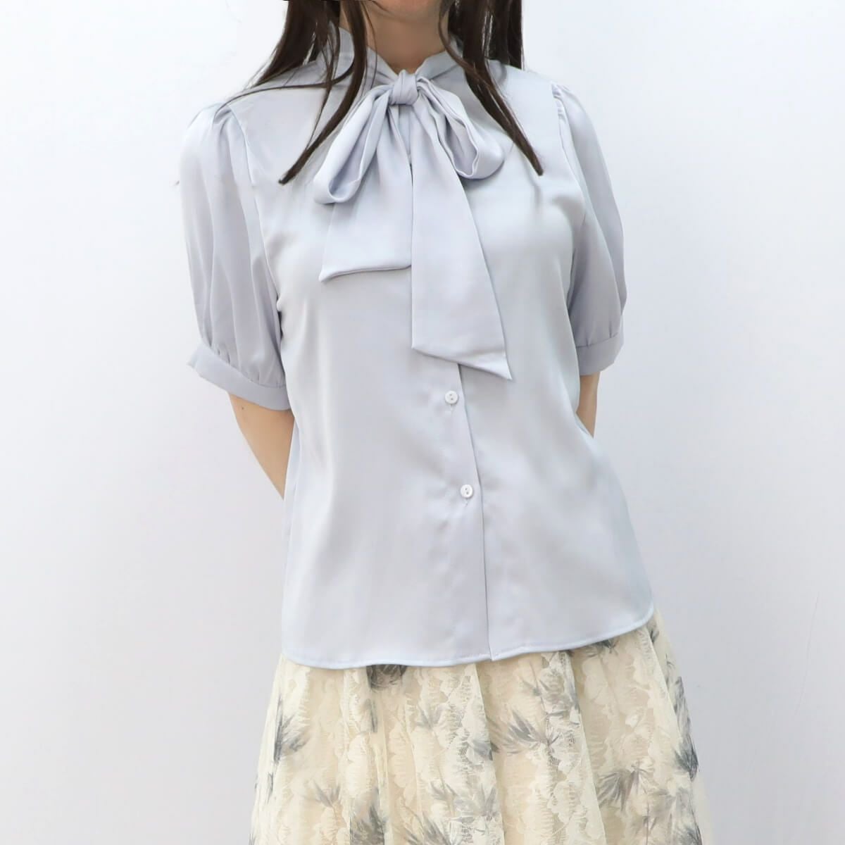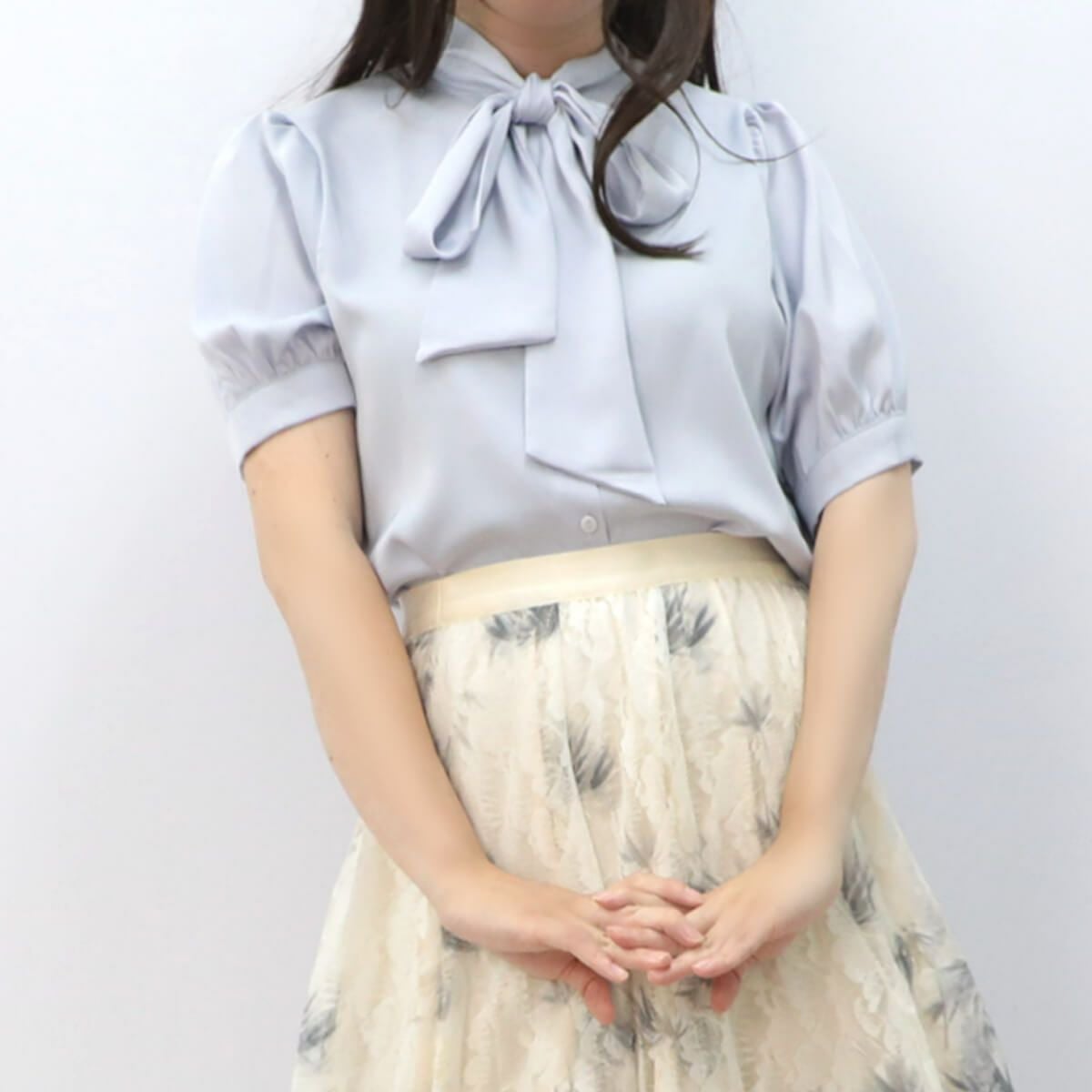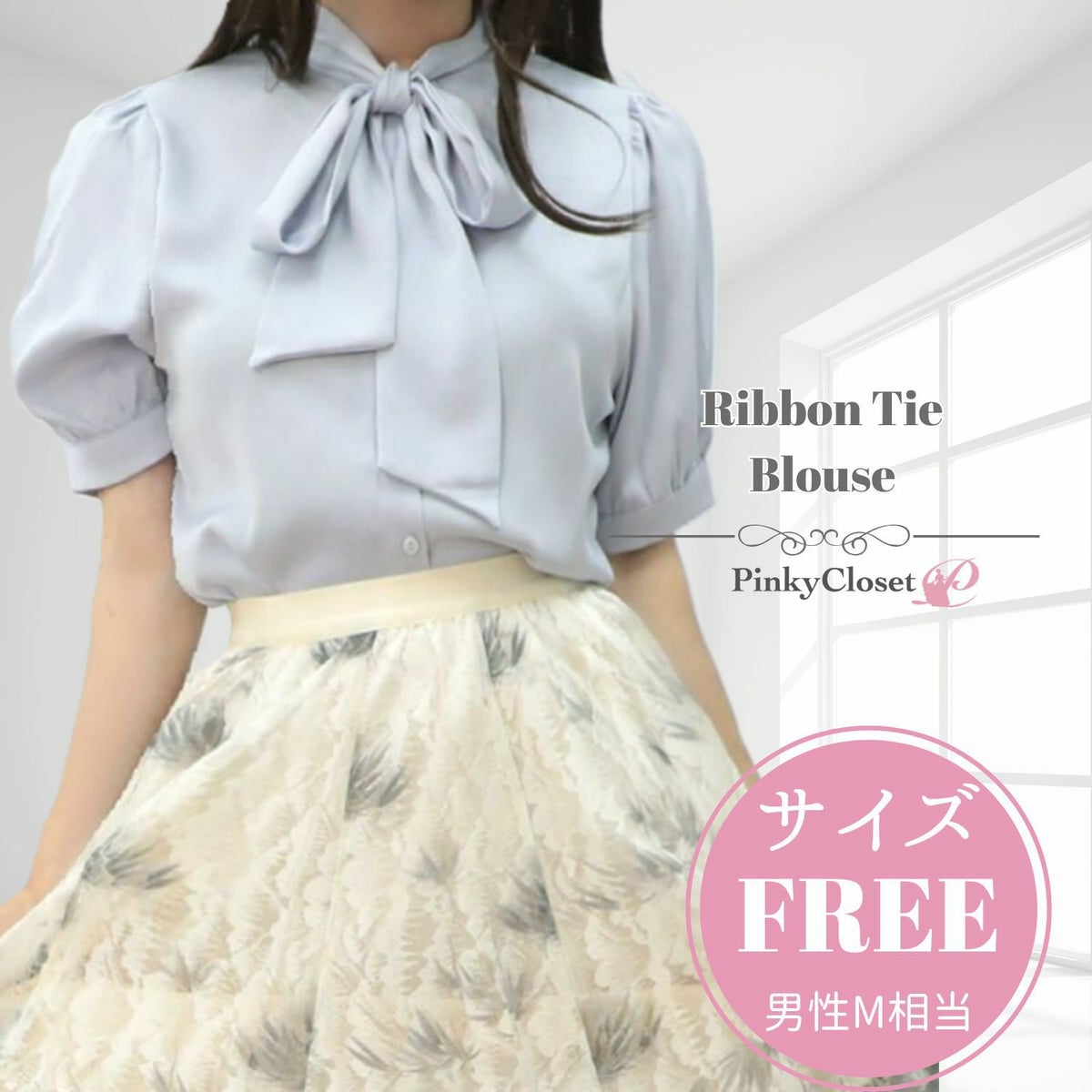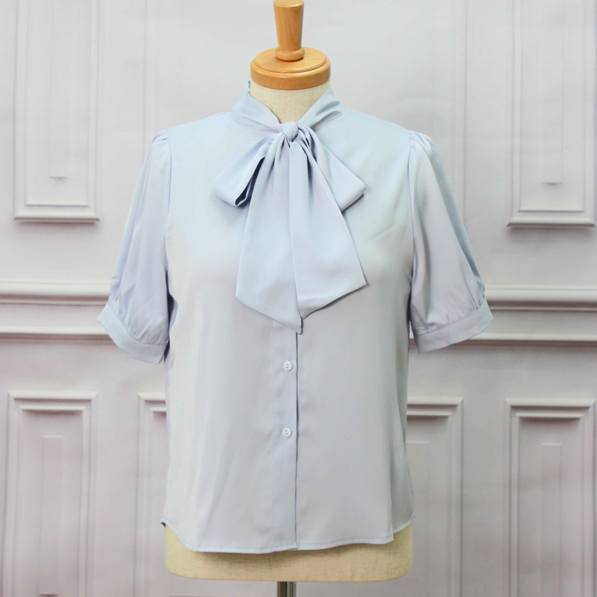 シンプルリボンタイ半袖ブラウス 水色 フリーサイズ