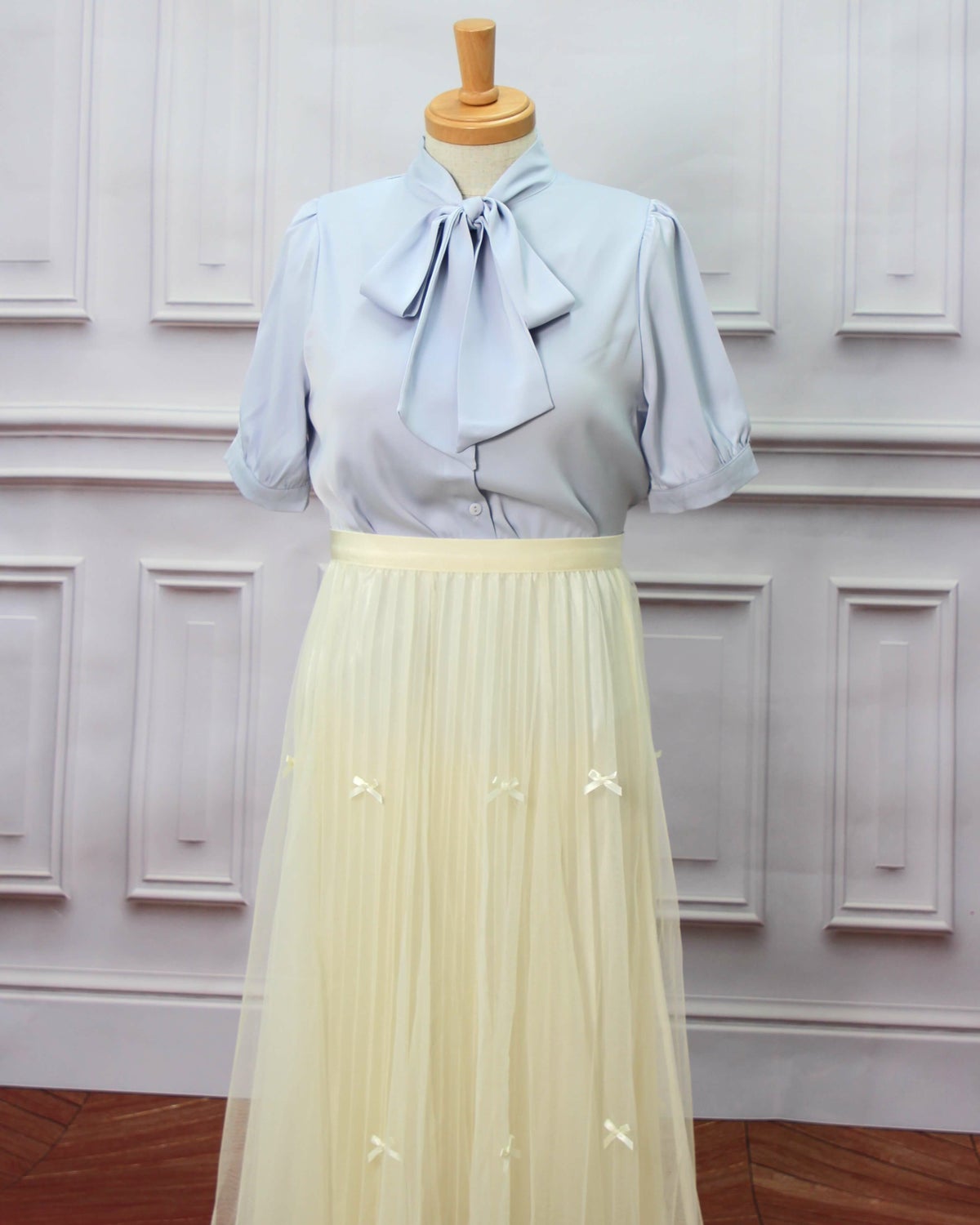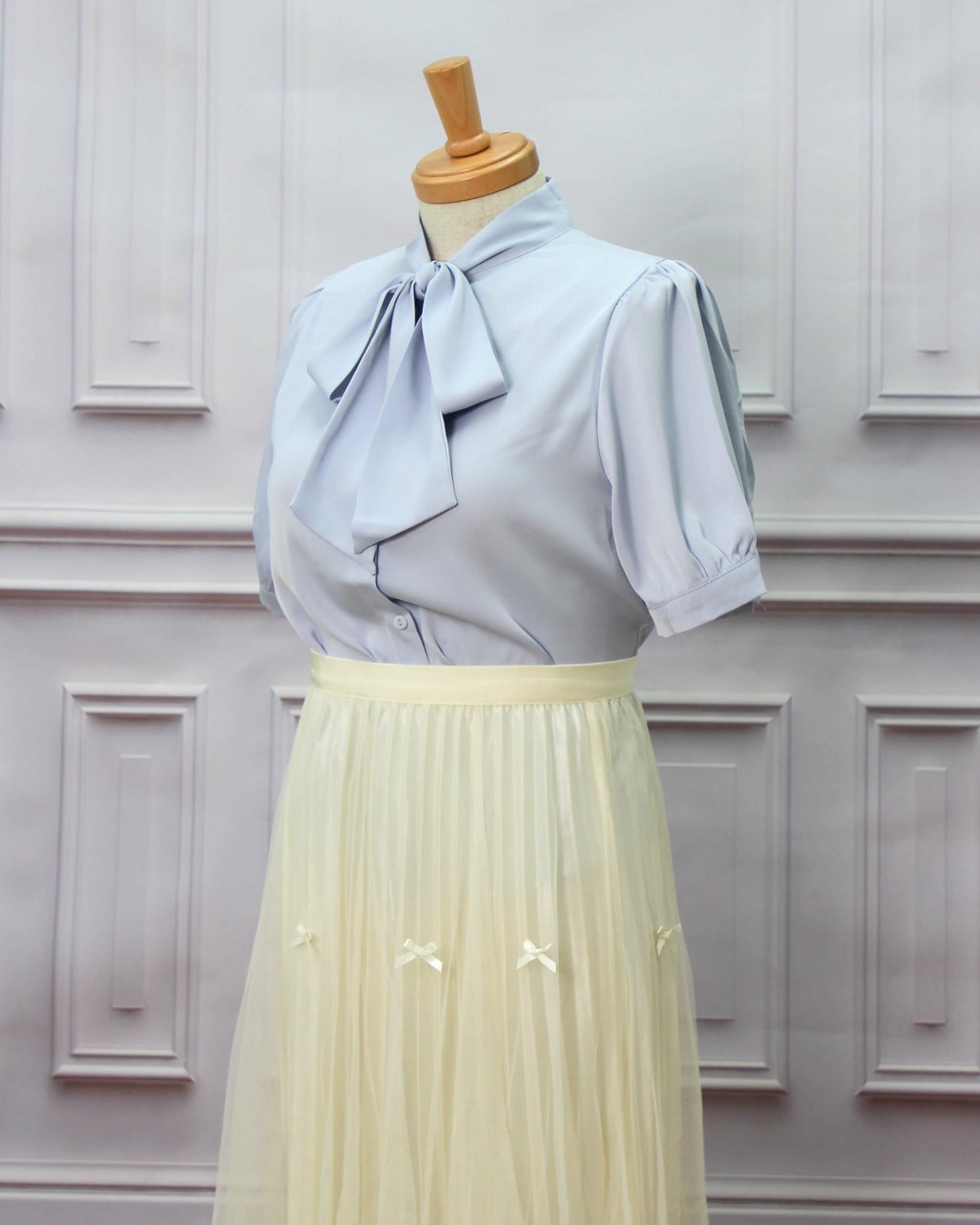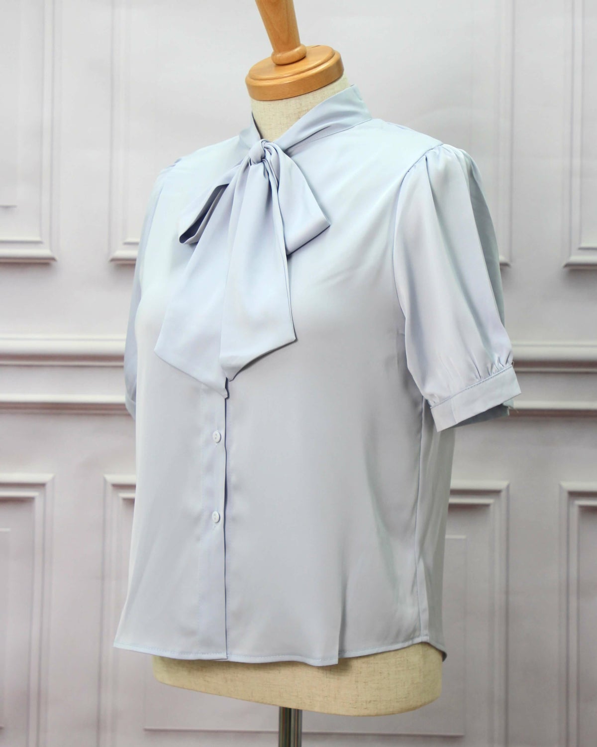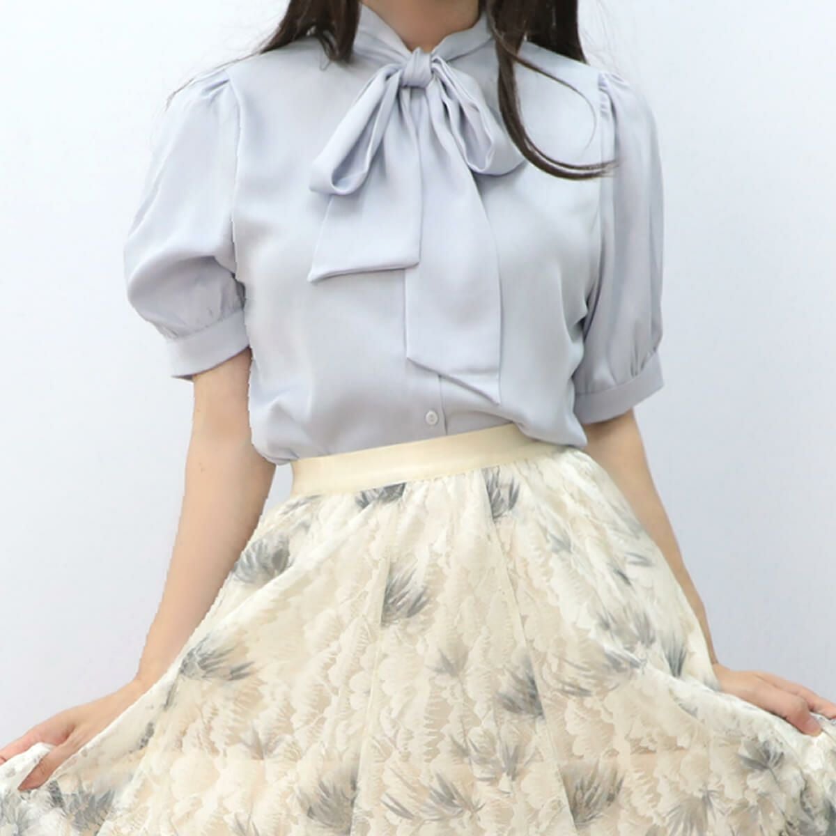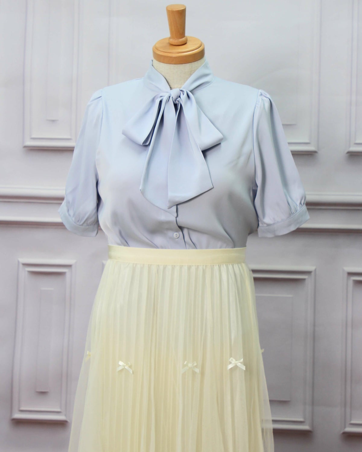 シンプルリボンタイ半袖ブラウス 水色 フリーサイズ