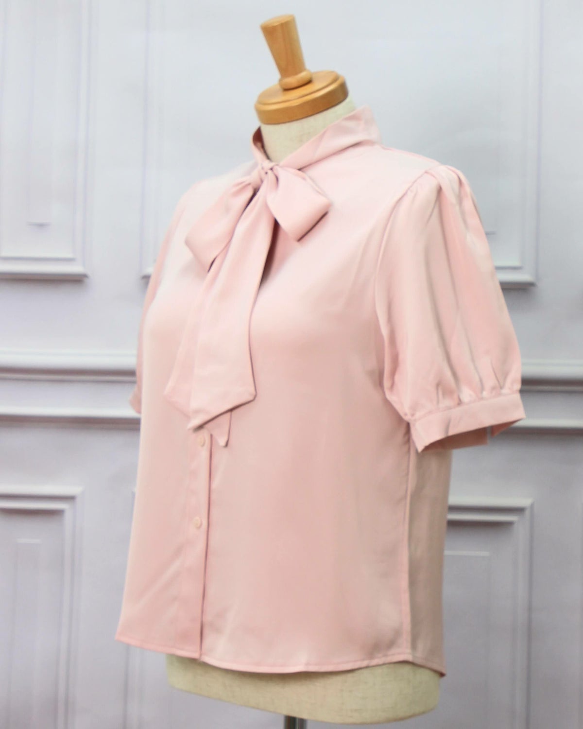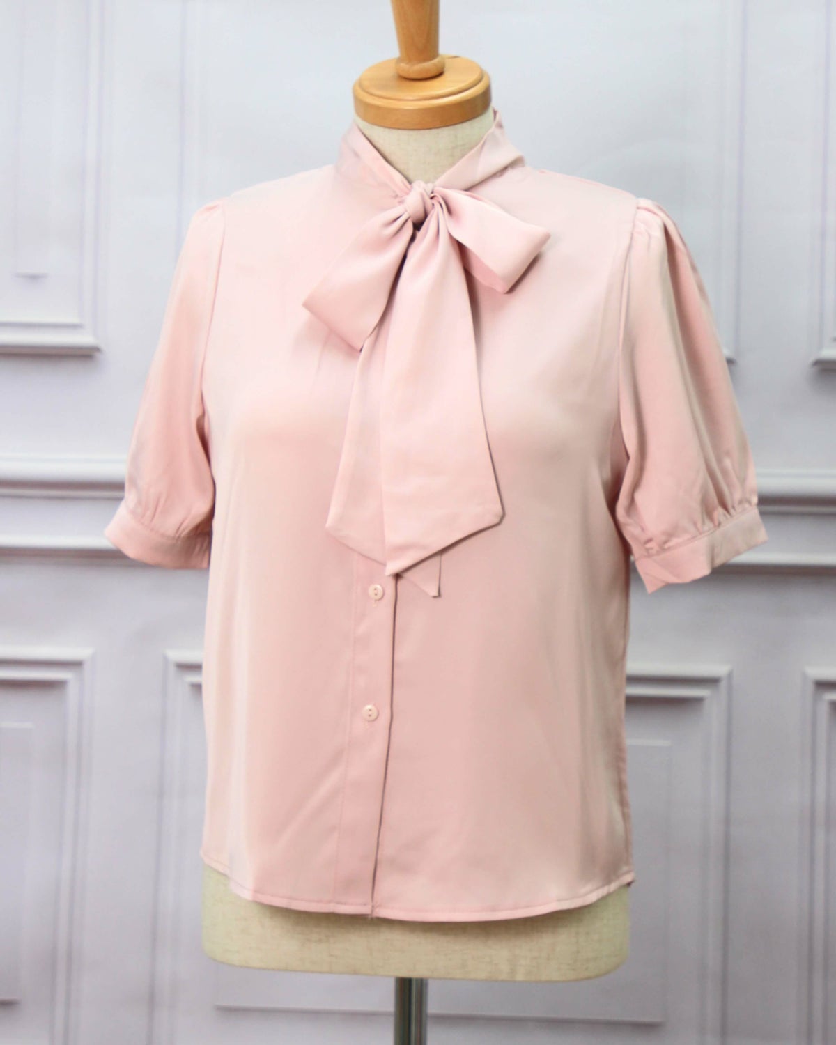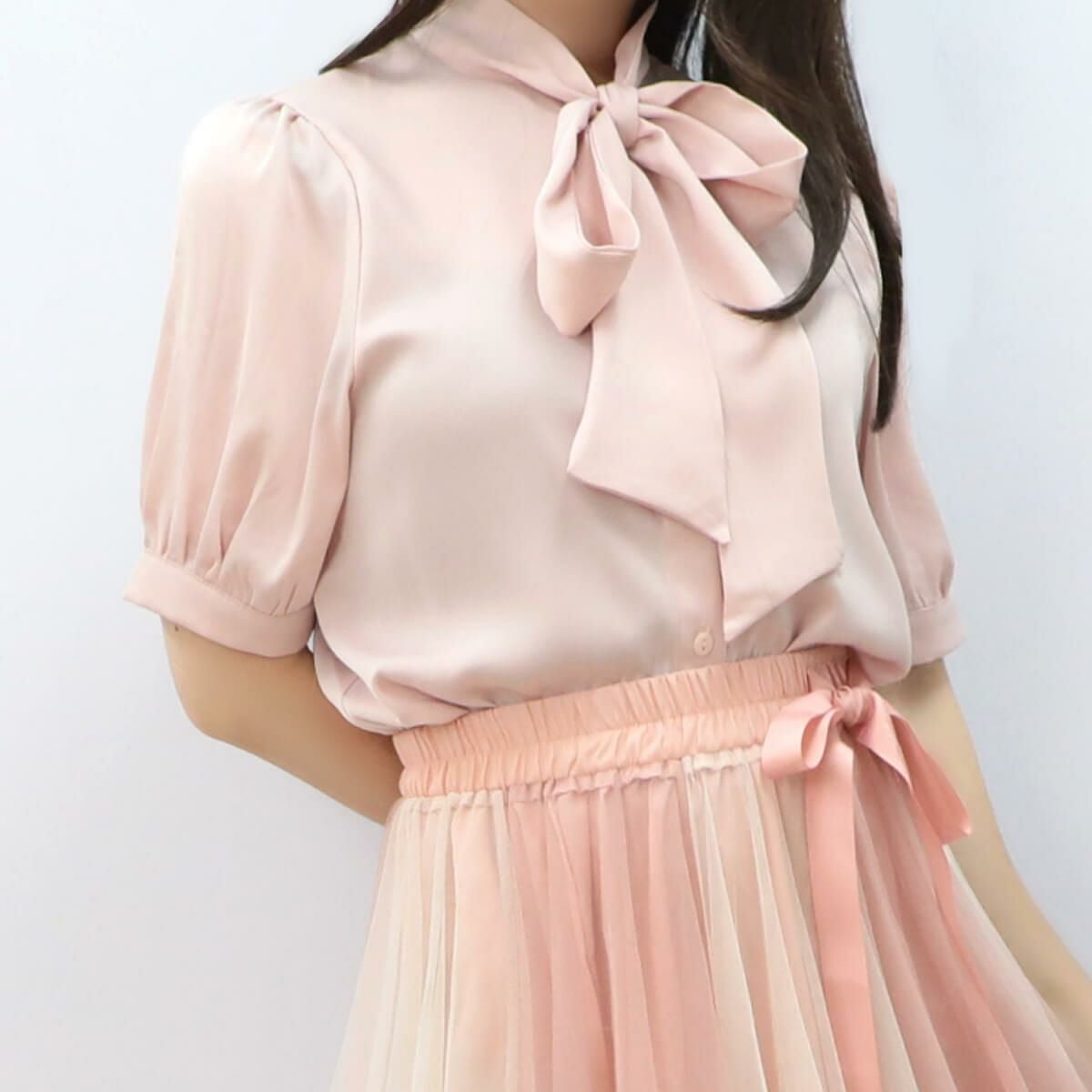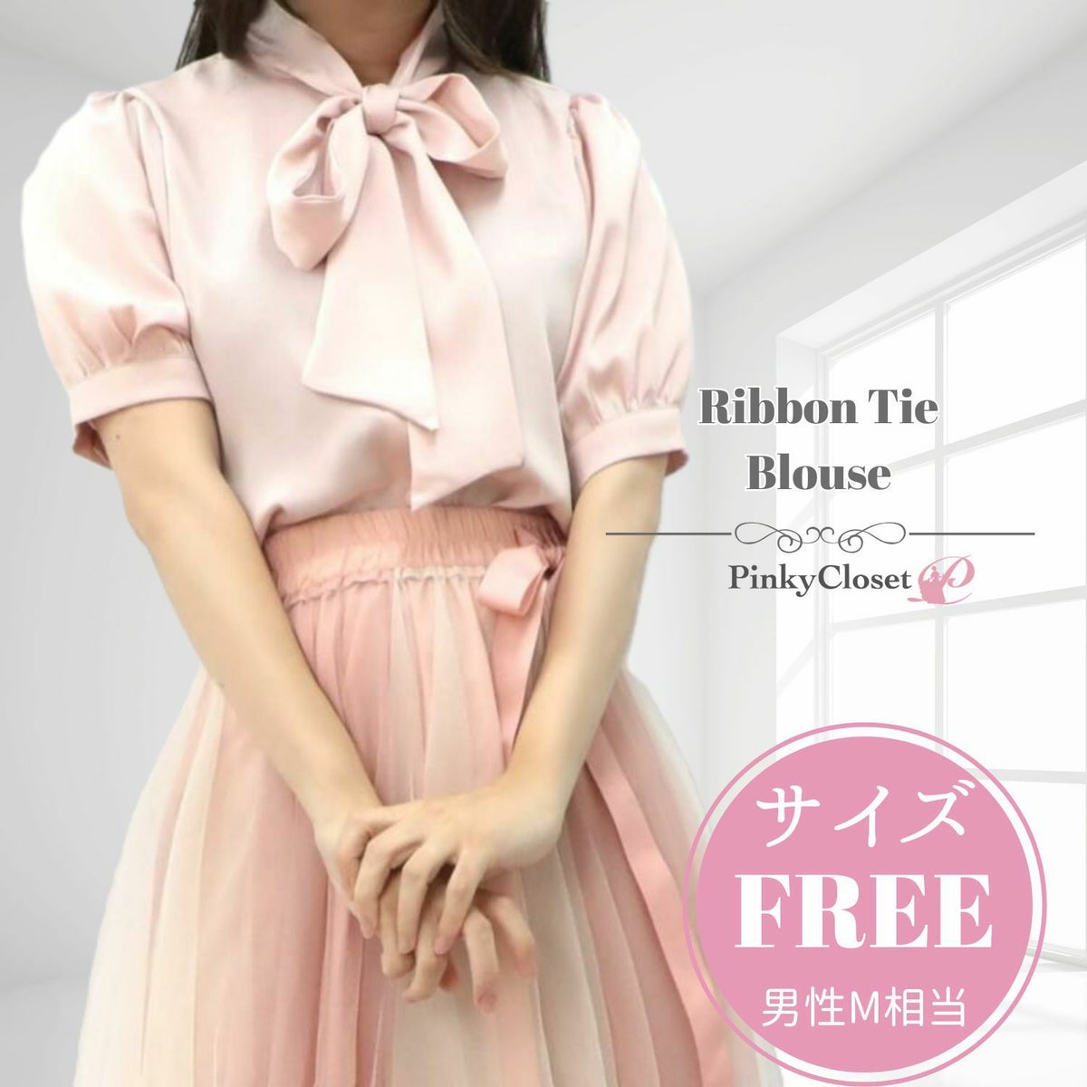 シンプルリボンタイ半袖ブラウス ピンク フリーサイズ