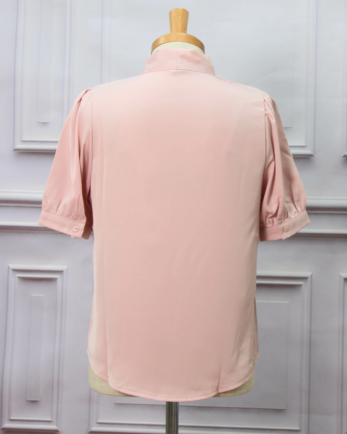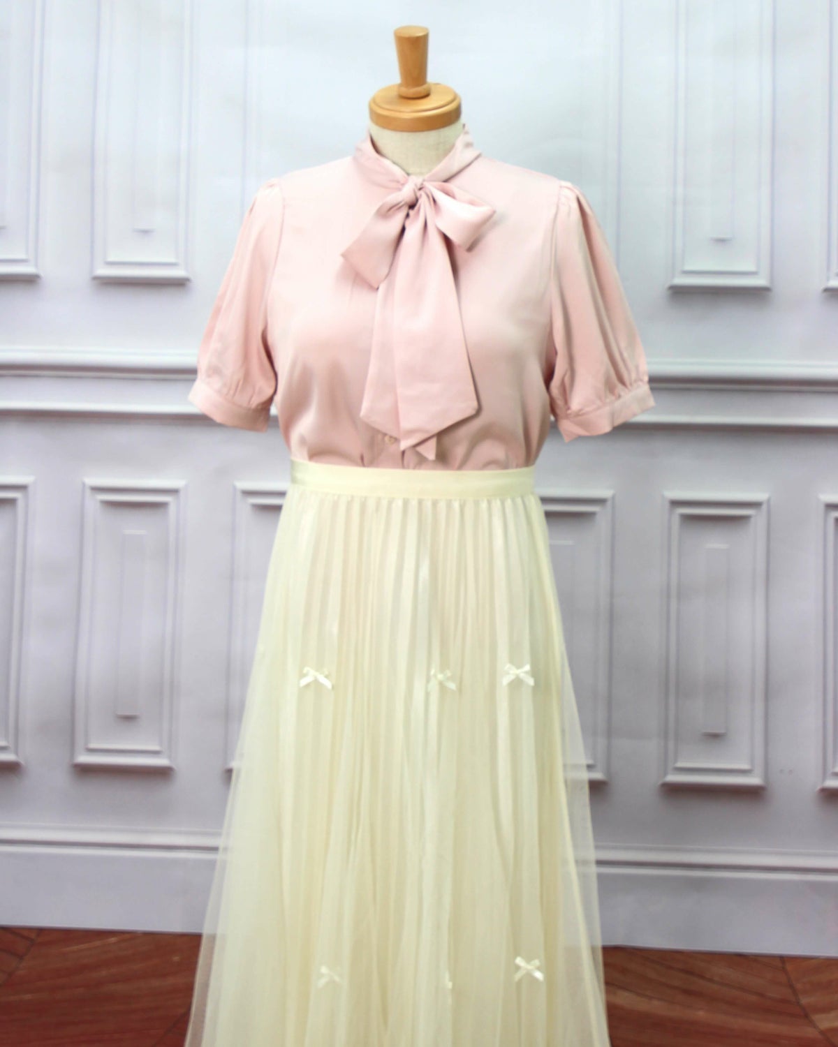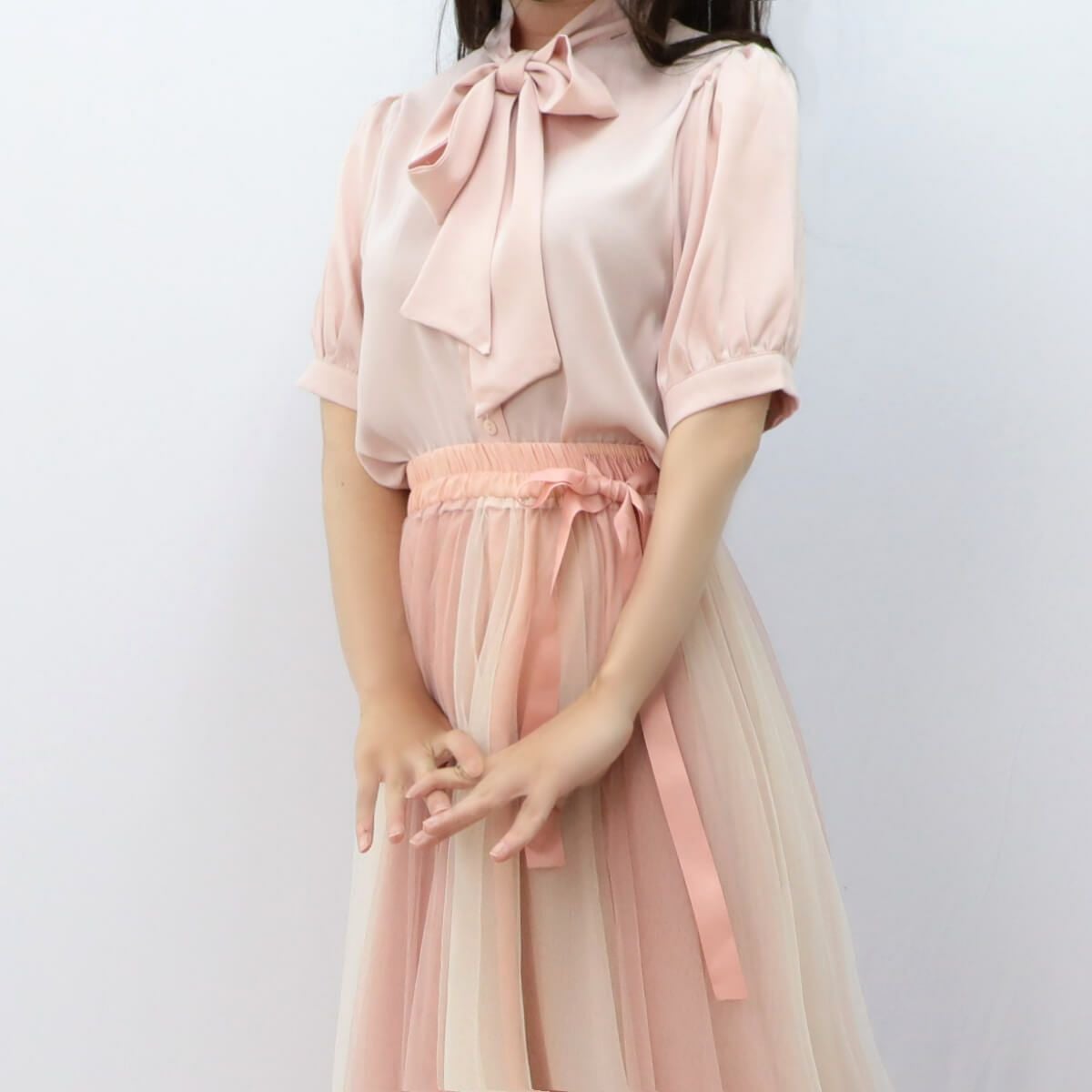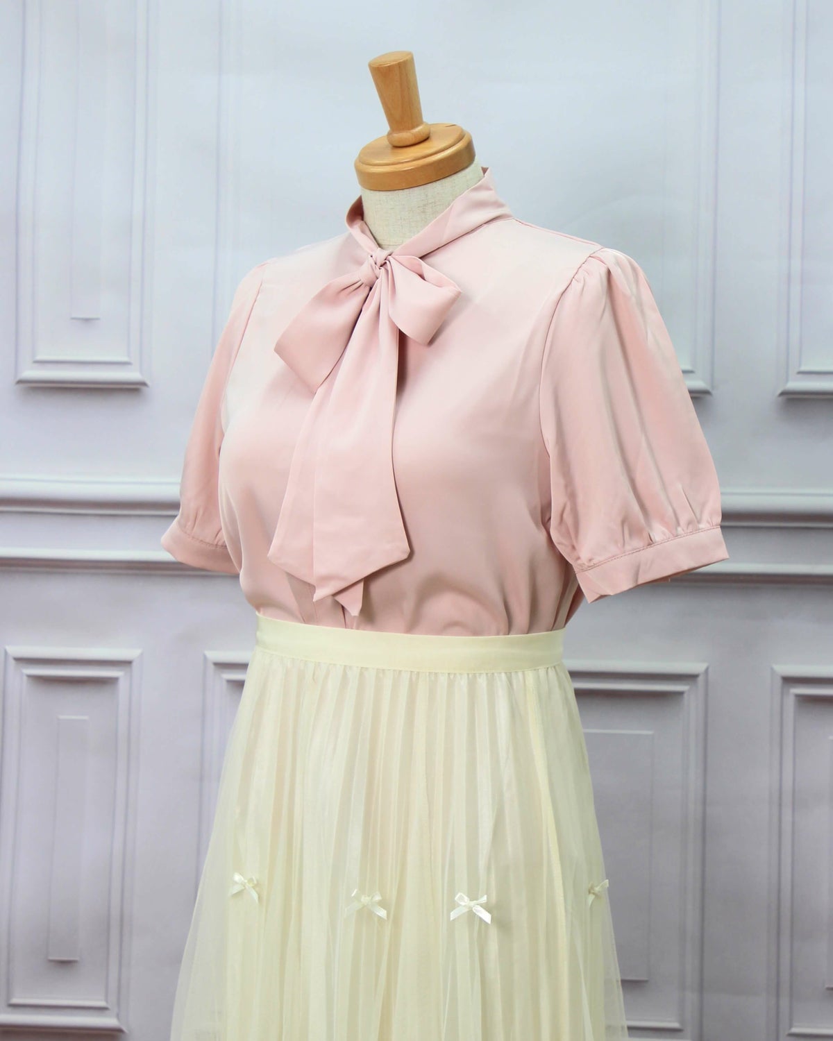 シンプルリボンタイ半袖ブラウス ピンク フリーサイズ