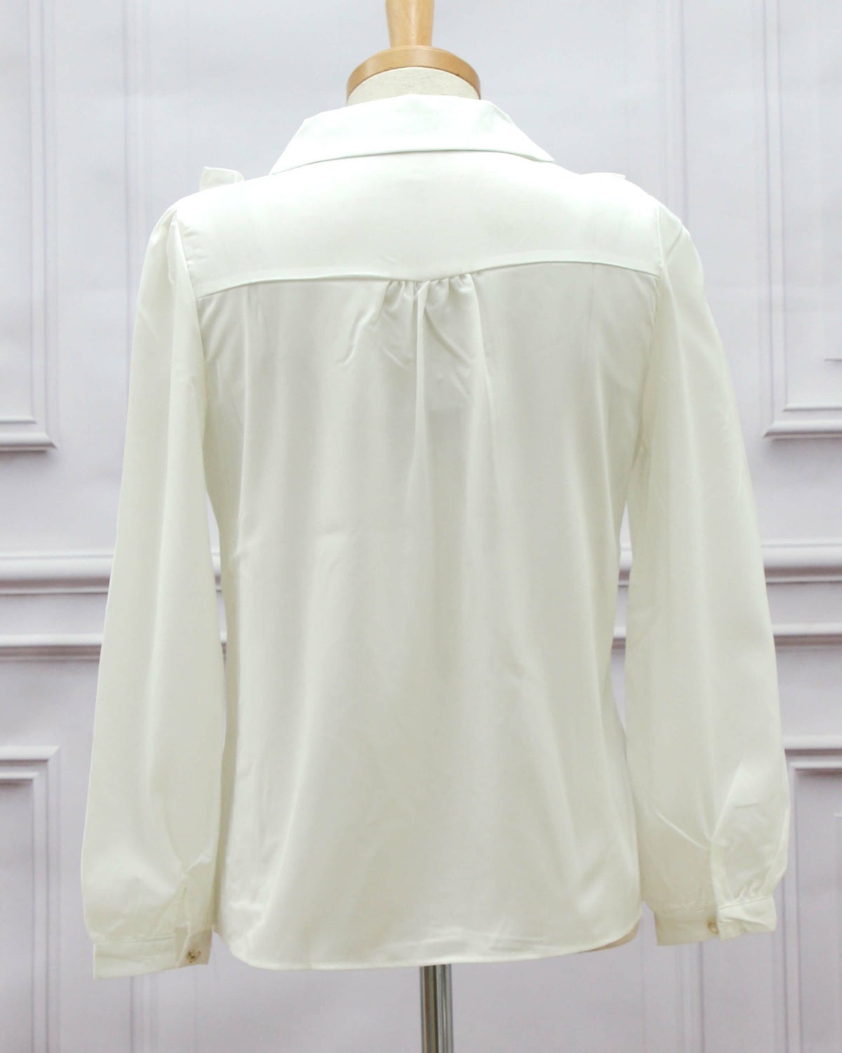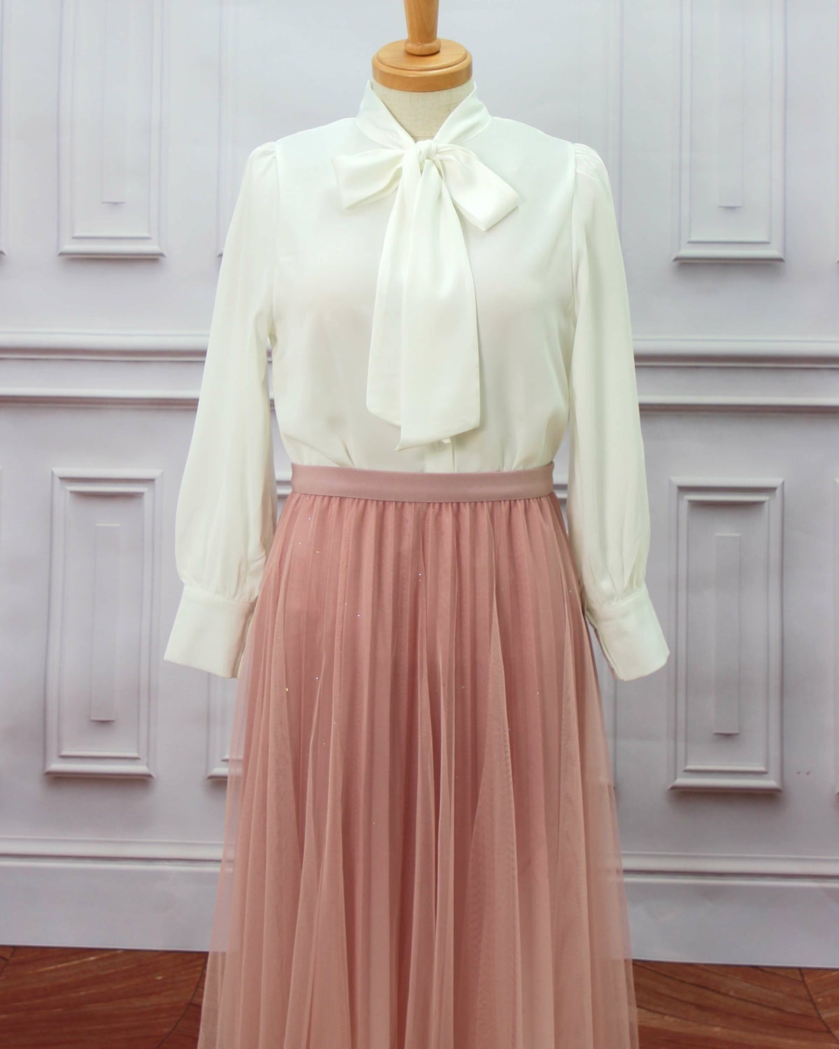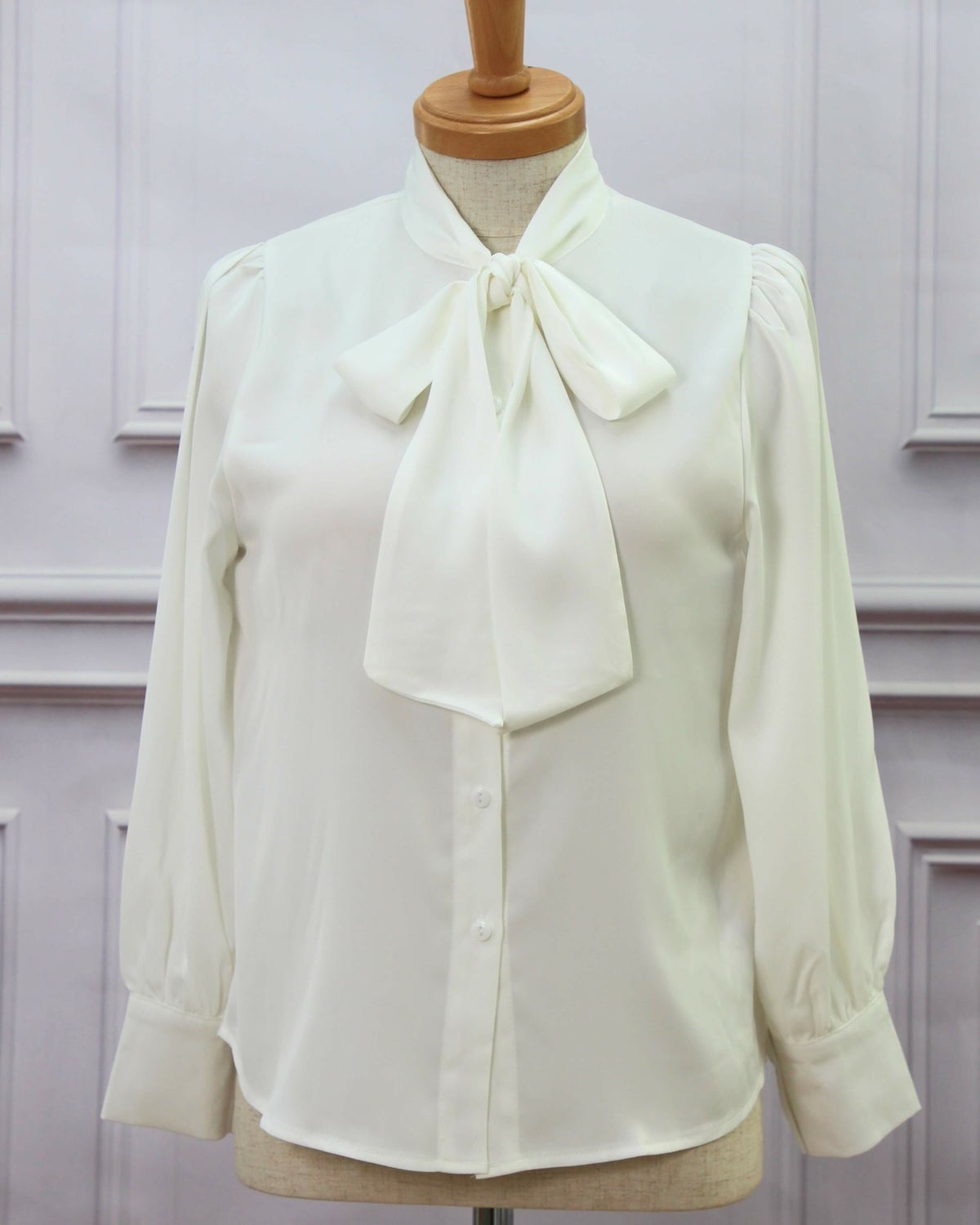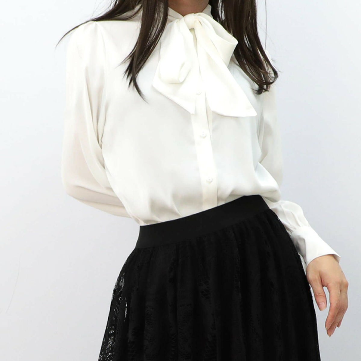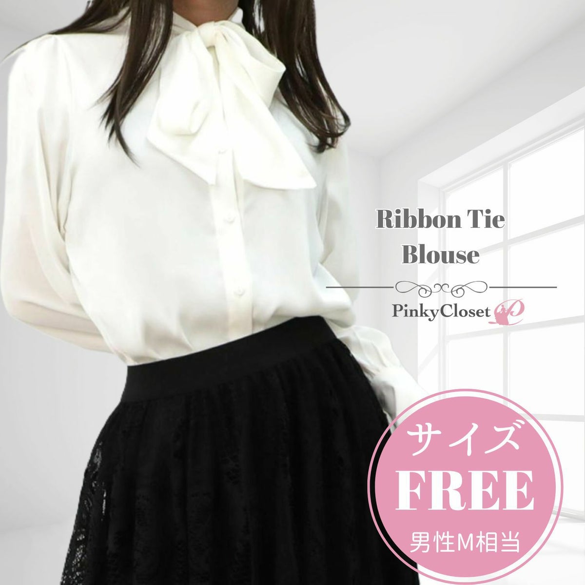 シンプルリボンタイ長袖ブラウス 白 フリーサイズ