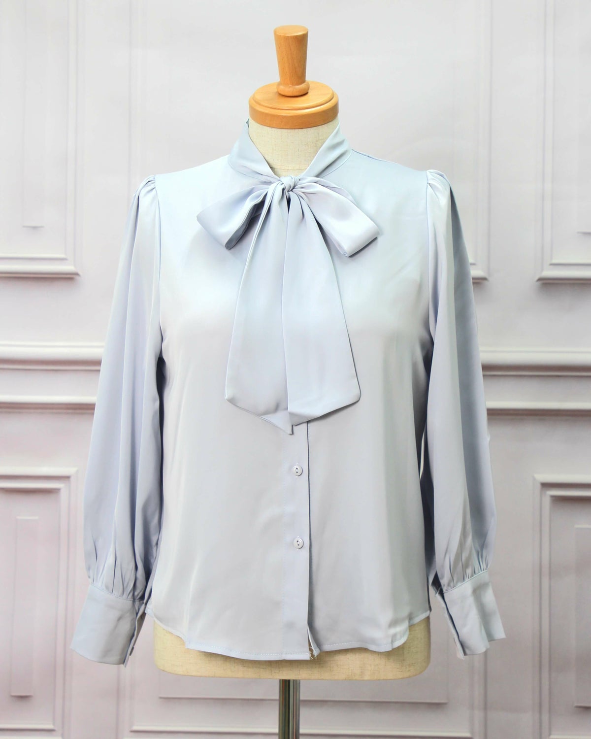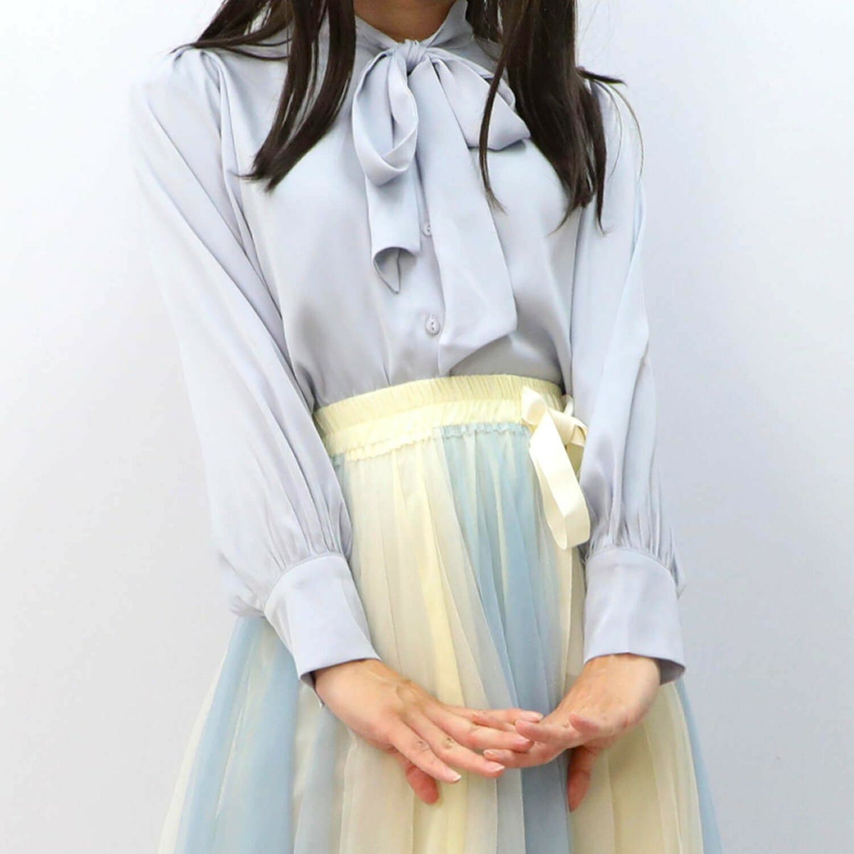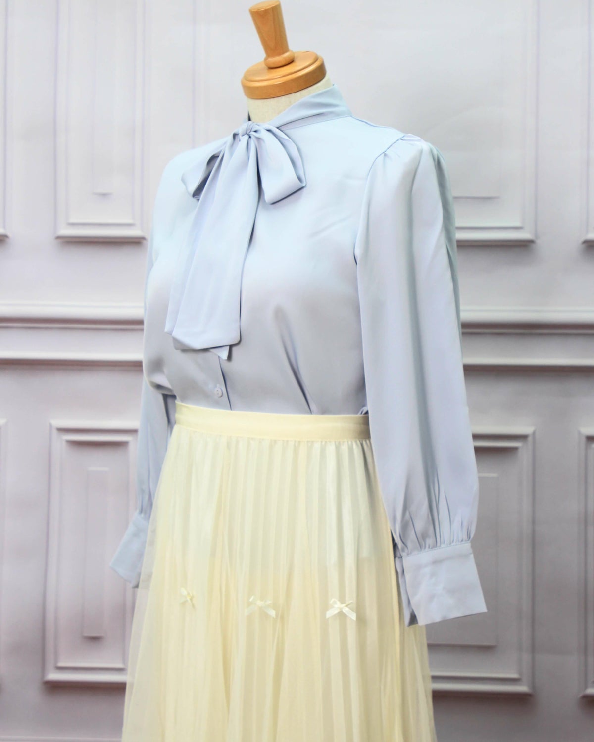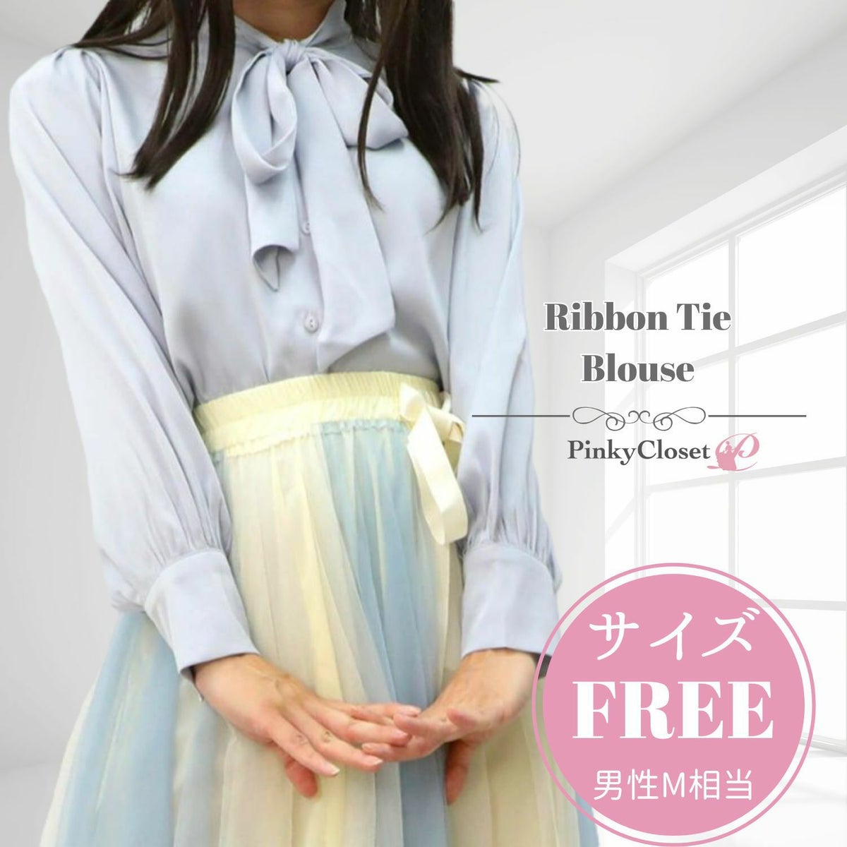シンプルリボンタイ長袖ブラウス 水色 フリーサイズ
