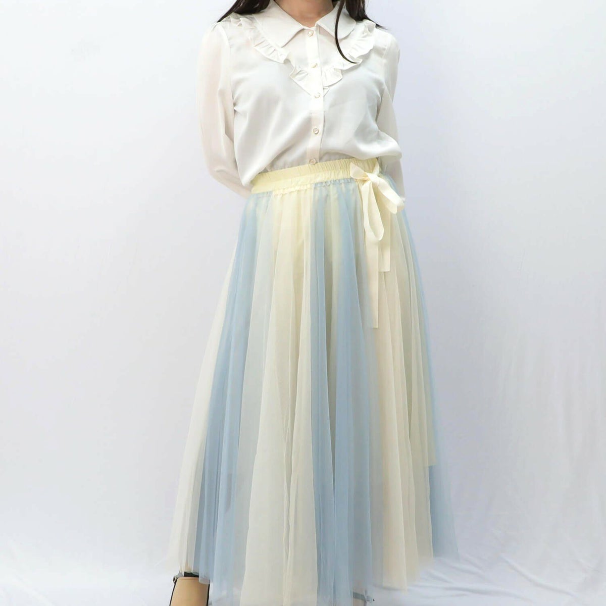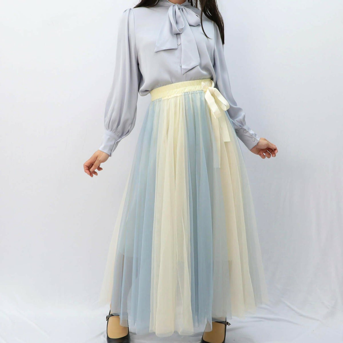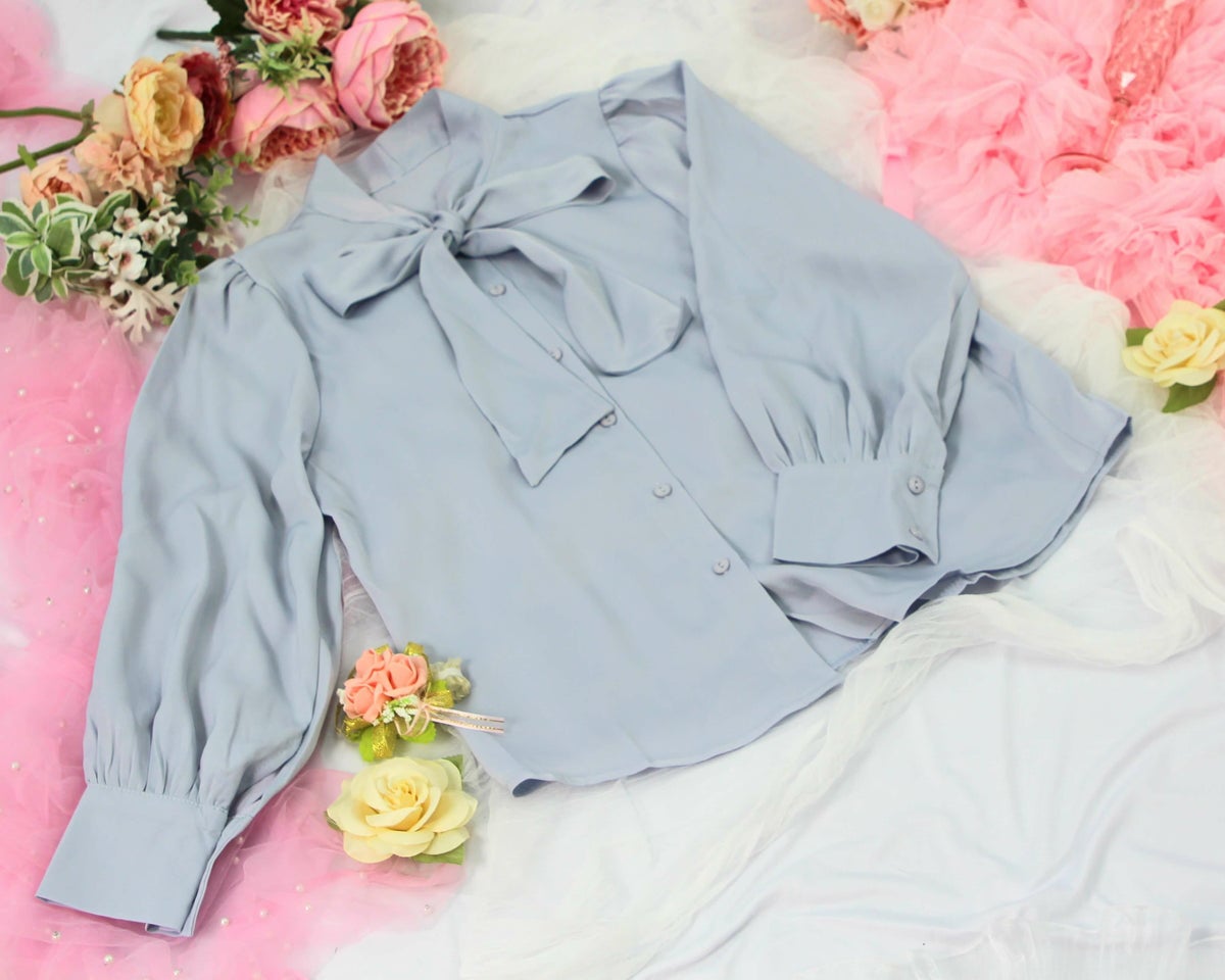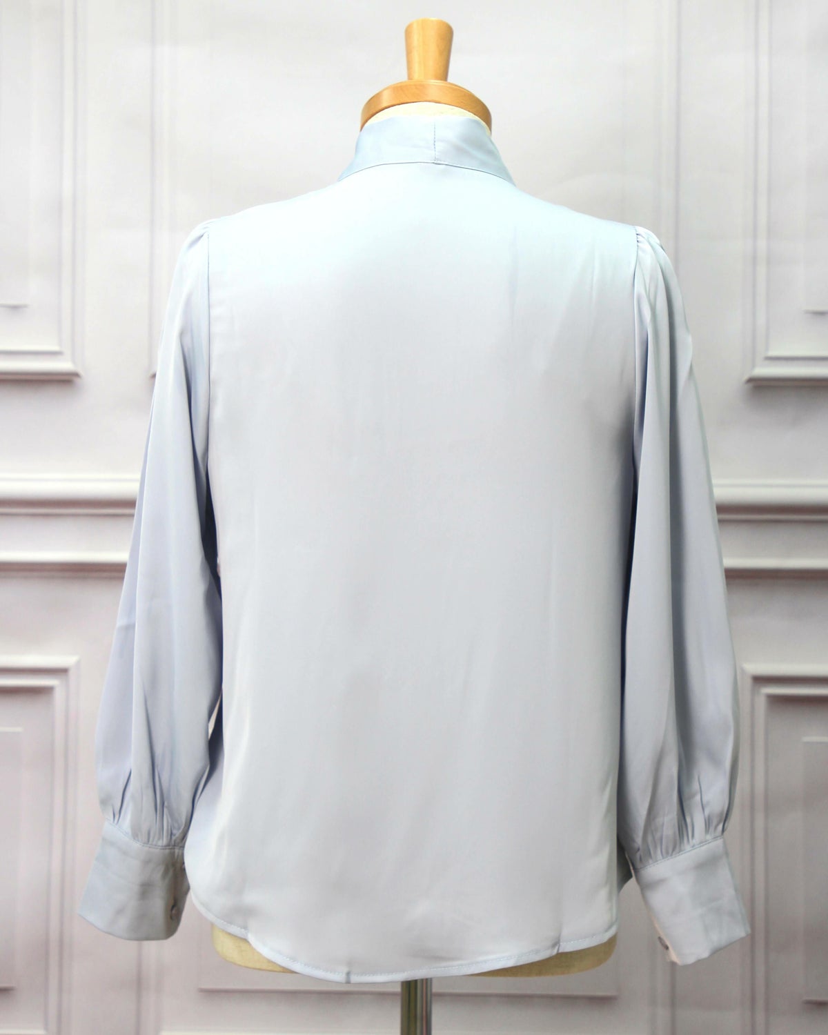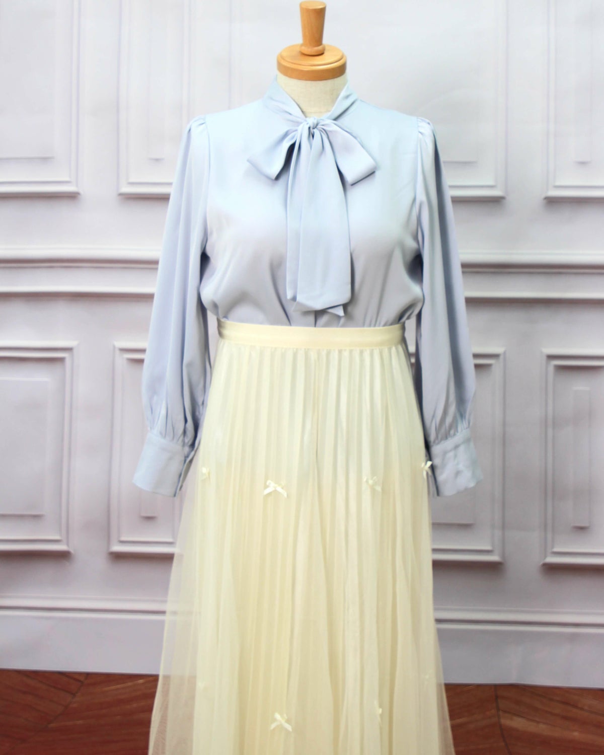 シンプルリボンタイ長袖ブラウス 水色 フリーサイズ