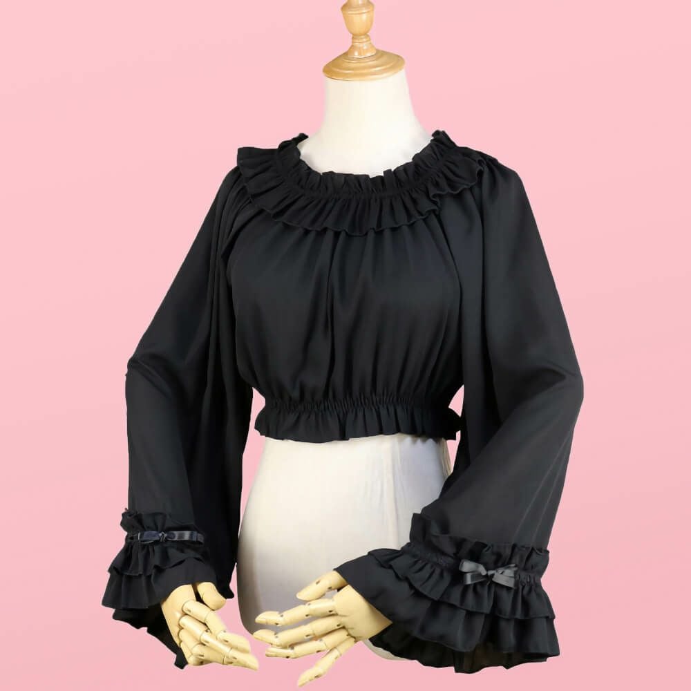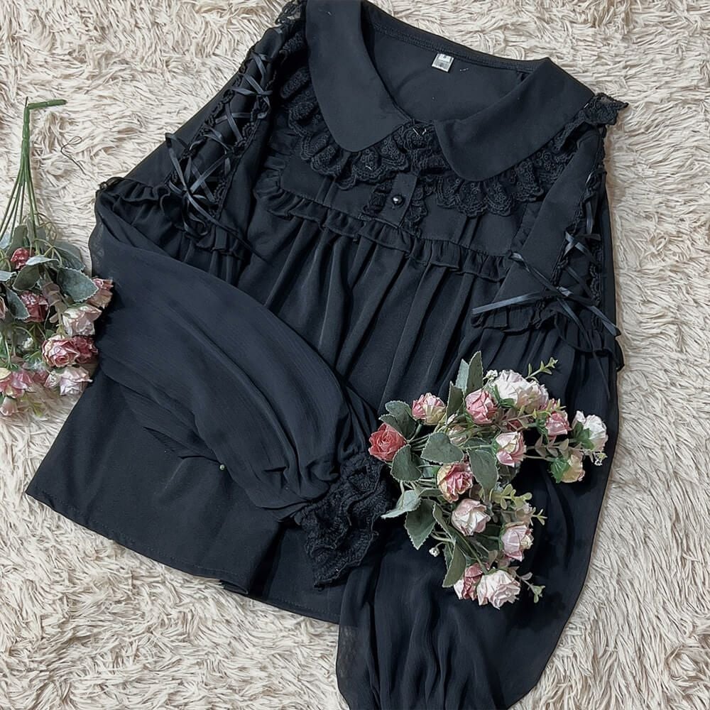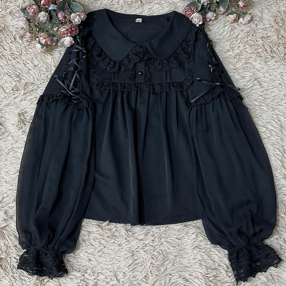 丸襟レースふわふわ長袖ブラウス 黒