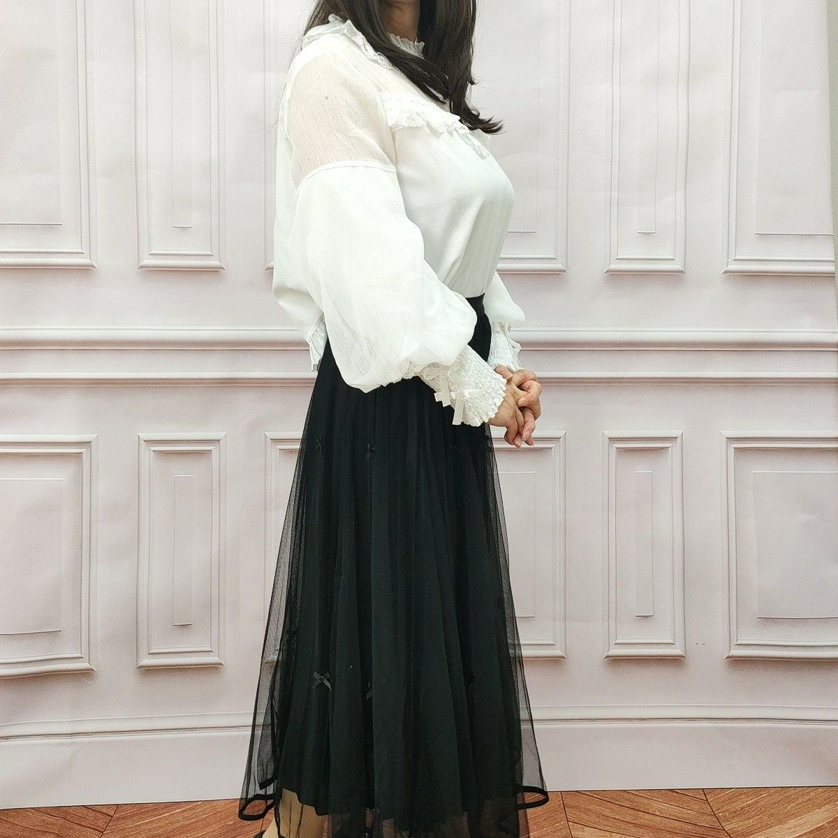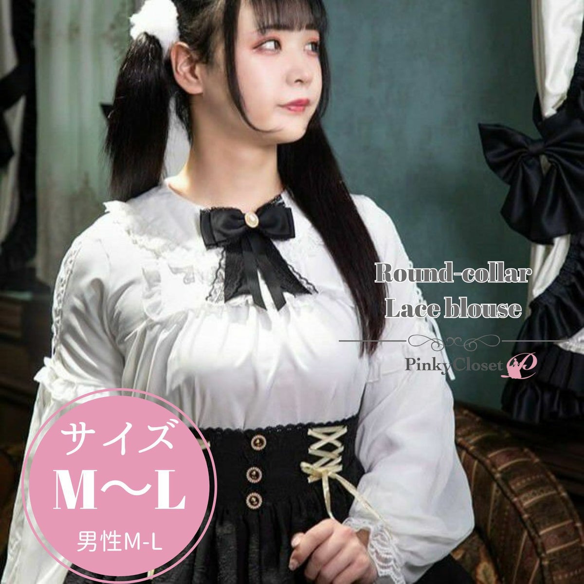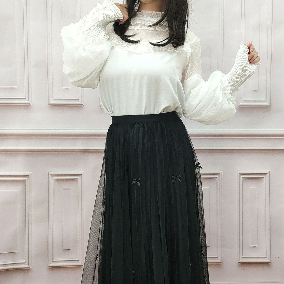 丸襟レースふわふわ長袖ブラウス 黒