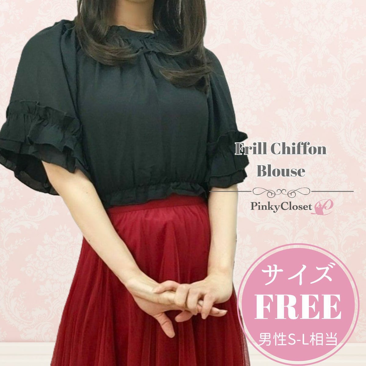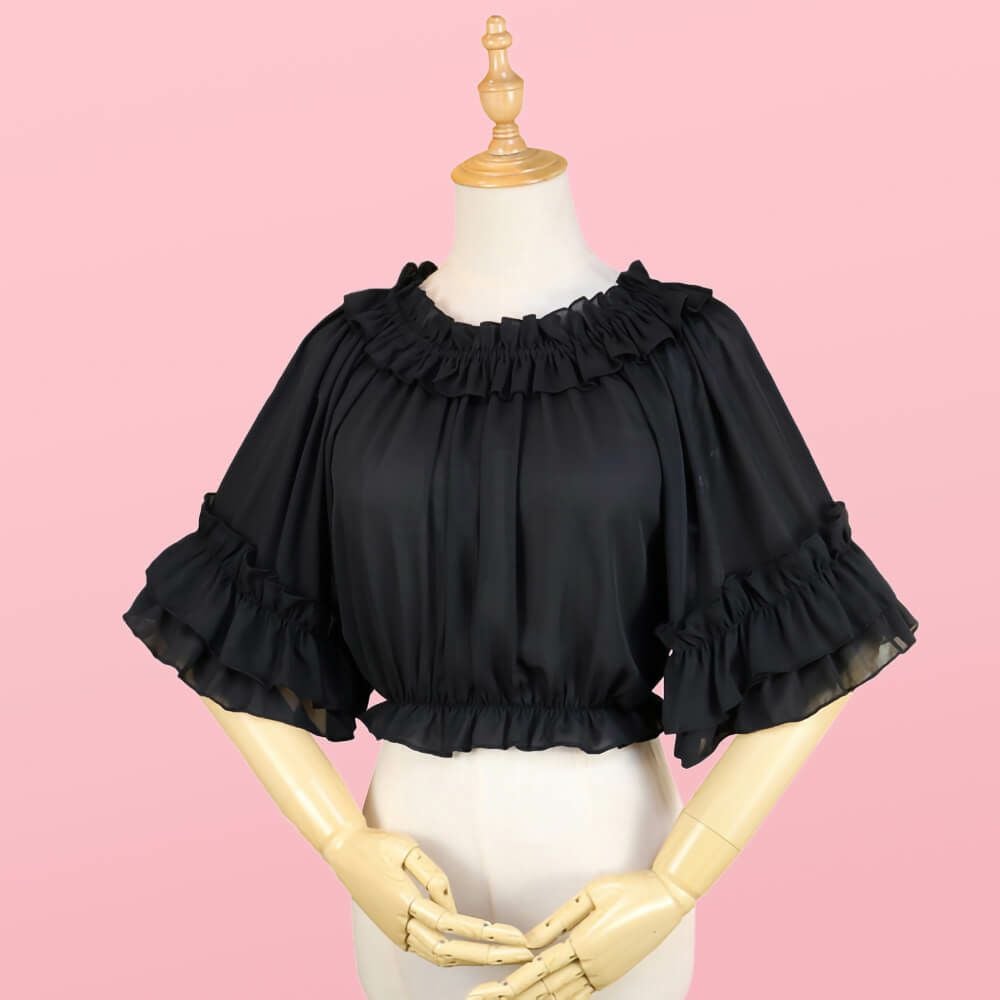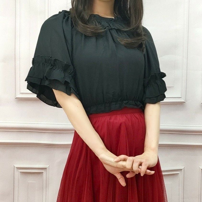 半袖フリルシフォンブラウス 黒
