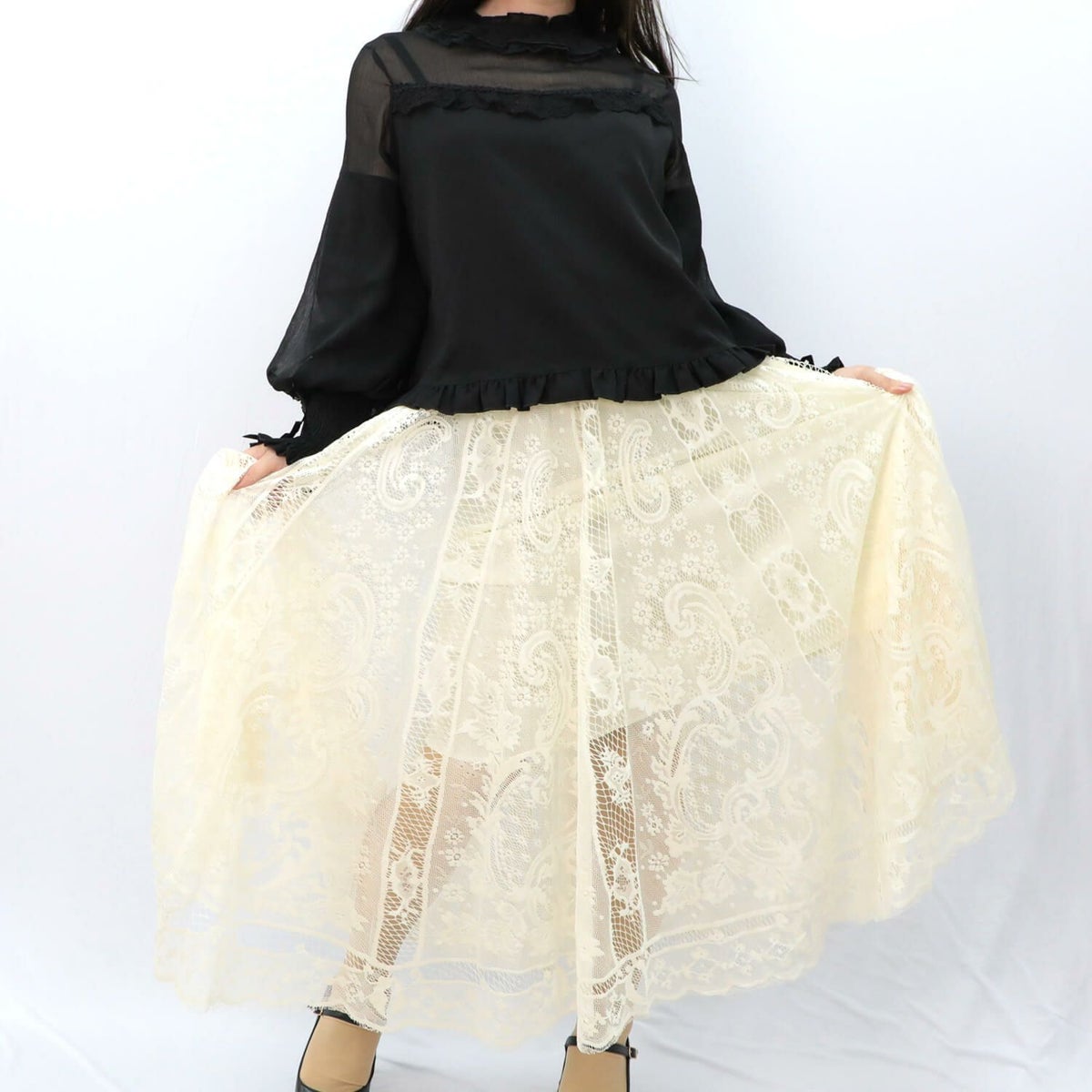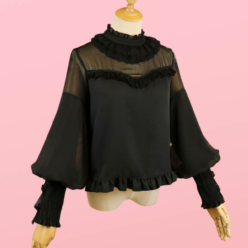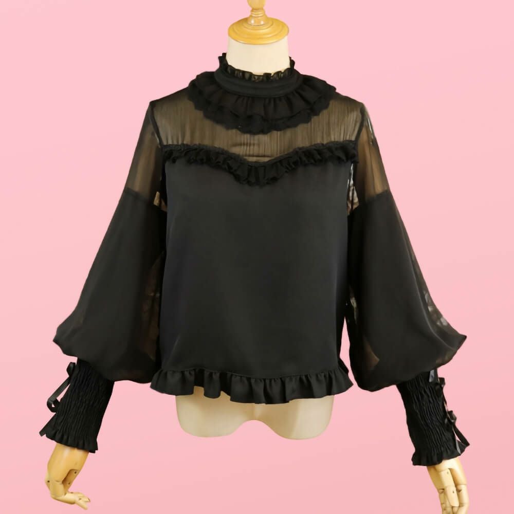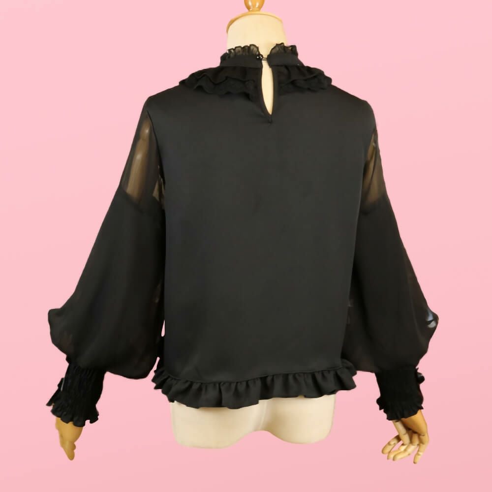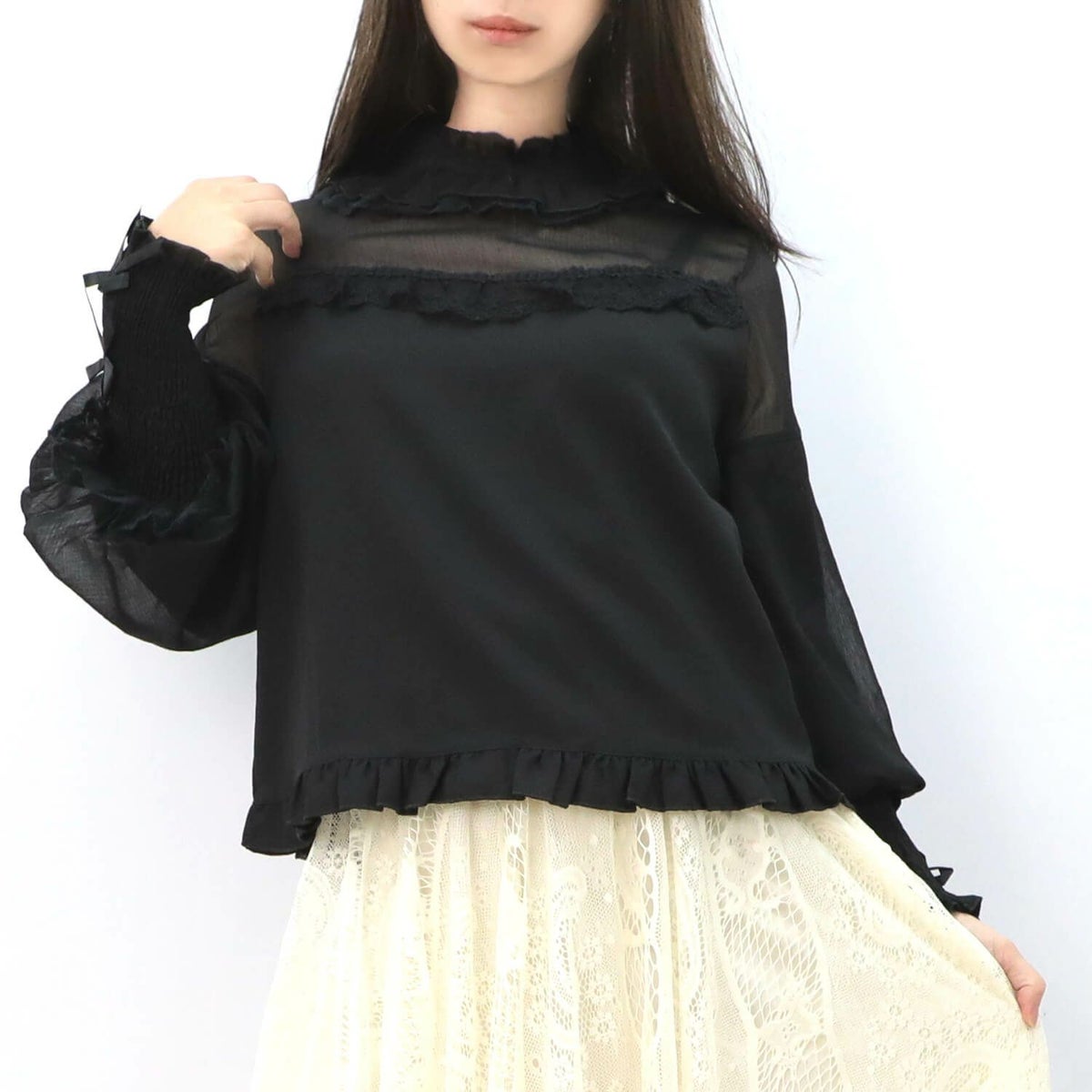 フリルレースジョーゼットブラウス 黒