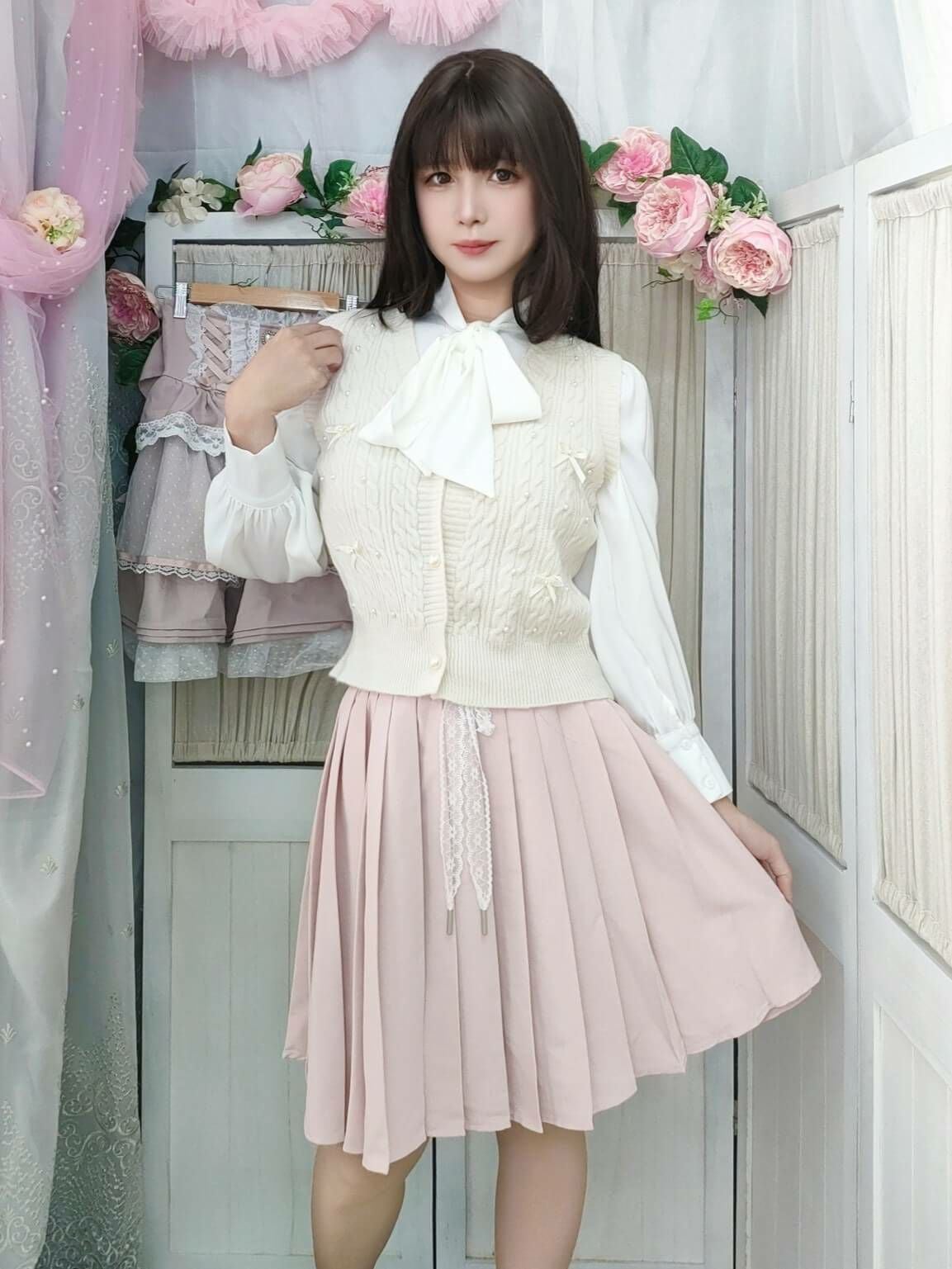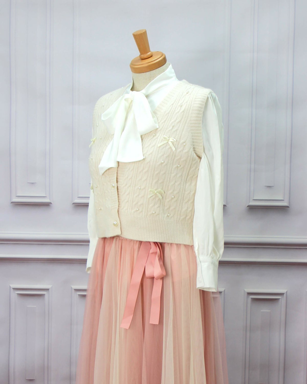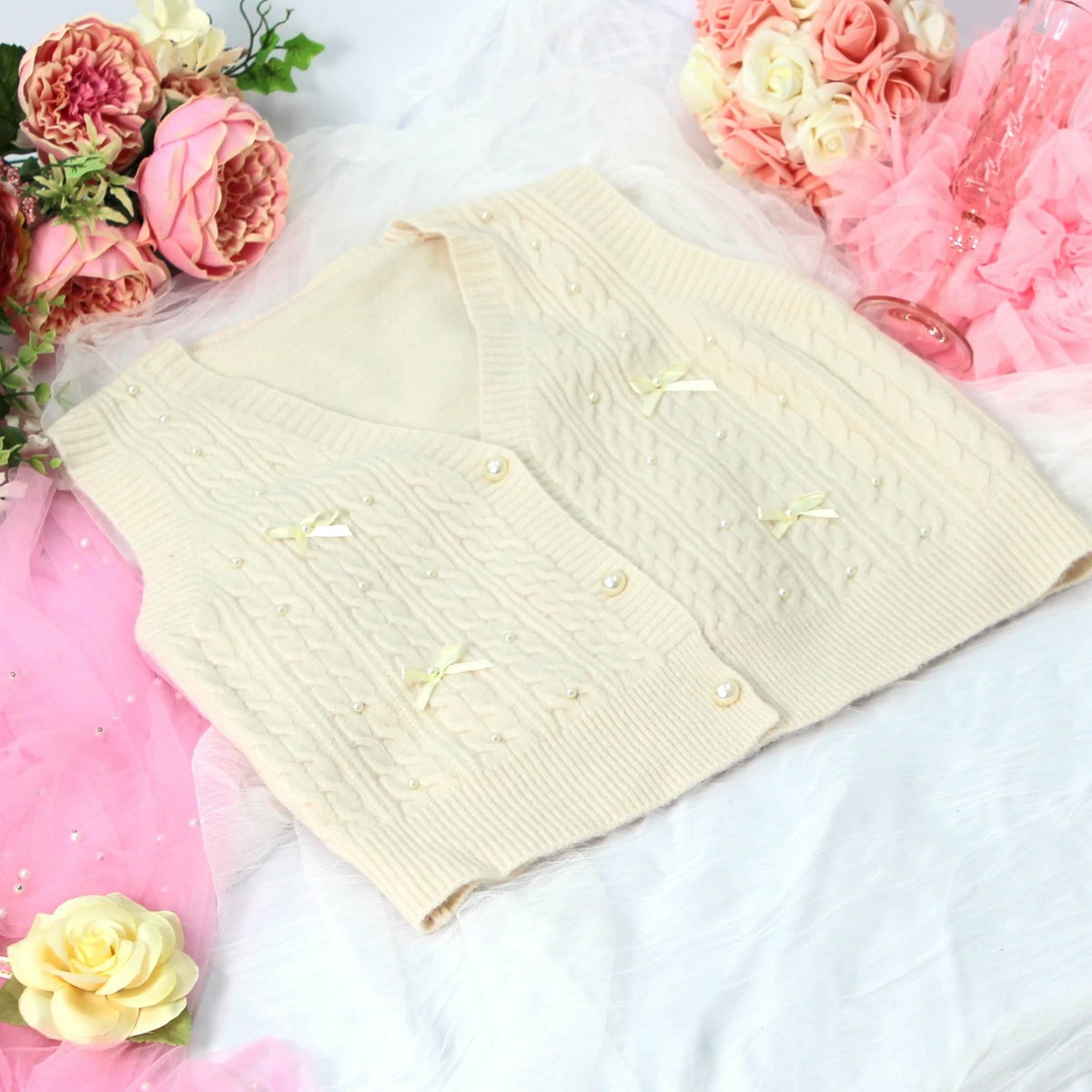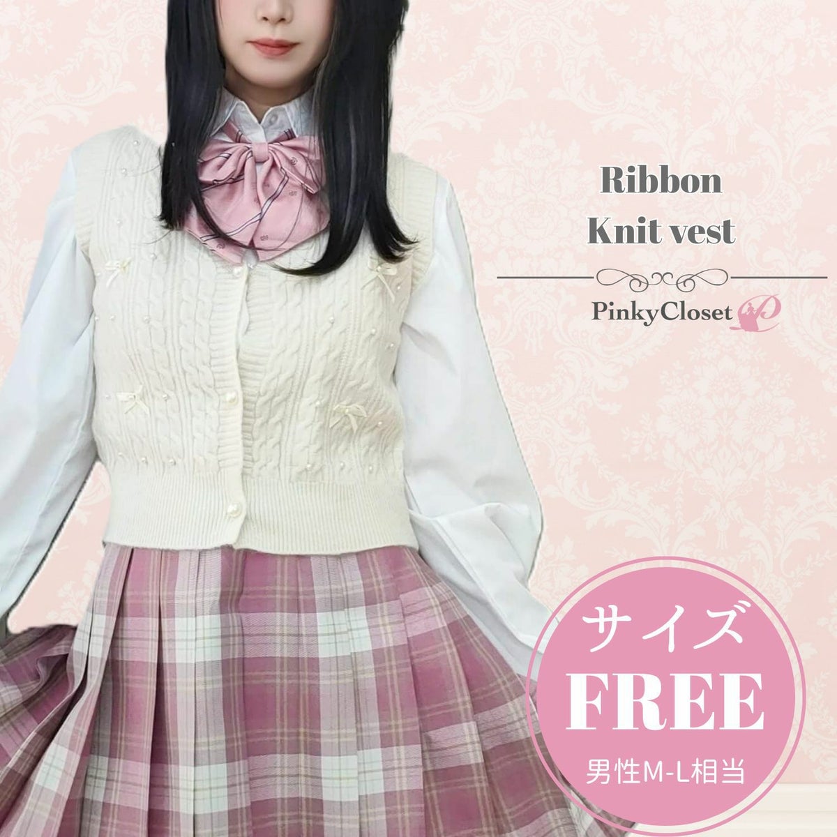 編み込みリボンニットベスト 白 フリーサイズ
