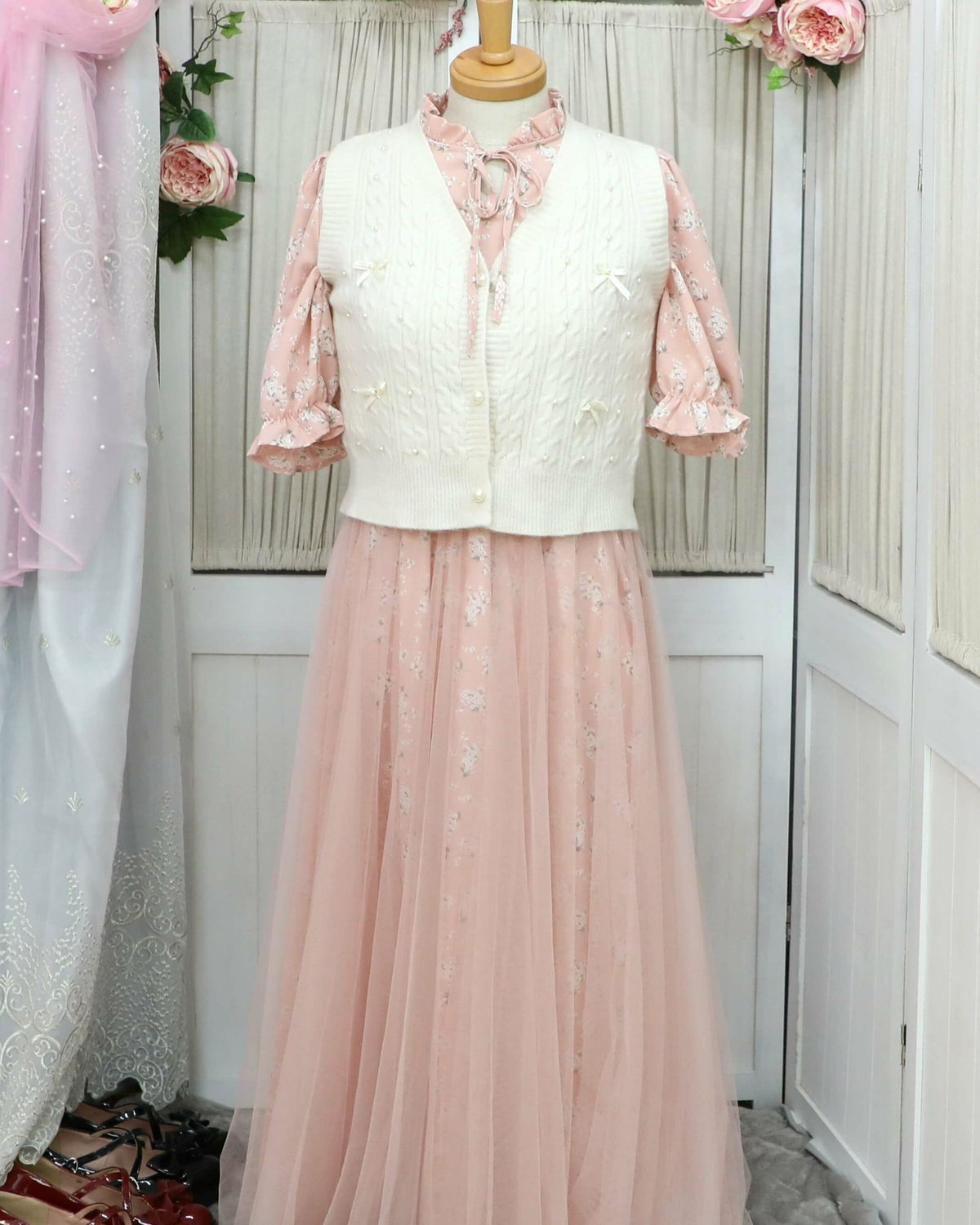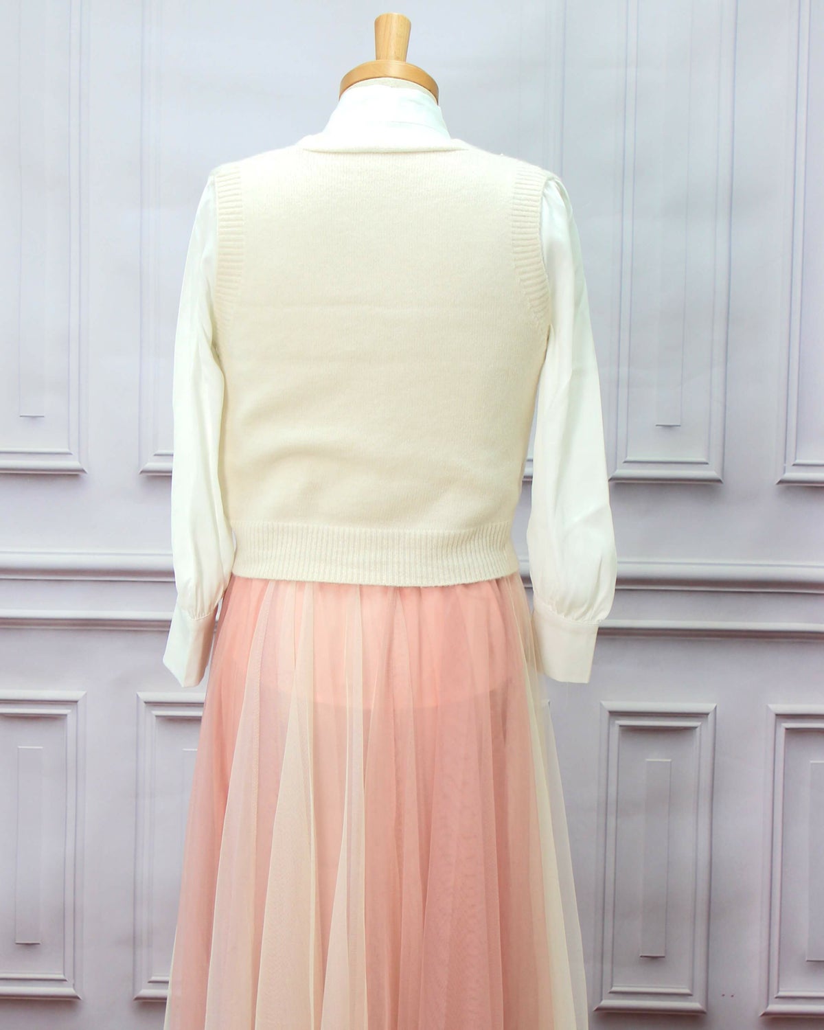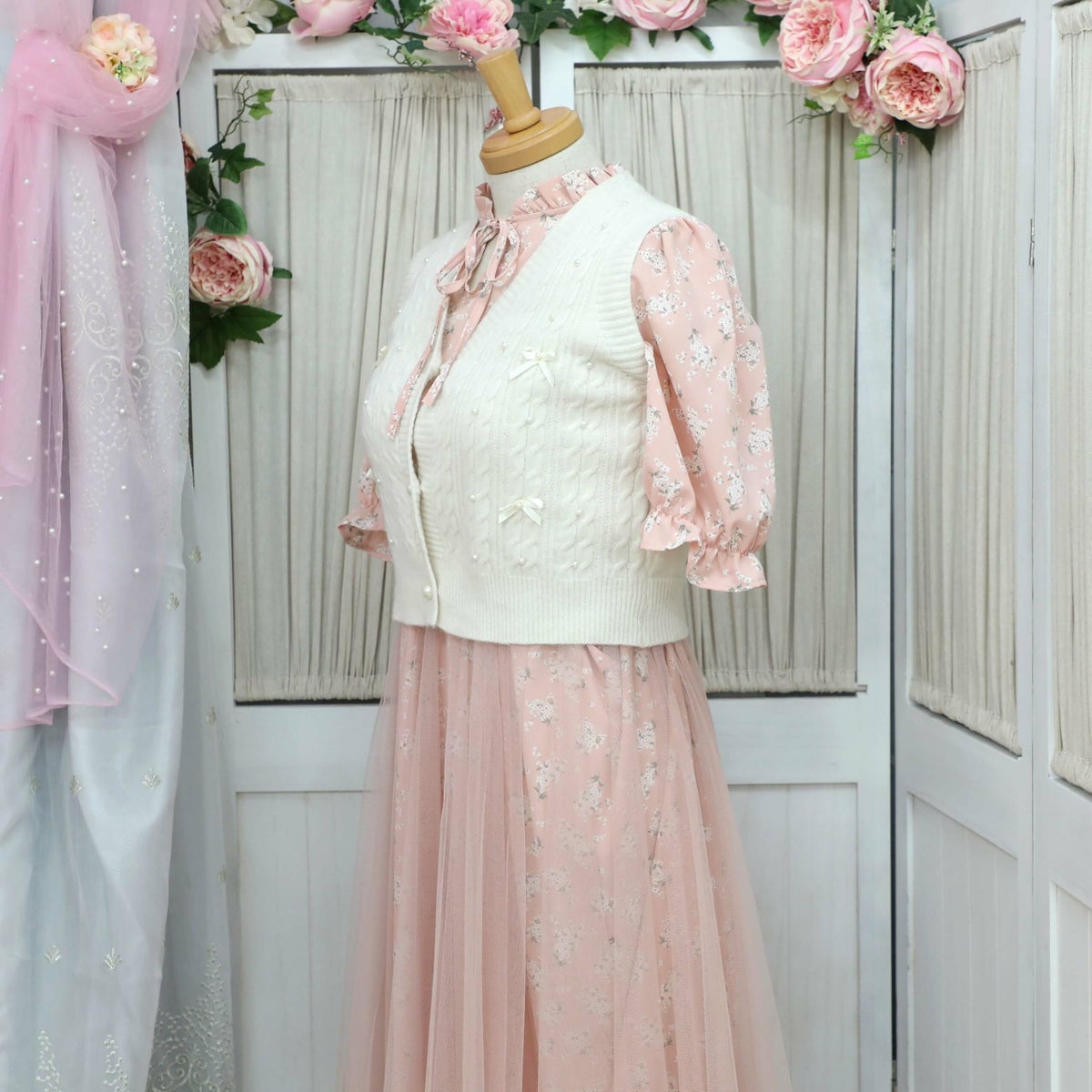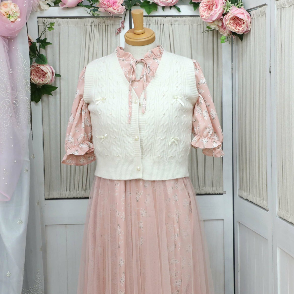 編み込みリボンニットベスト 白 フリーサイズ