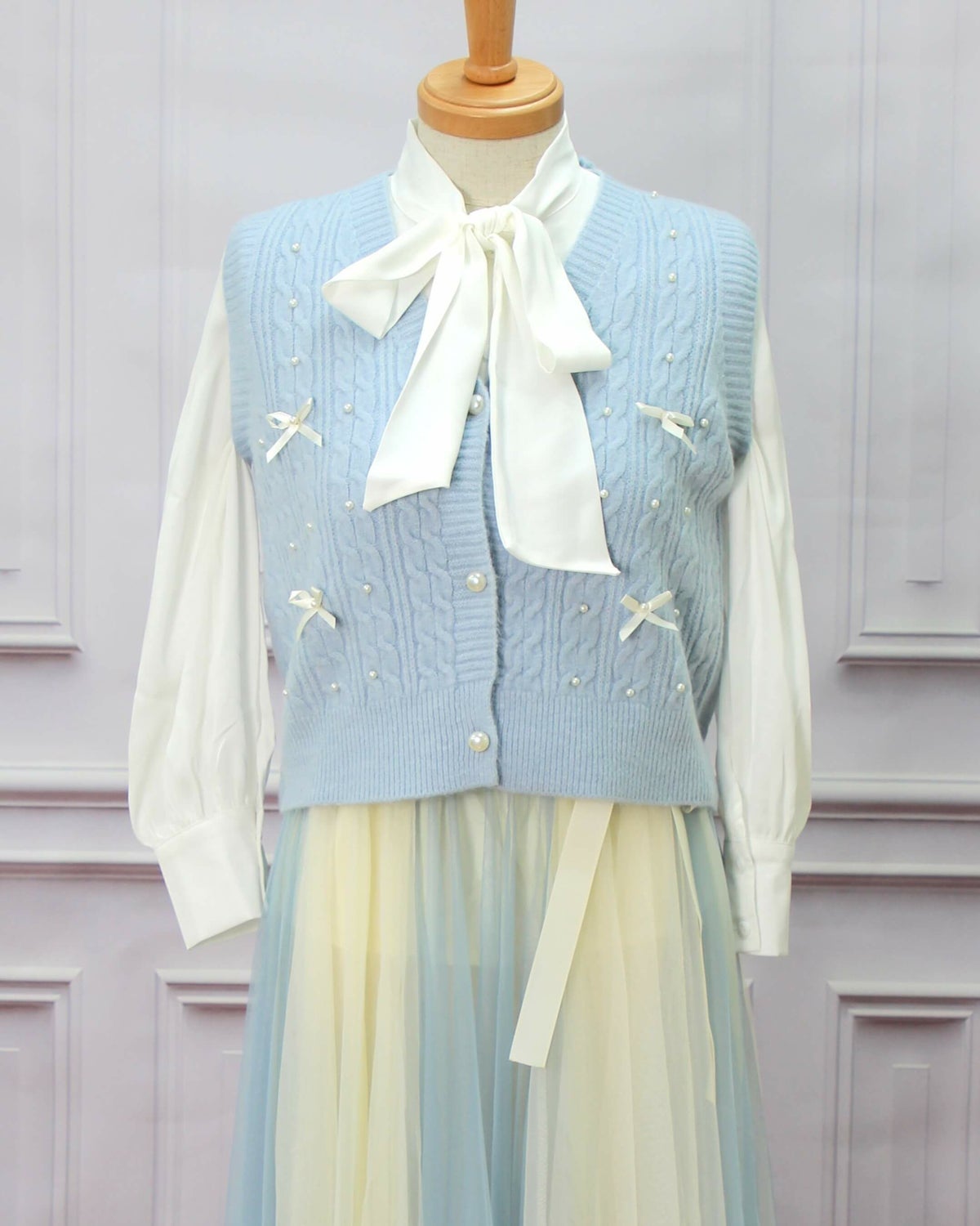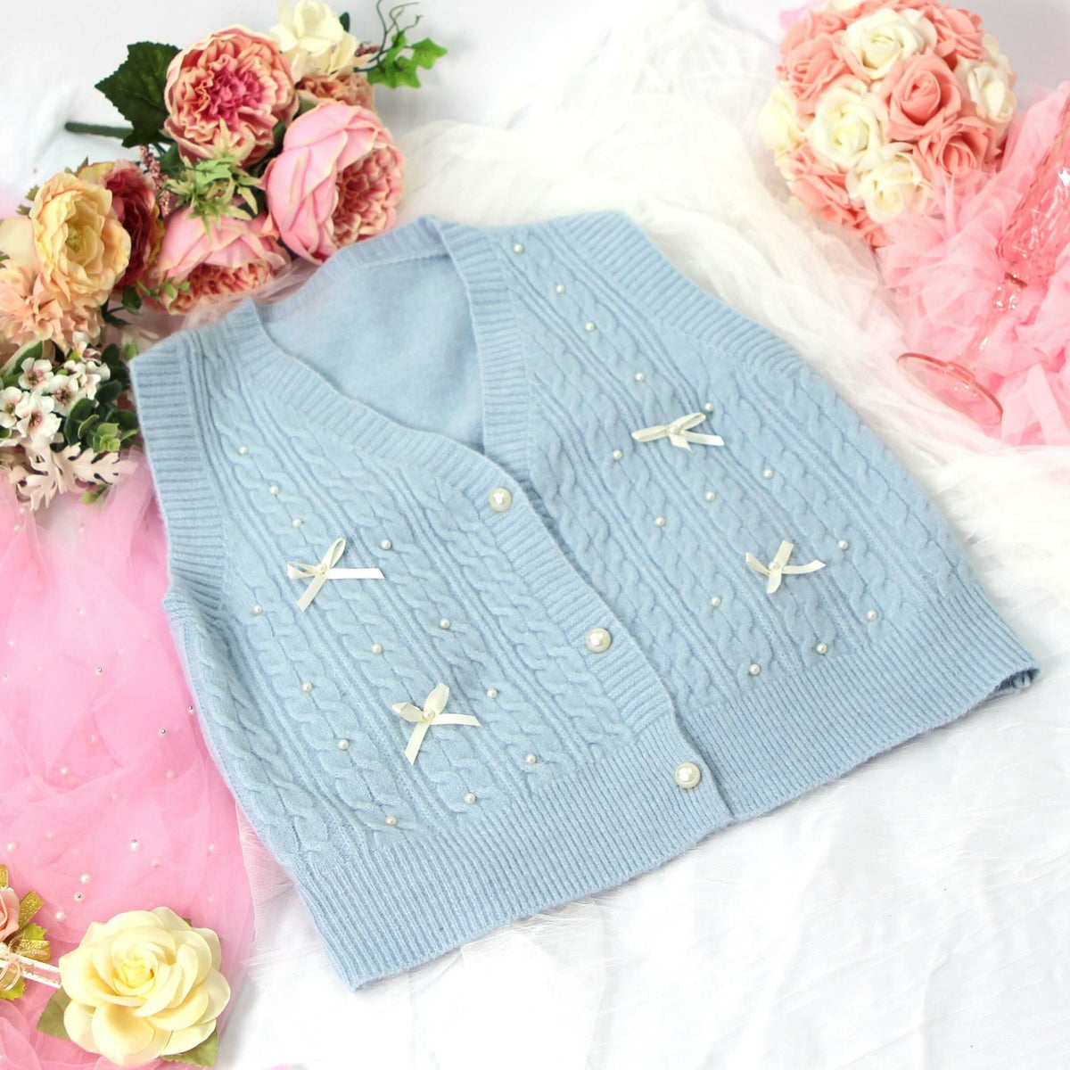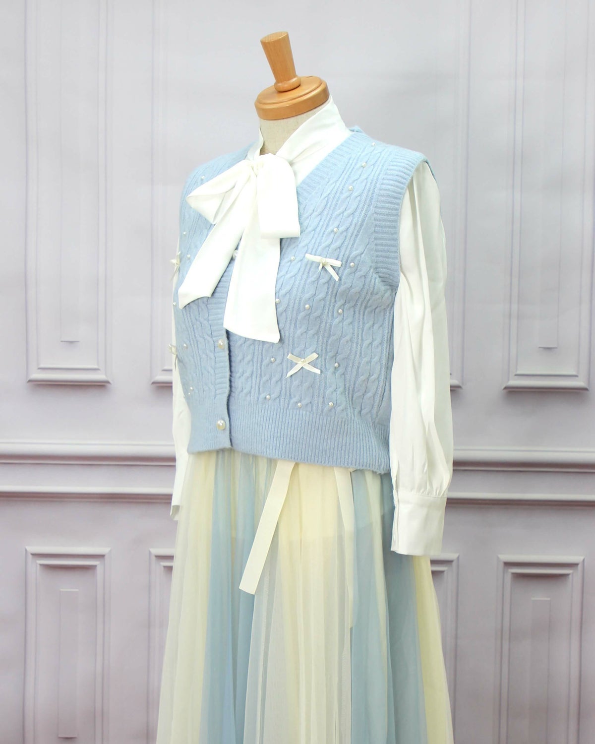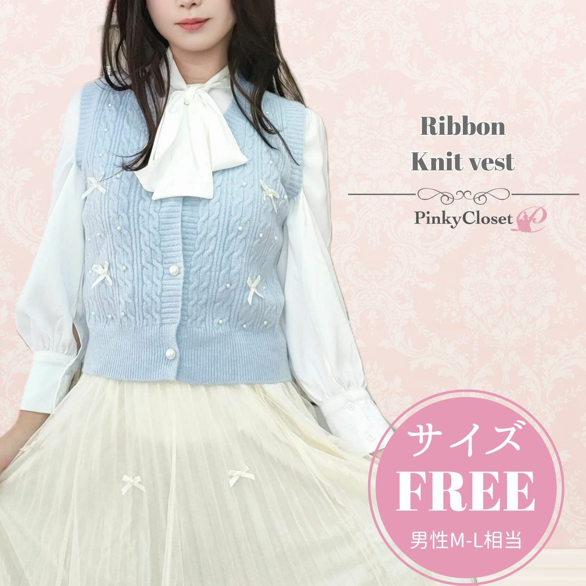 編み込みリボンニットベスト 水色 フリーサイズ