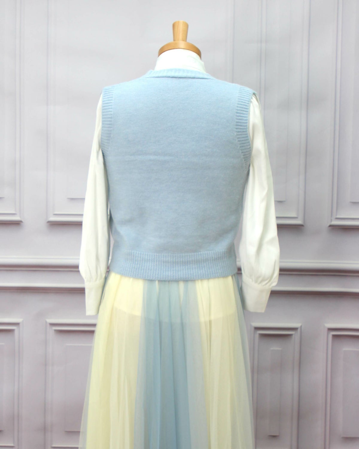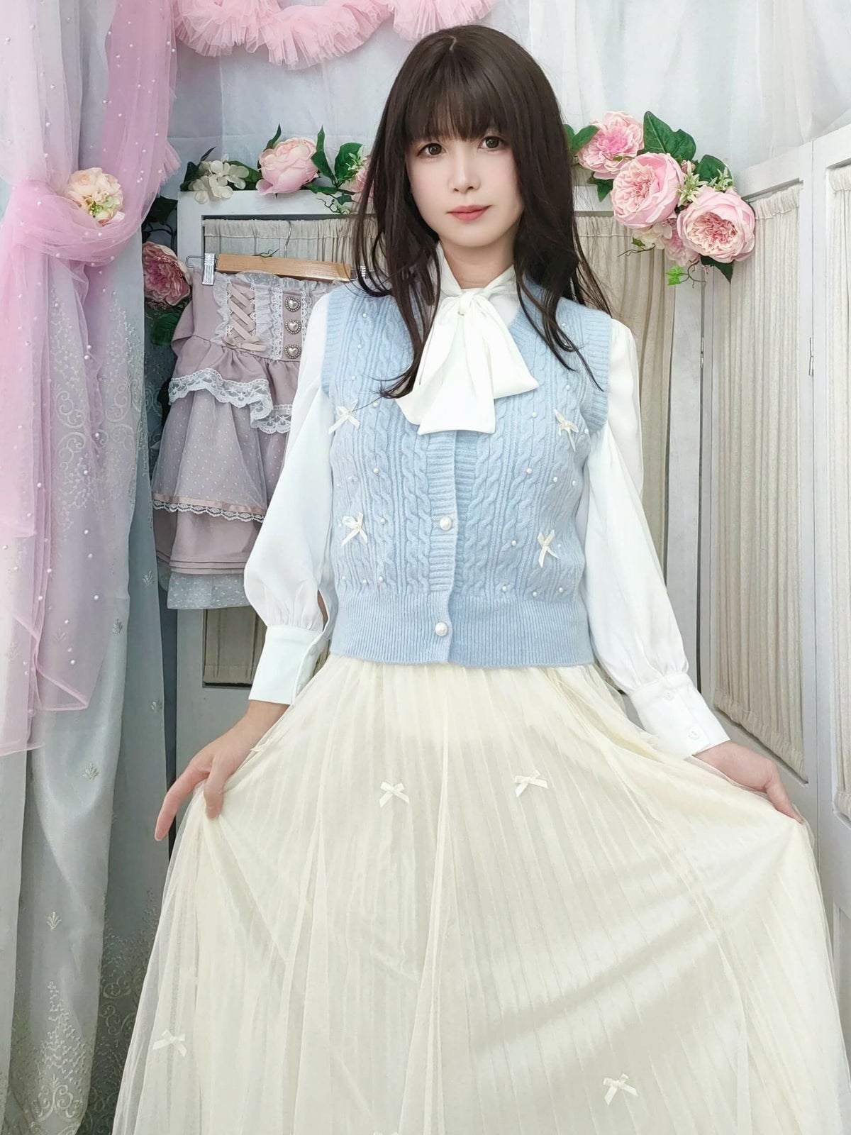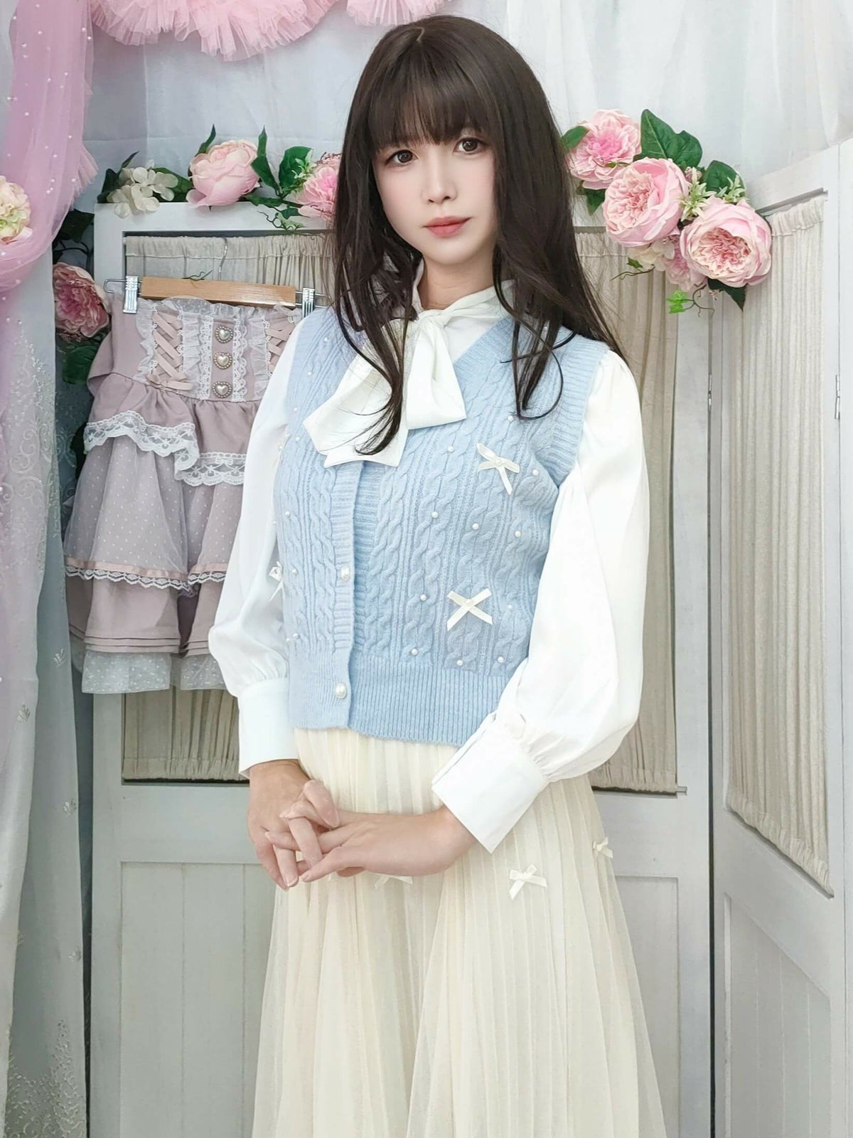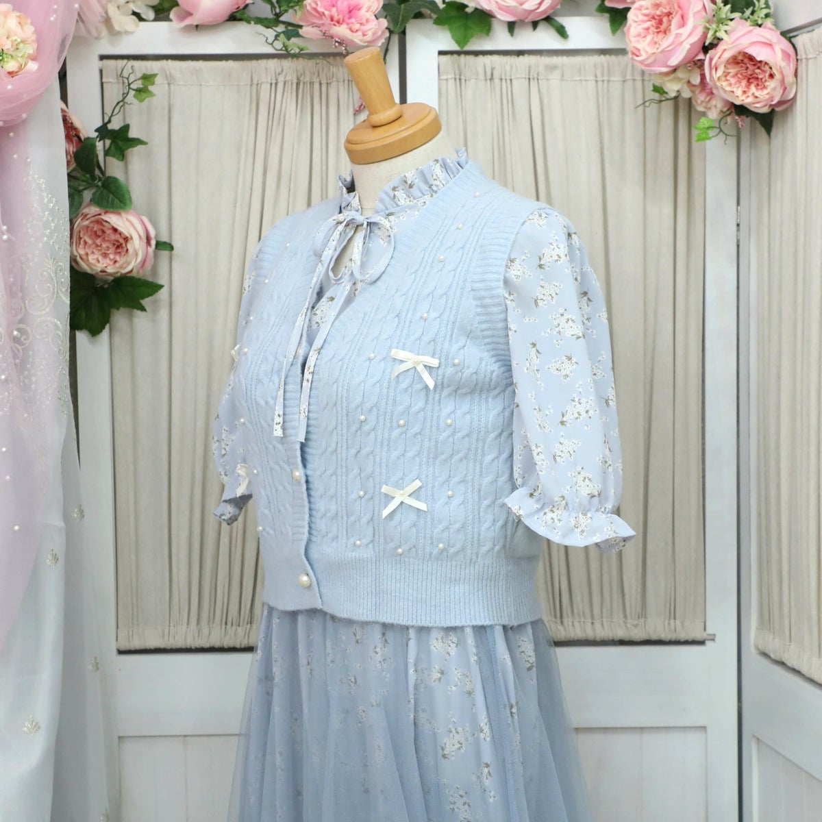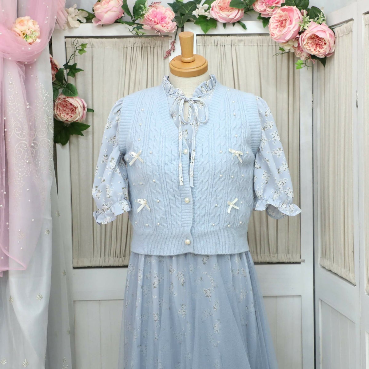 編み込みリボンニットベスト 水色 フリーサイズ