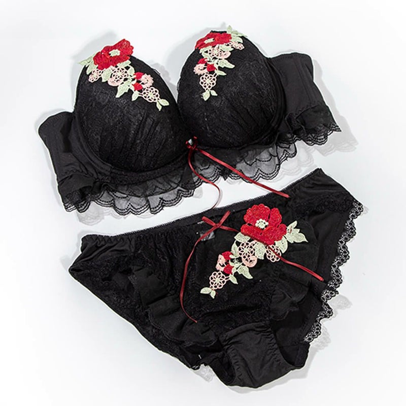 豪華な花刺繍レースとフリルを各所にあしらったブラ&ショーツセット。