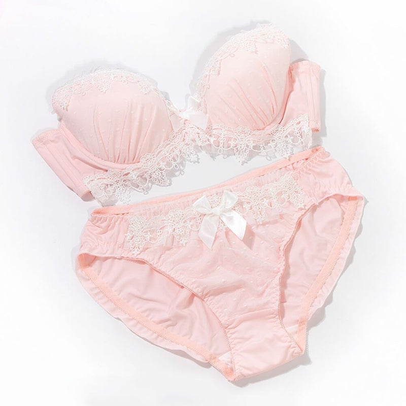 繊細で豪華なレースとリボン、デコルテと肩ひもにチュールの幅広フリルが可愛い!天使のブラ&ショーツセット。