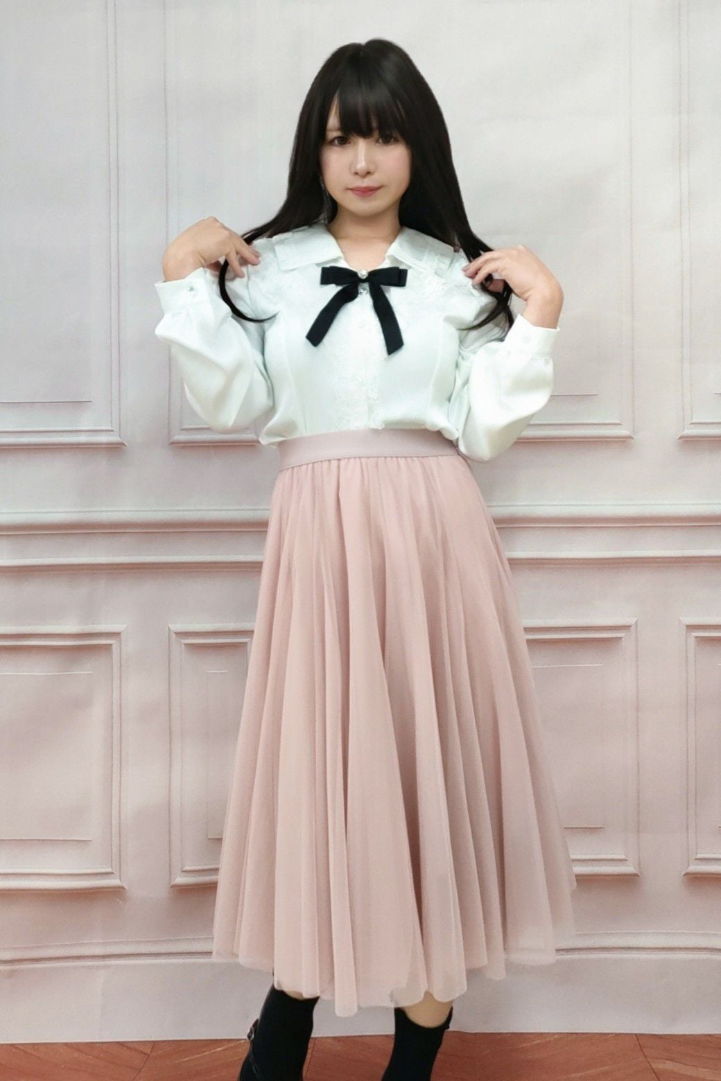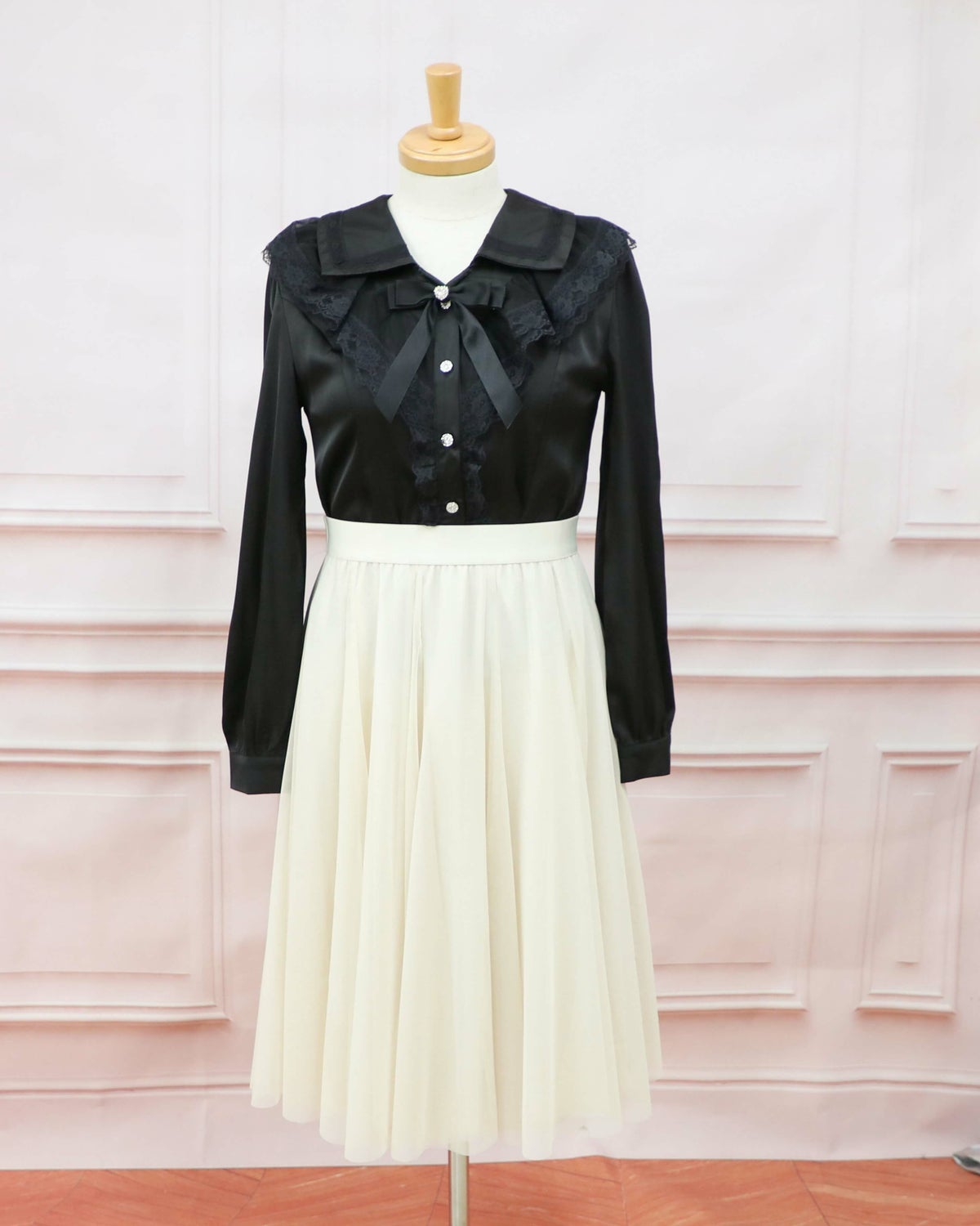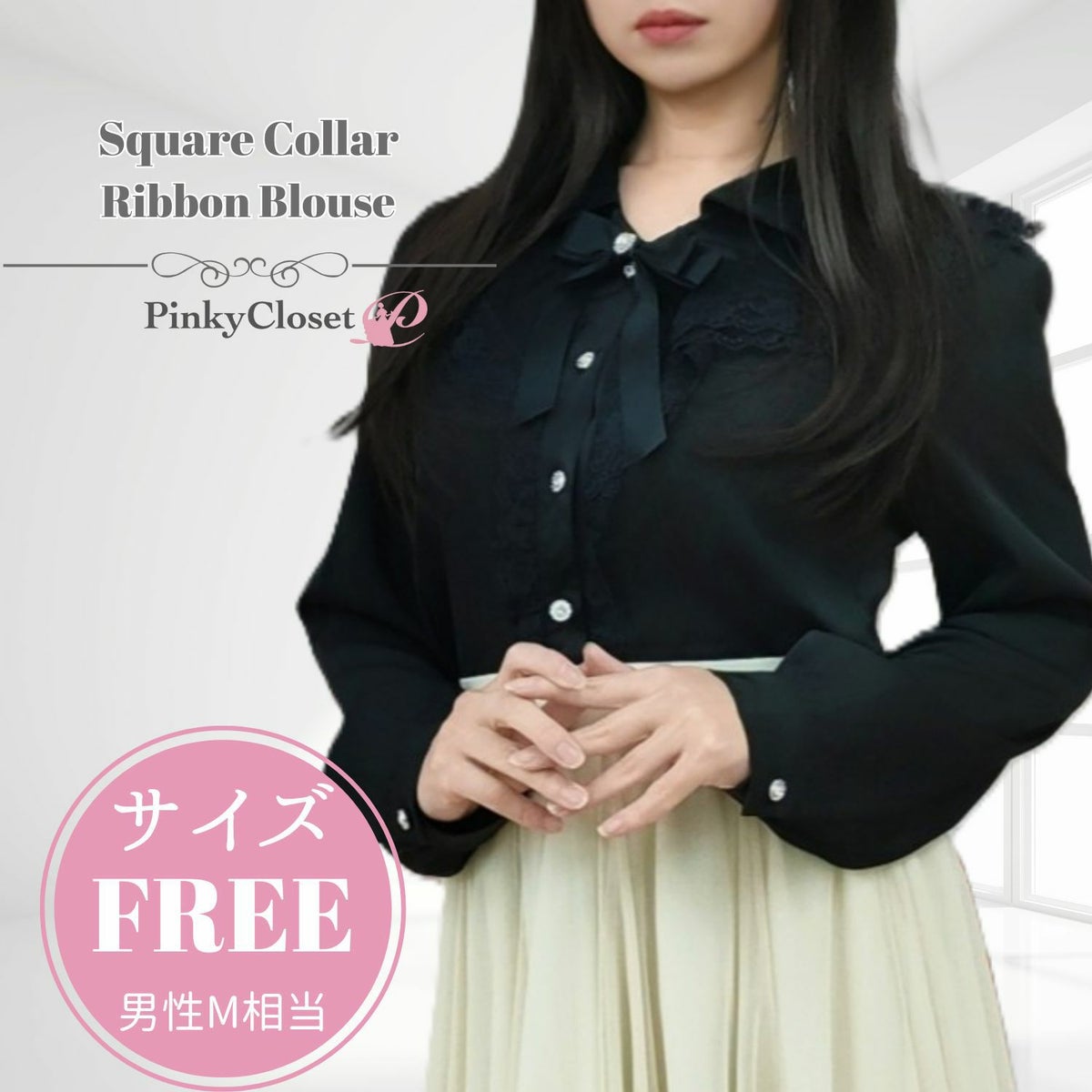 スクエアフリルカラーリボンブラウス 黒 フリーサイズ
