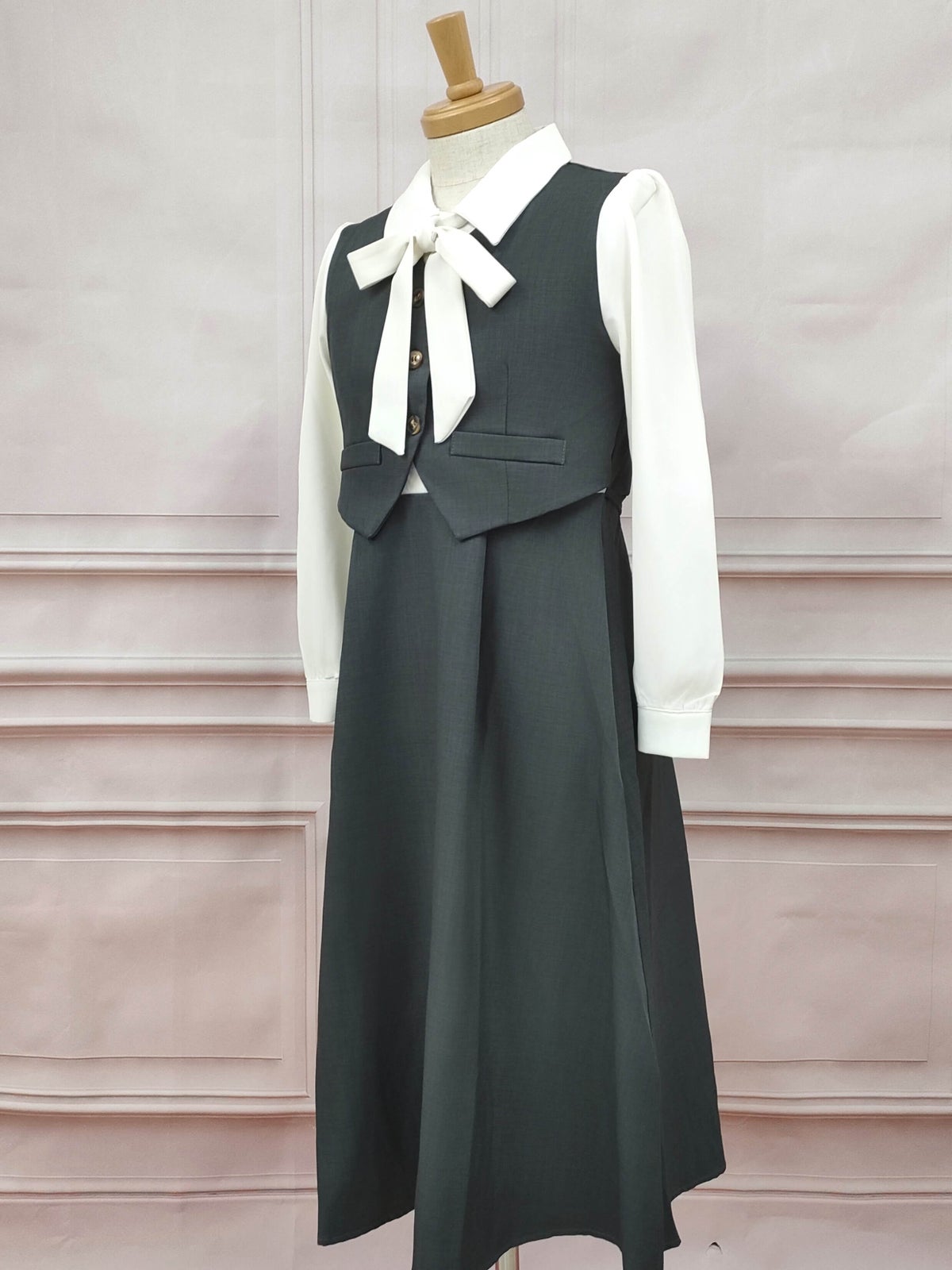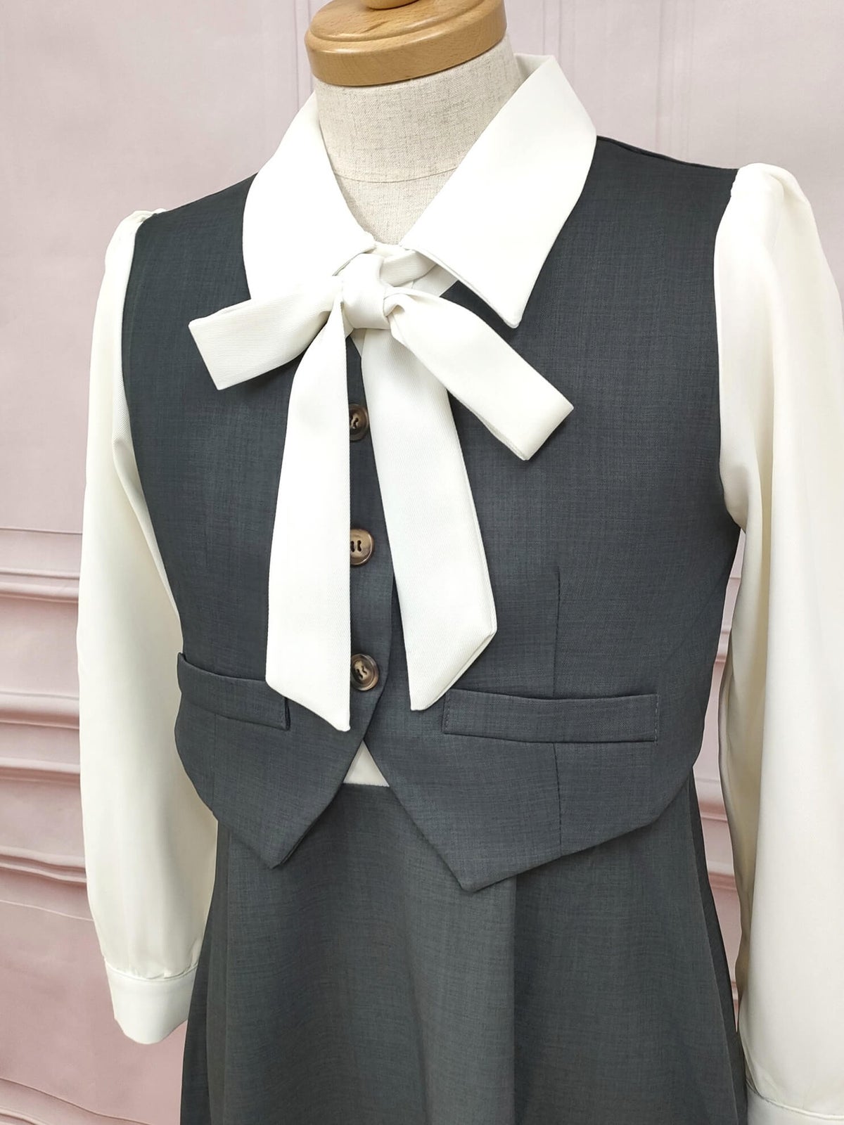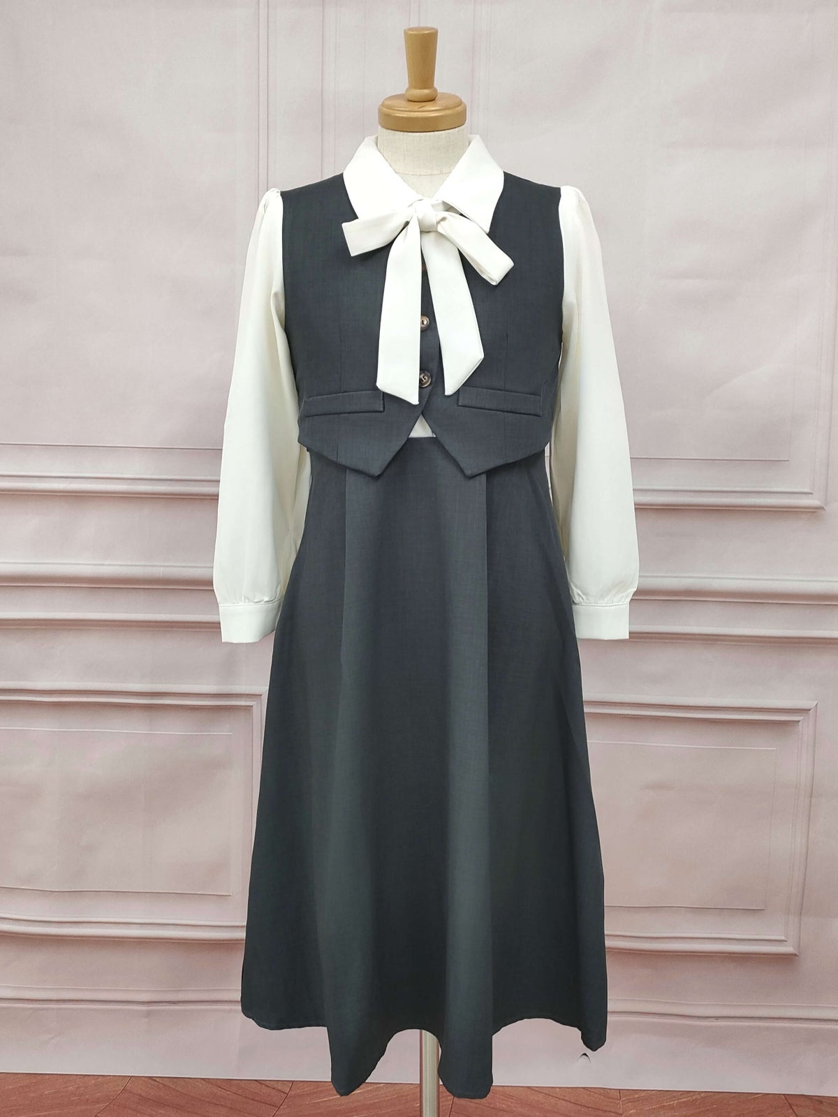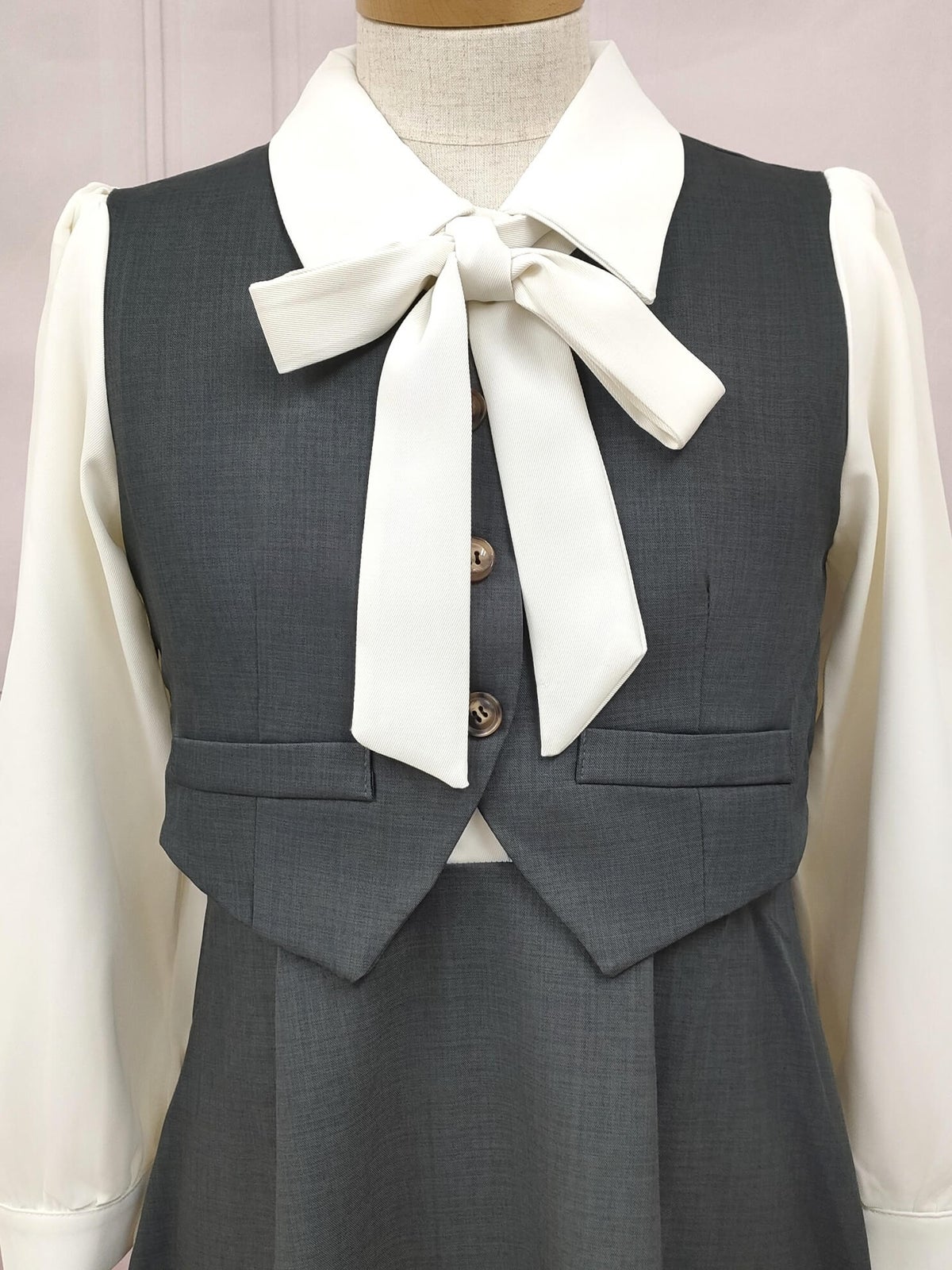 ボウタイセットアップ風ワンピース グレー フリーサイズ