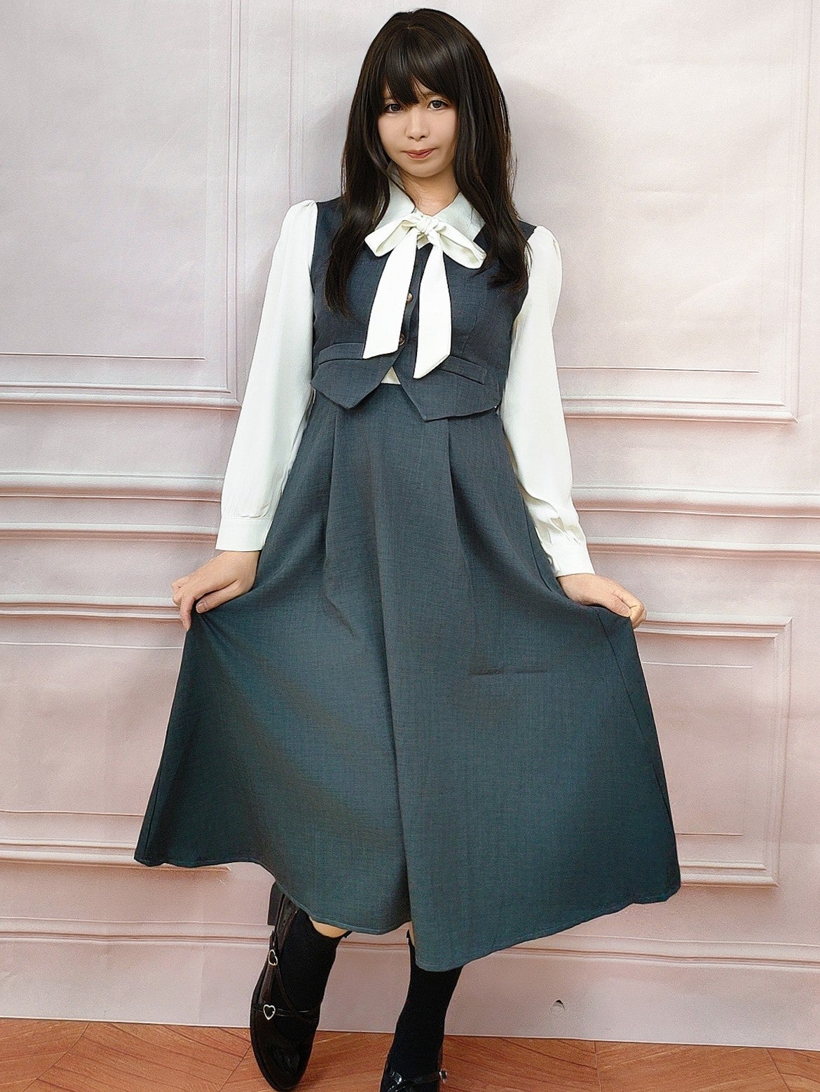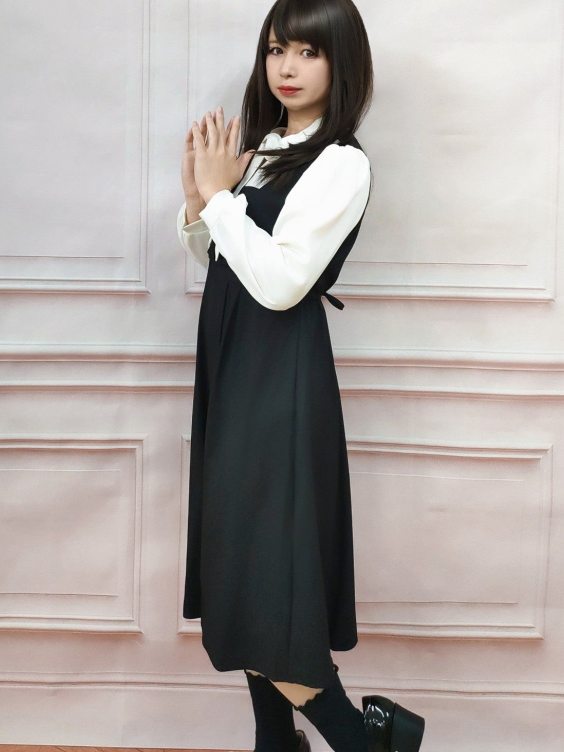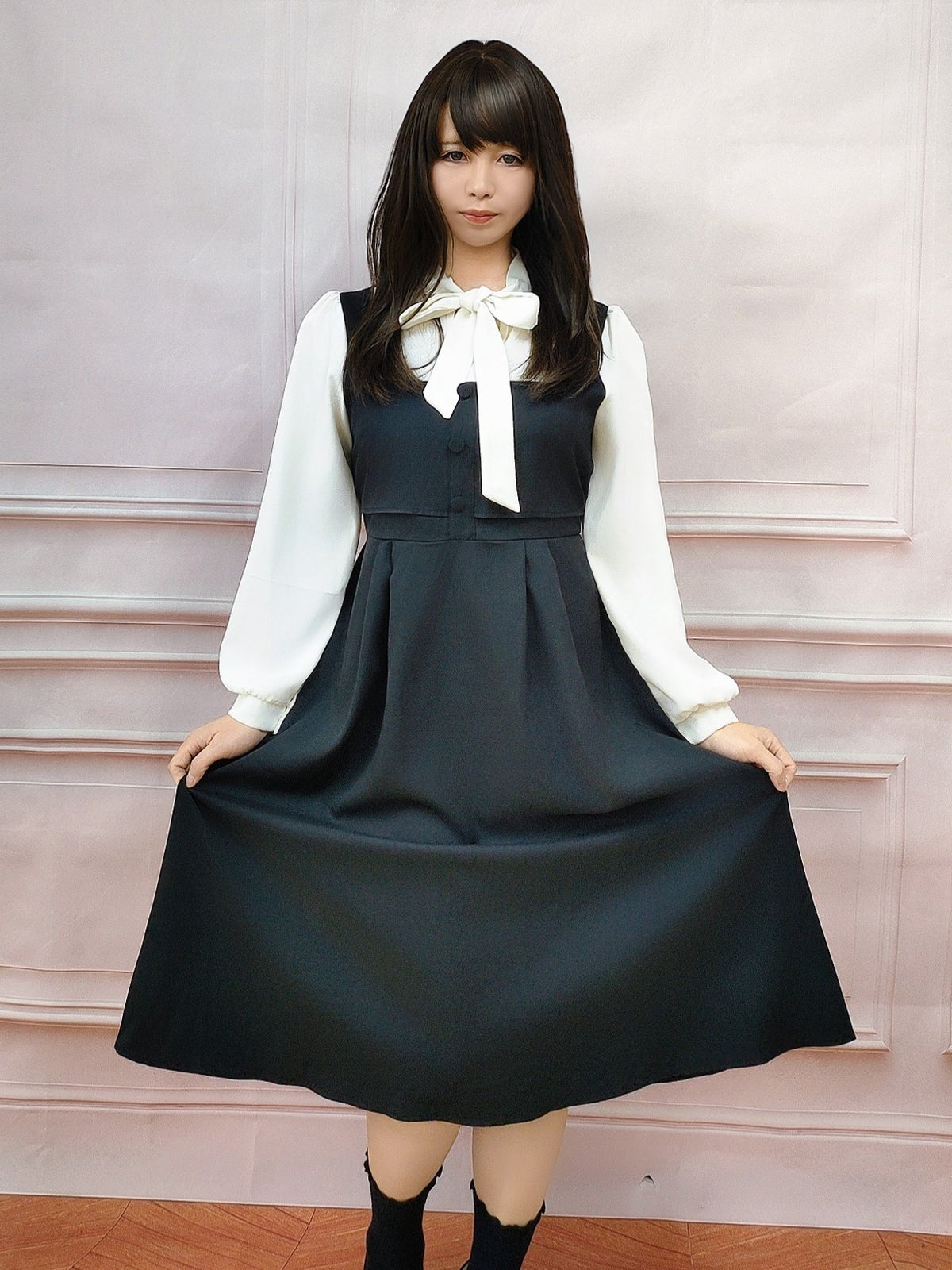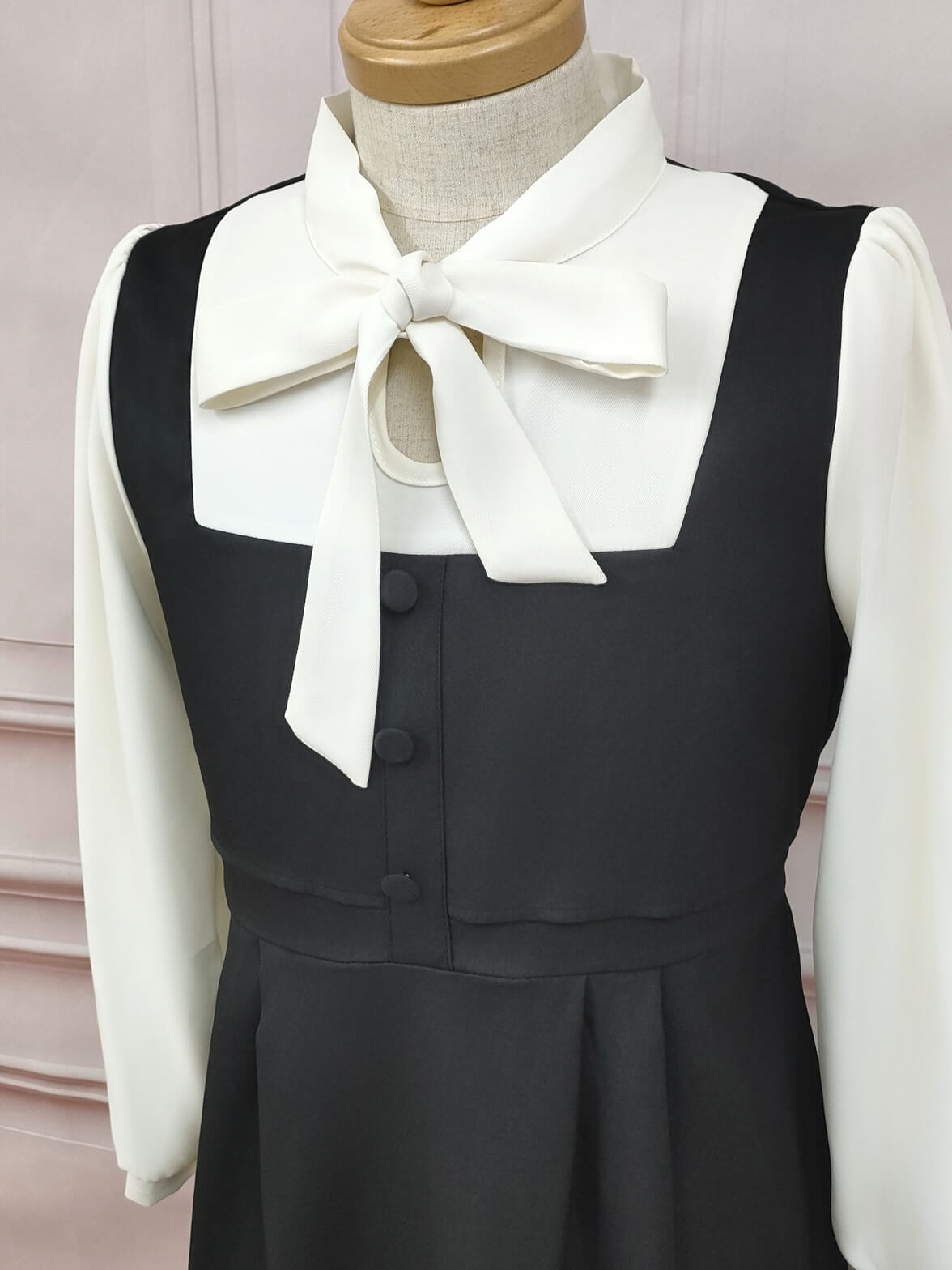 ボウタイジャンパースカート風ワンピース ブラック フリーサイズ