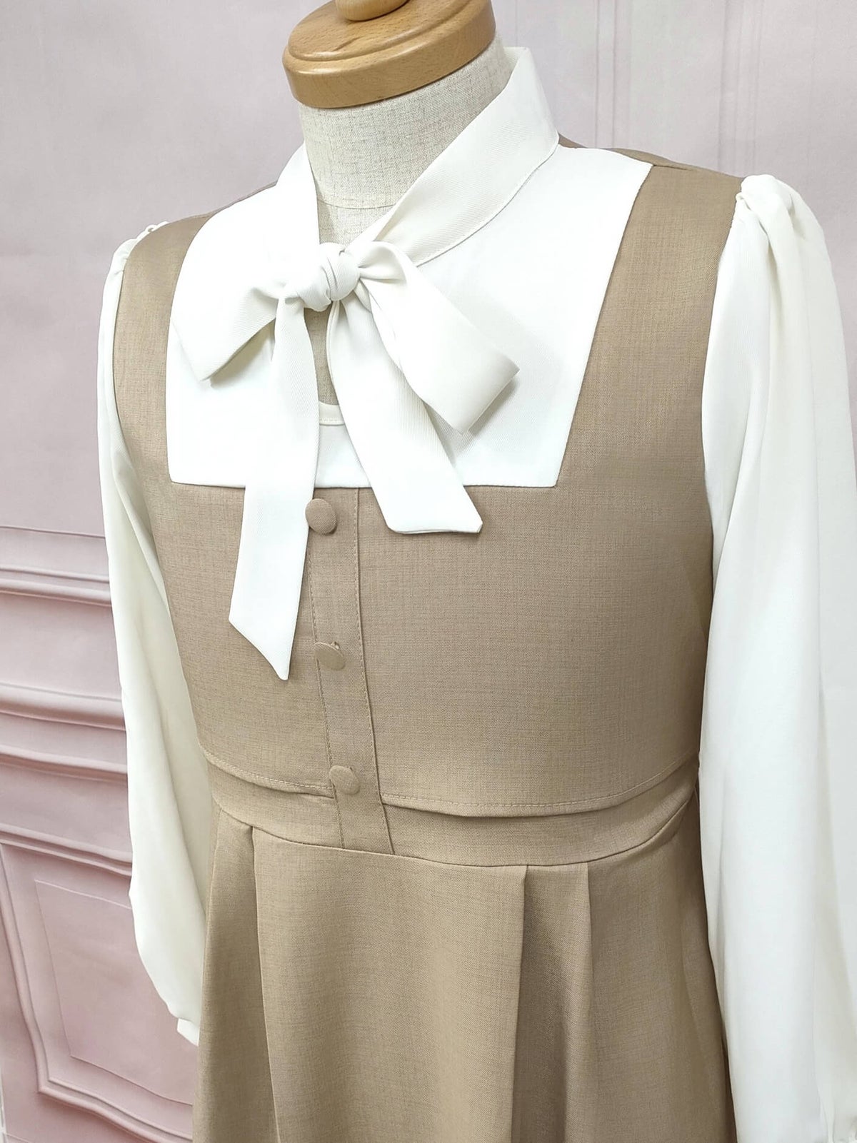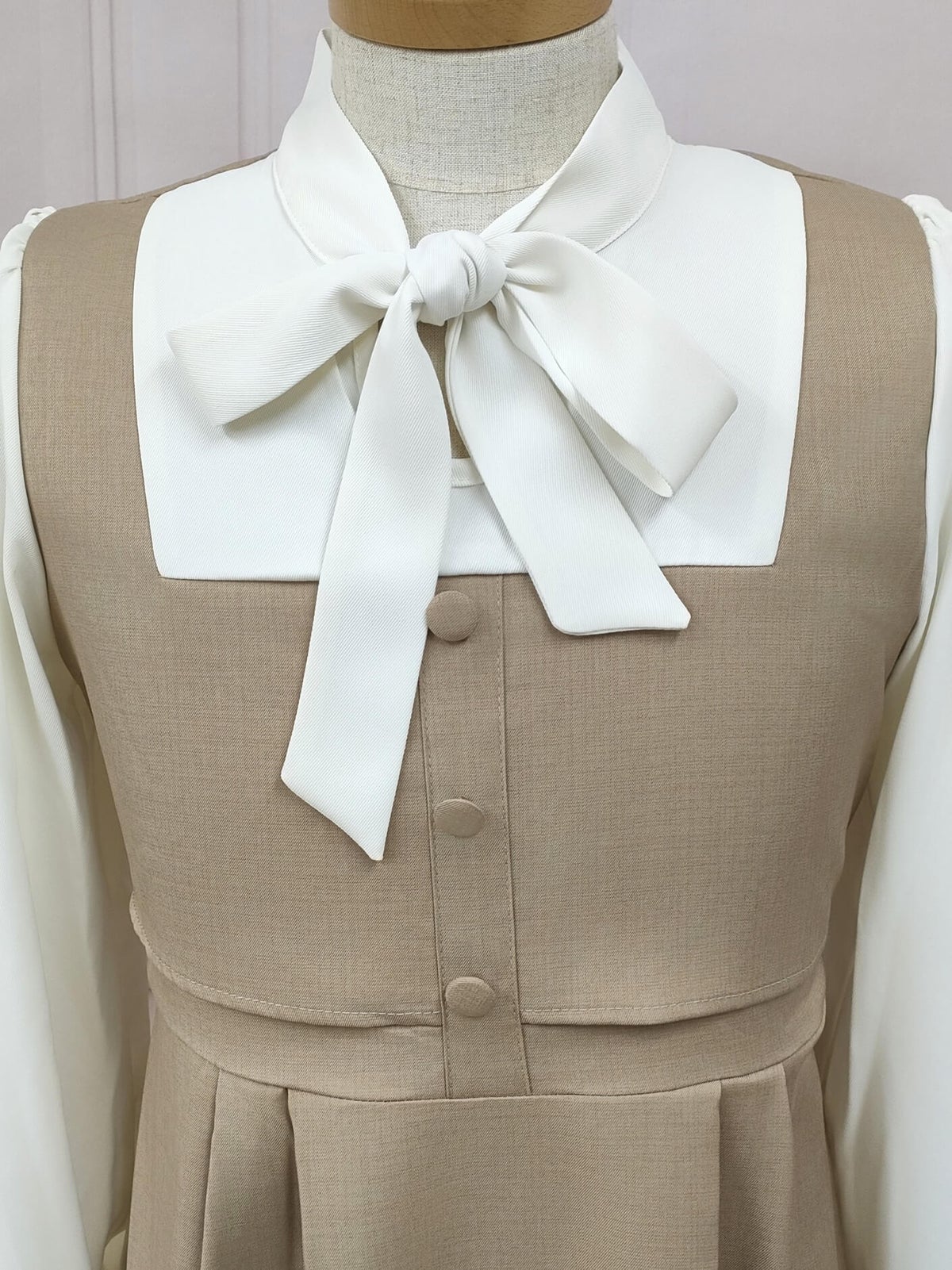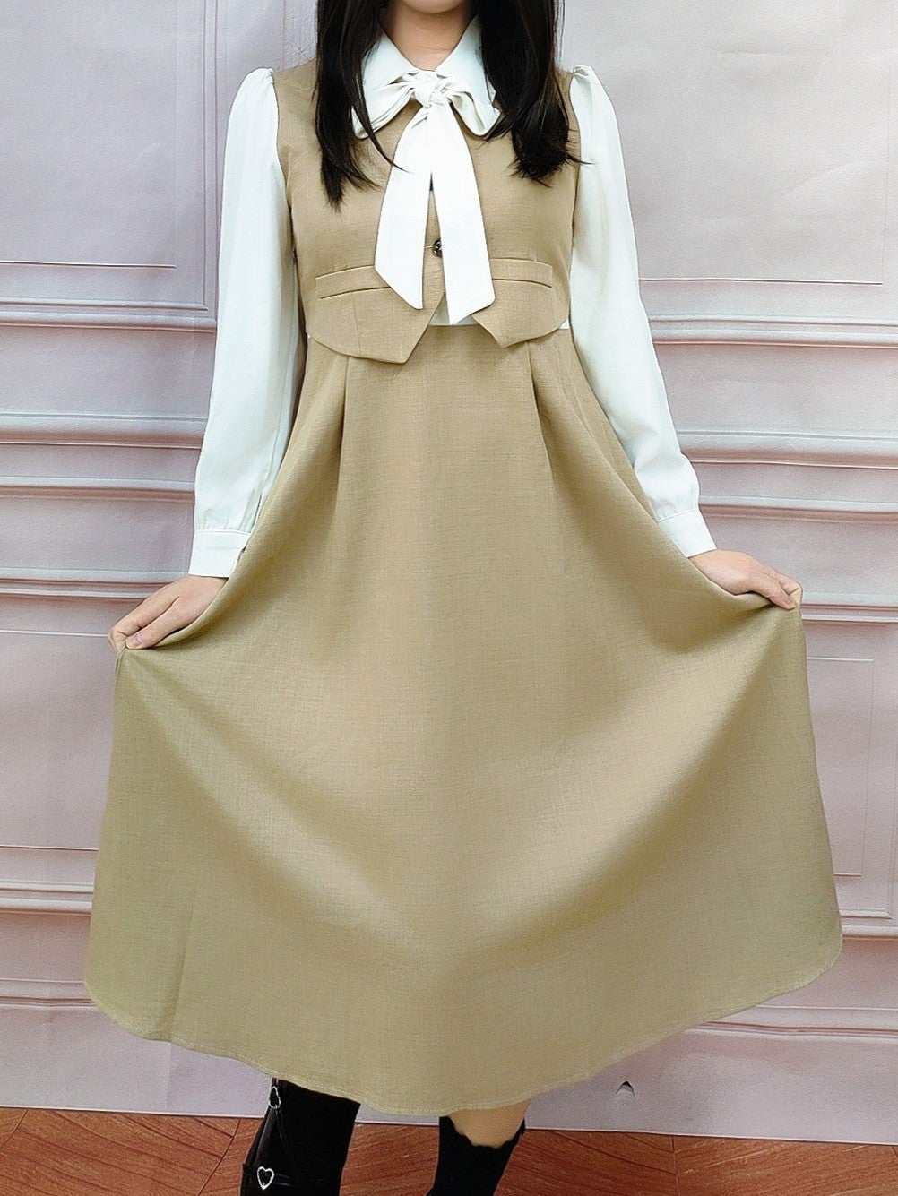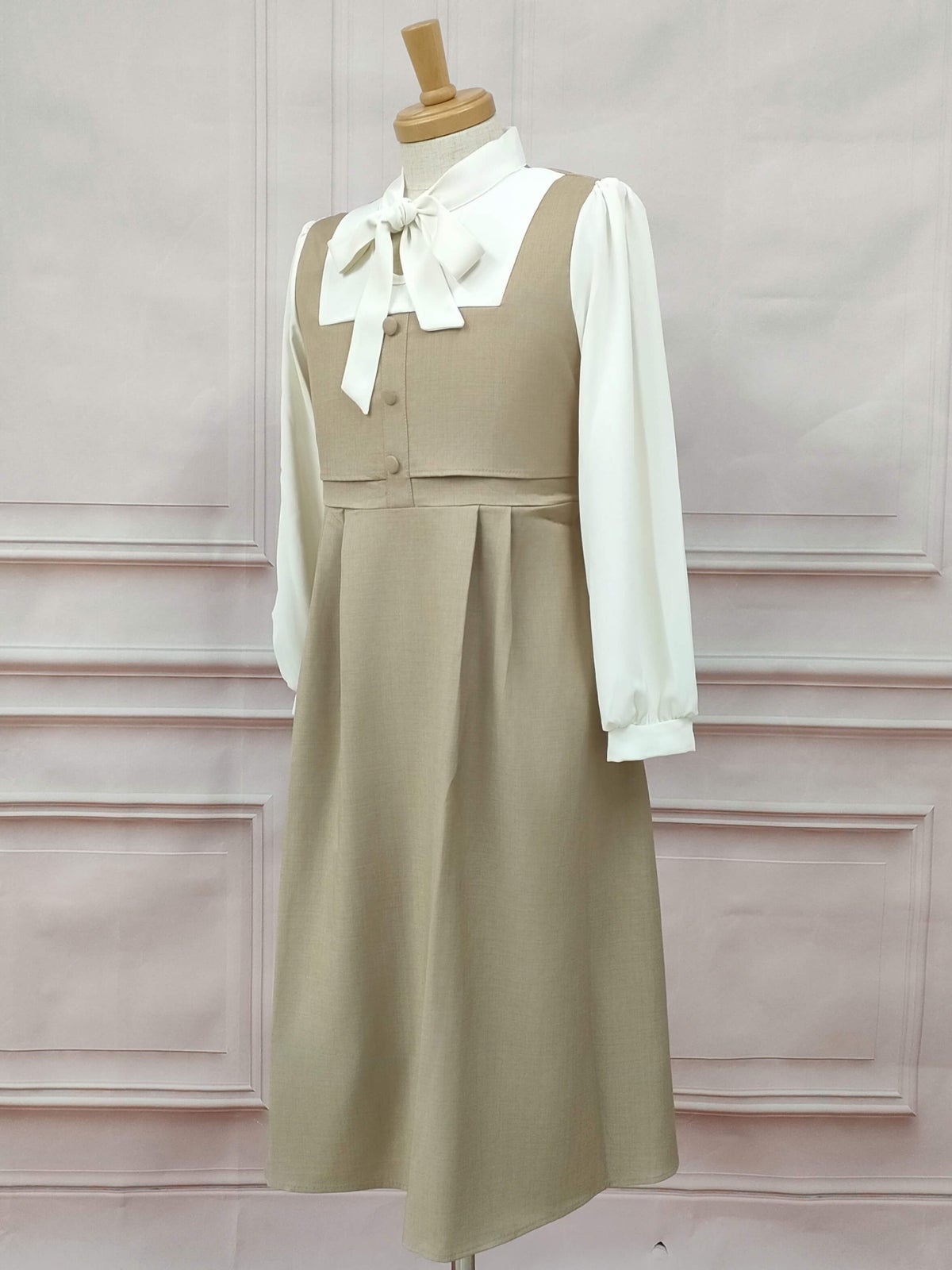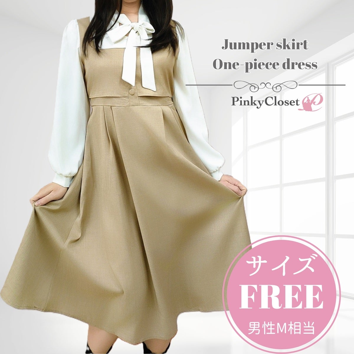 ボウタイジャンパースカート風ワンピース ブラウン フリーサイズ