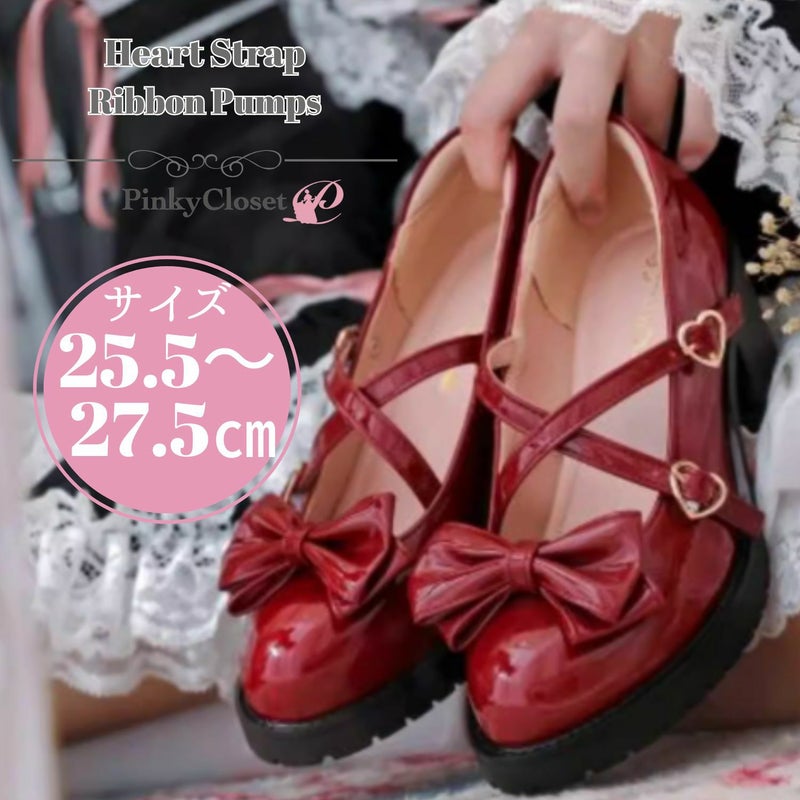 大きなリボンにハートの金具が可愛いキュートなパンプスで、