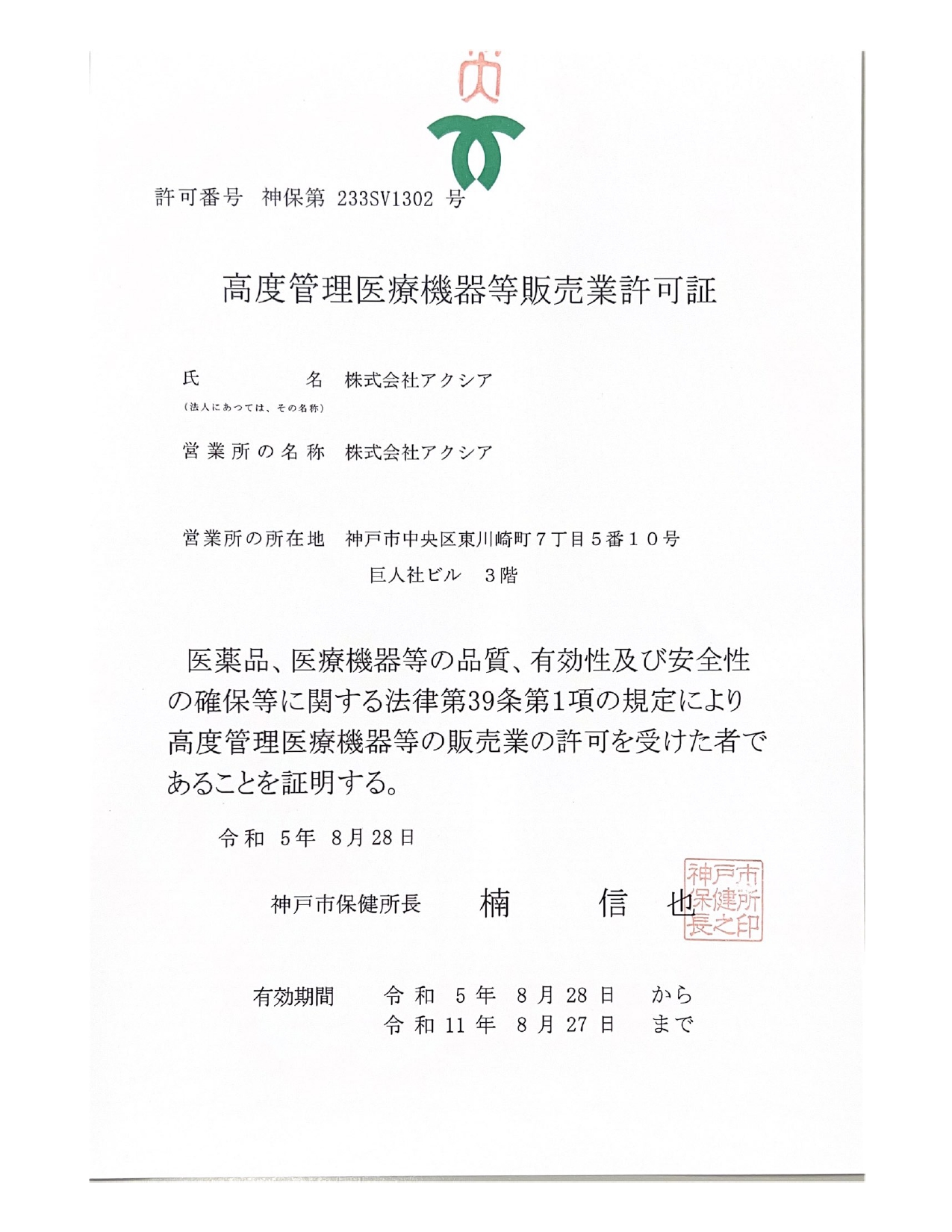 高度管理医療機器等販売業許可証